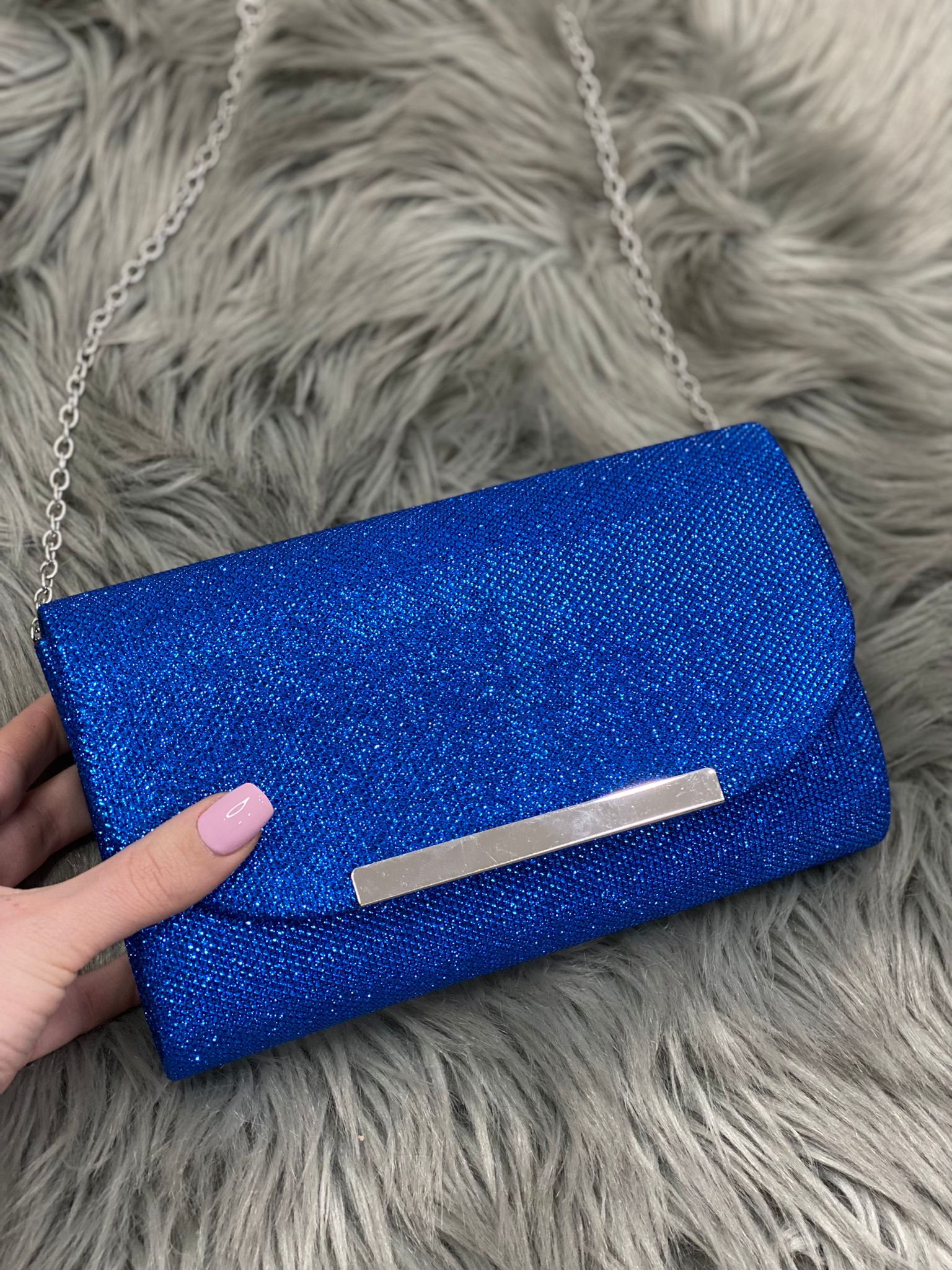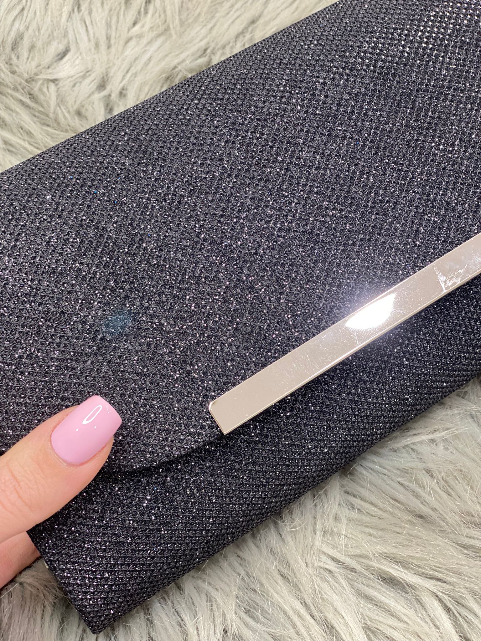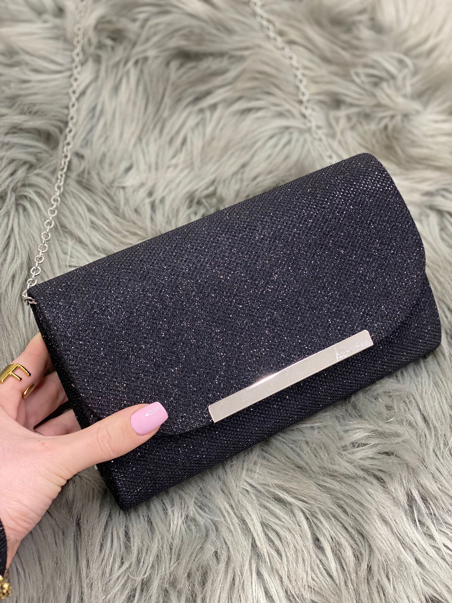 Pochette rettangolare glitterata, tracolla in catena removibile e chiusura magnetica.