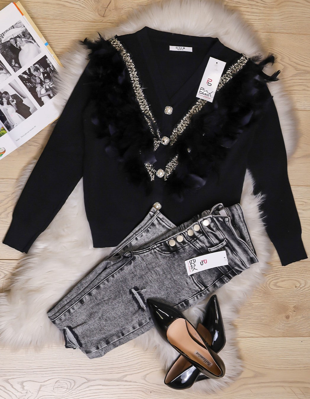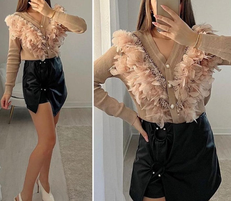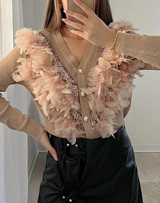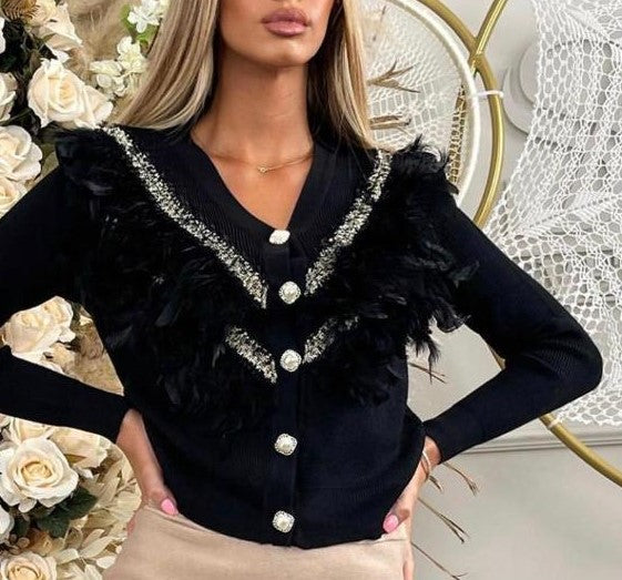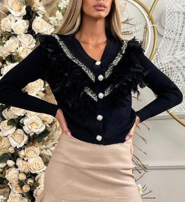 Cardigan viscosa con ricamo in rilievo, piume e bottoni con perla sintetica. Fabbricato all'estero.