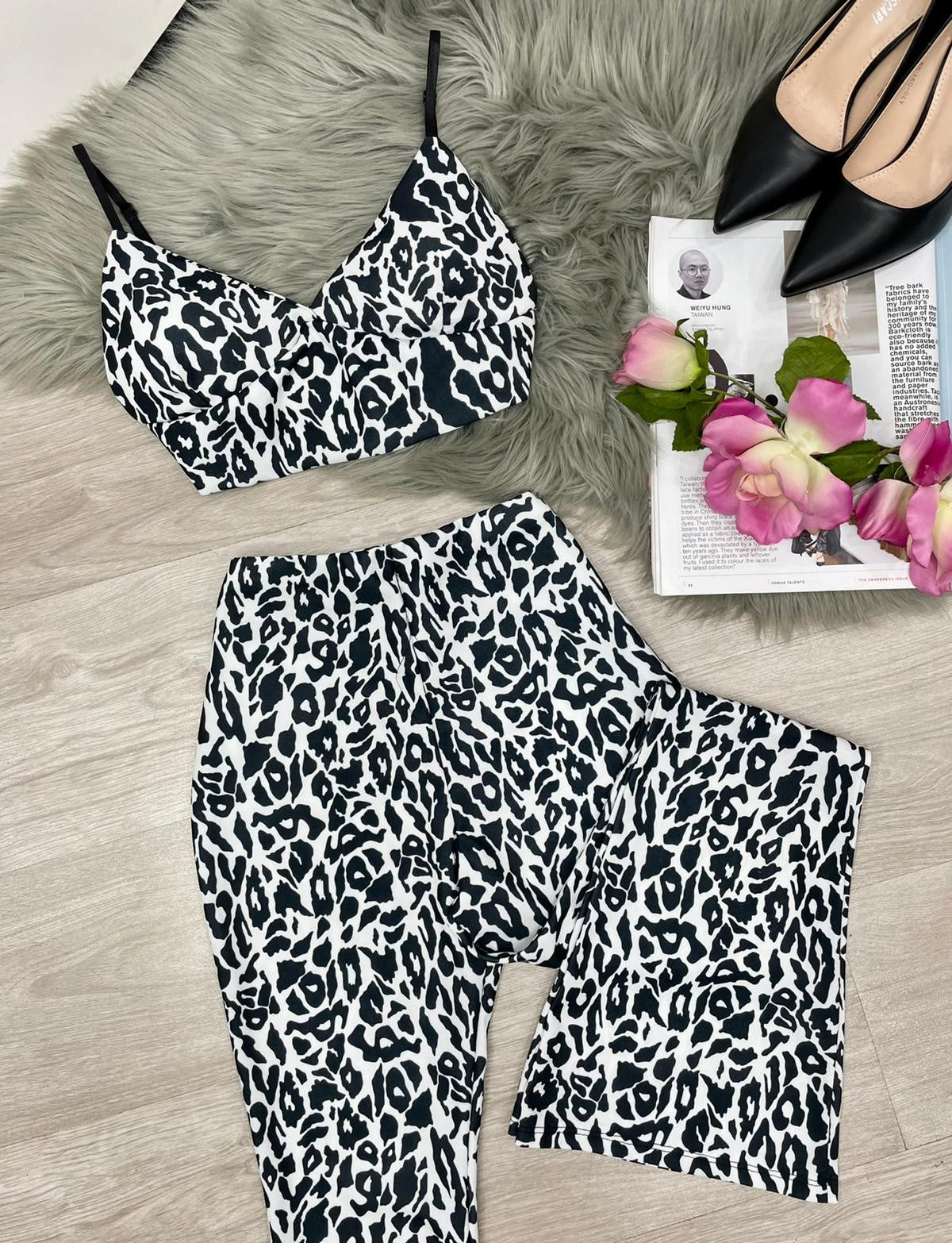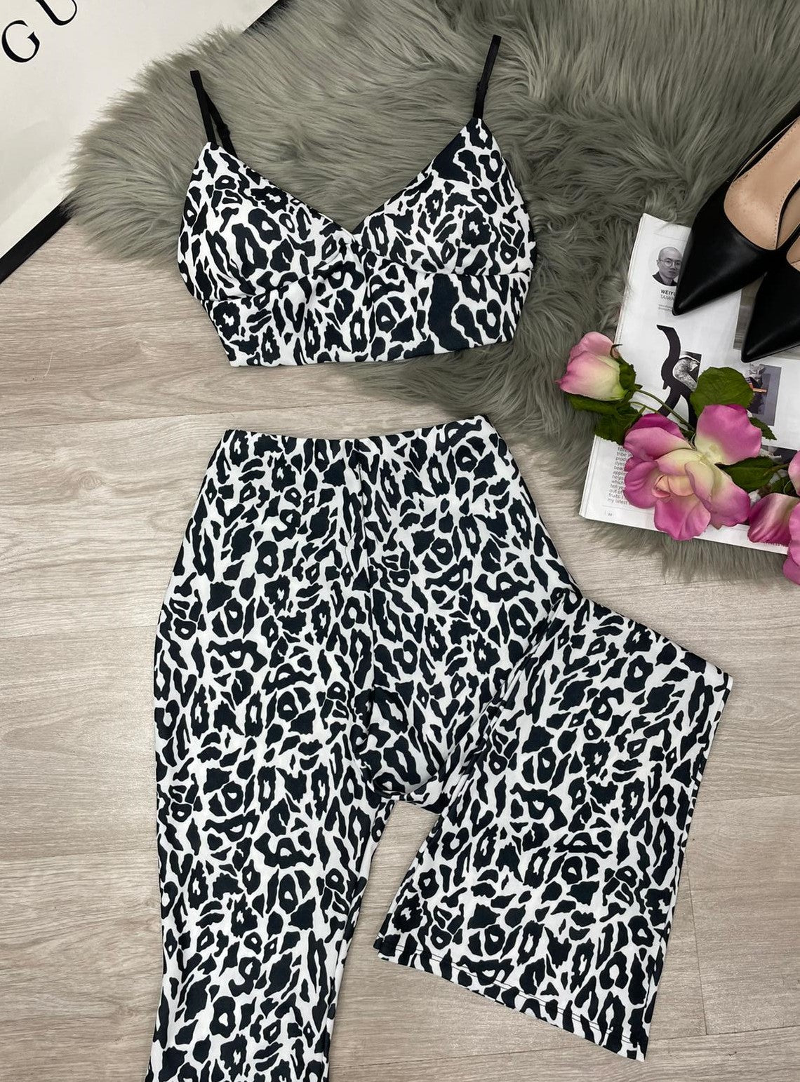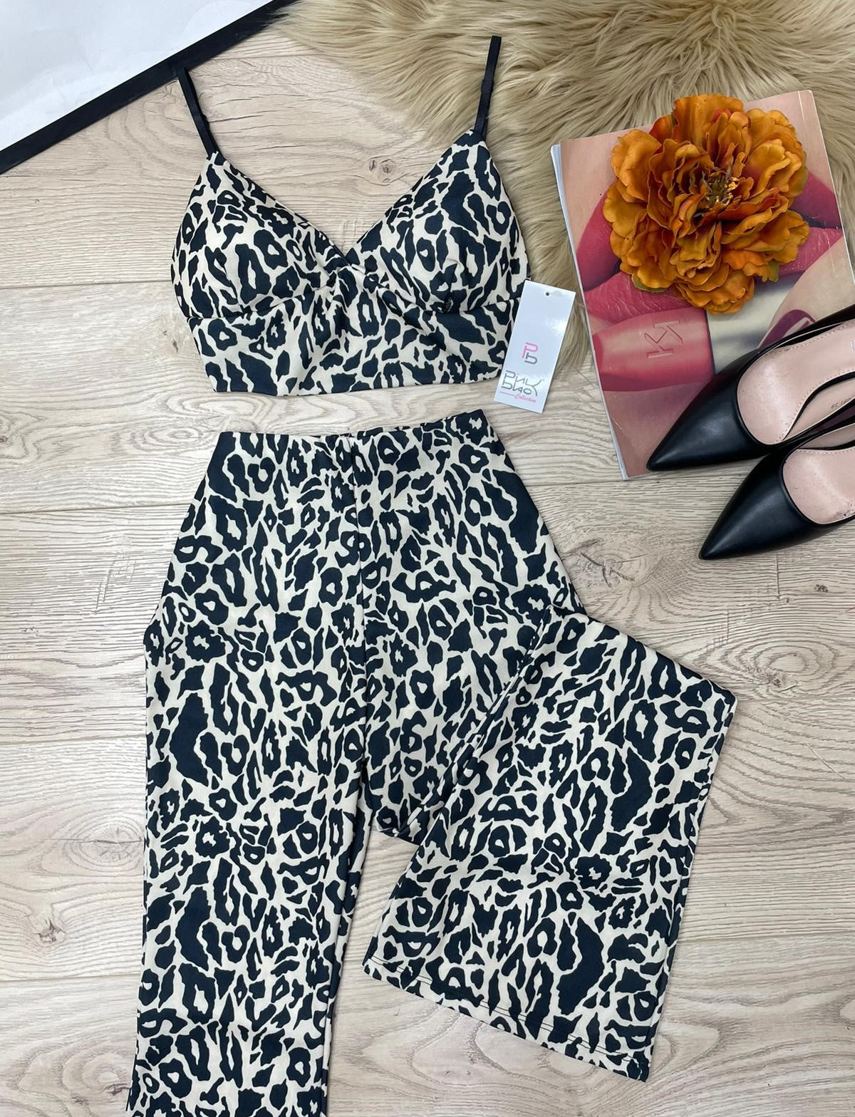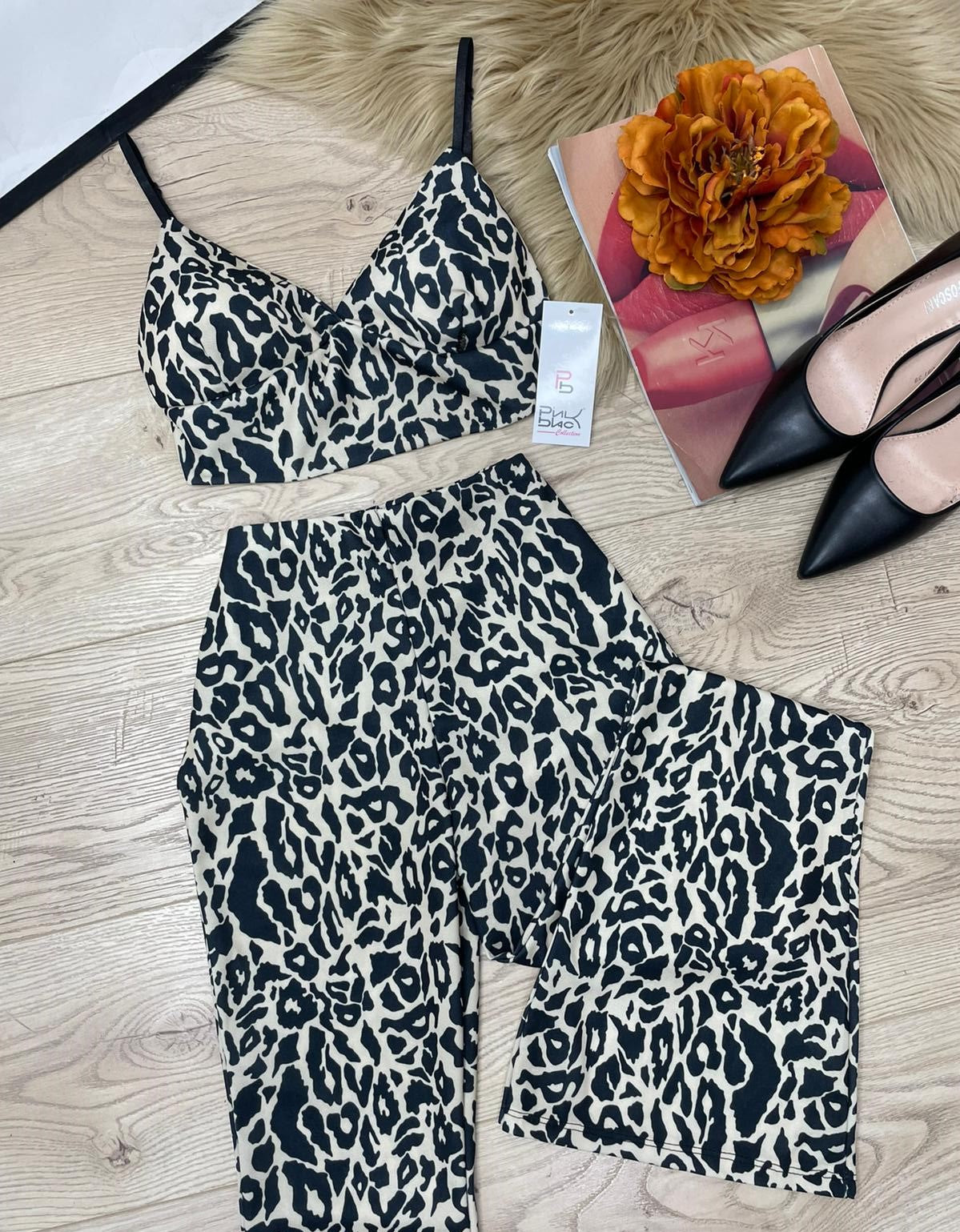 Completo tessuto scuba crepe con fantasia animalier. Top con fascia elastica sul retro e coppe preformate e pantalone a zampa. Fabbricato in Italia.