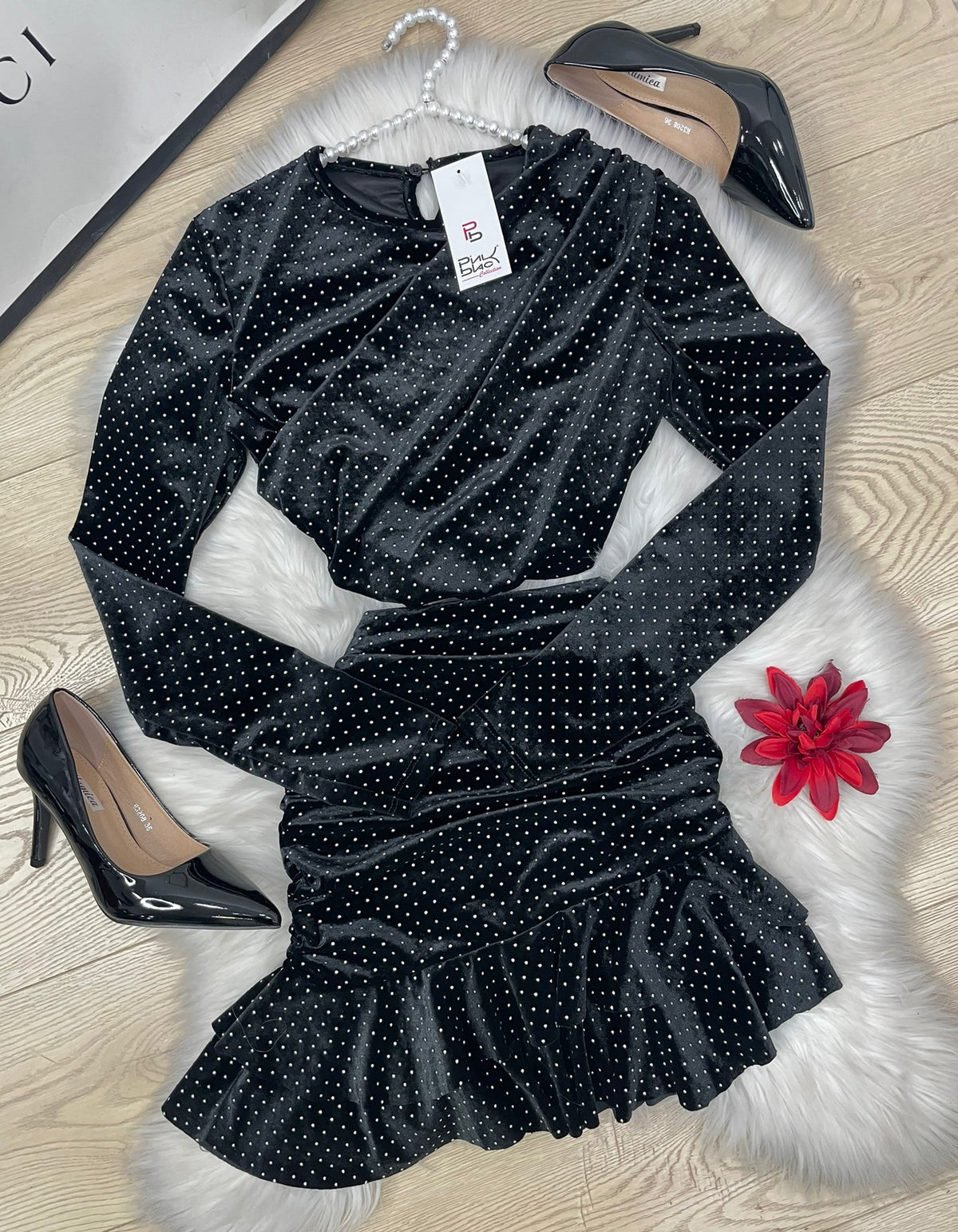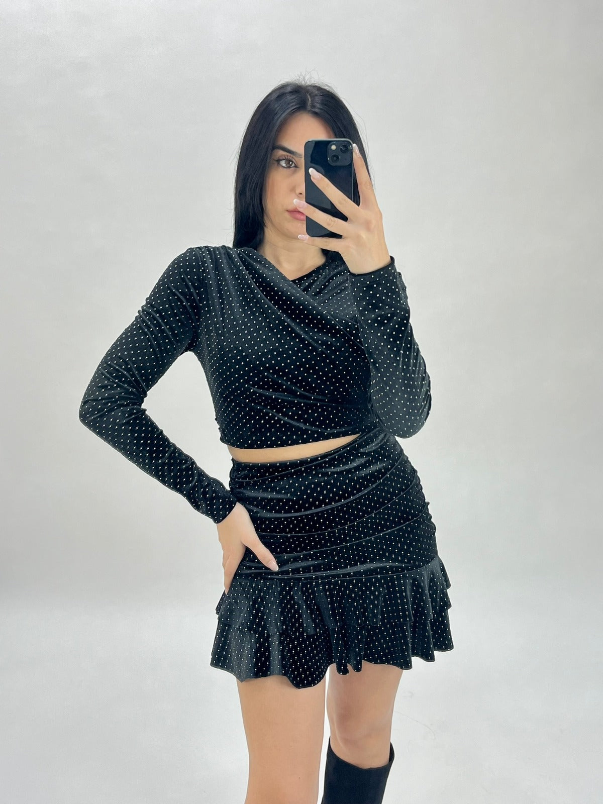Completo in ciniglia con applicazione di borchiette, maglia corta e gonna con drappeggio, elastico in vita e balza. Fabbricato in Italia.
