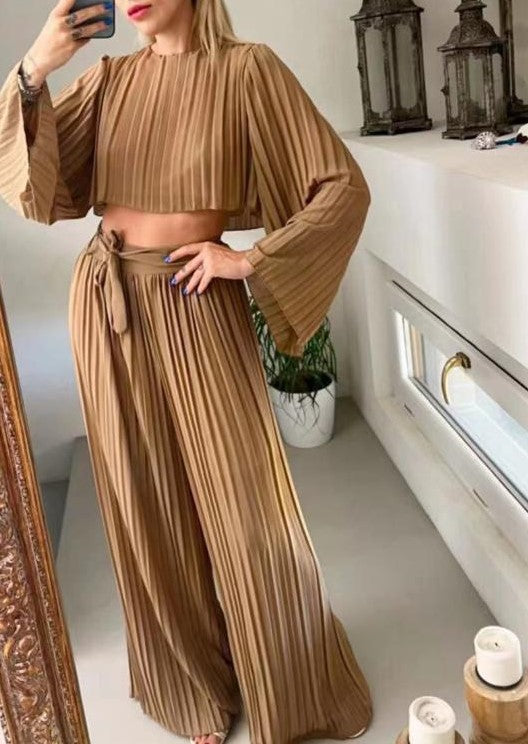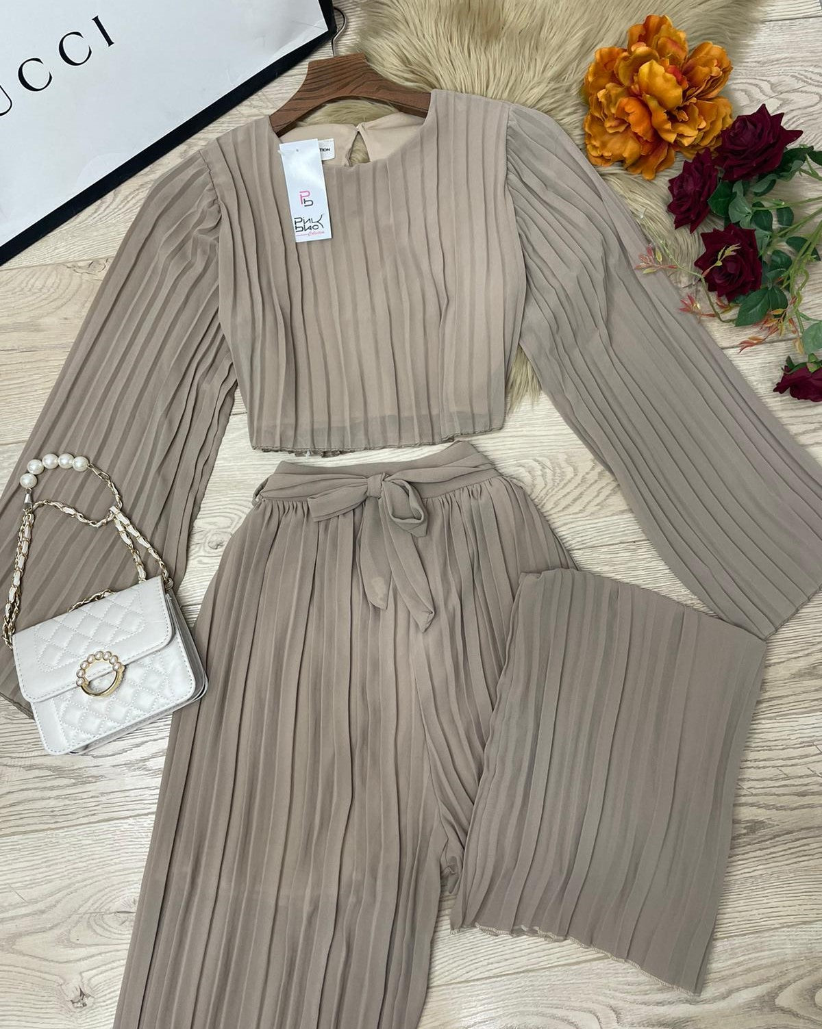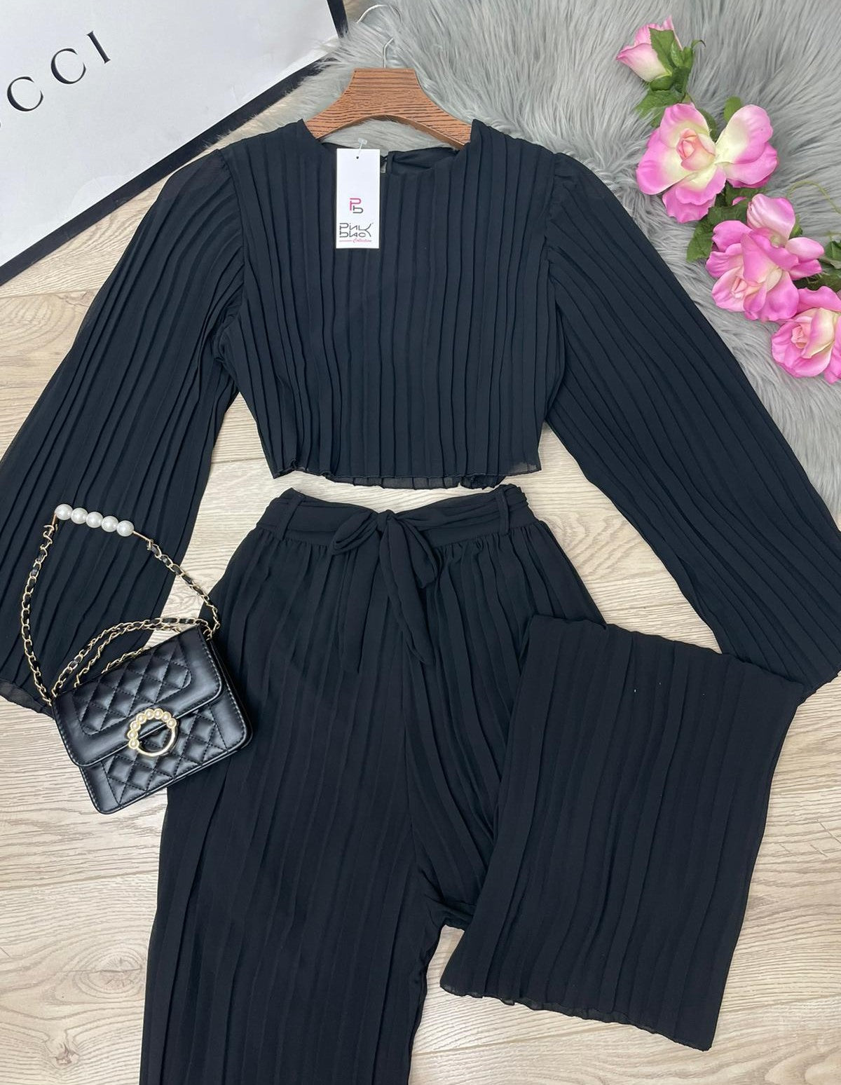 Completo in chiffon plissè. Maglia corta e pantalone palazzo con elastico in vita e cintura inclusa. Fabbricato in Italia.