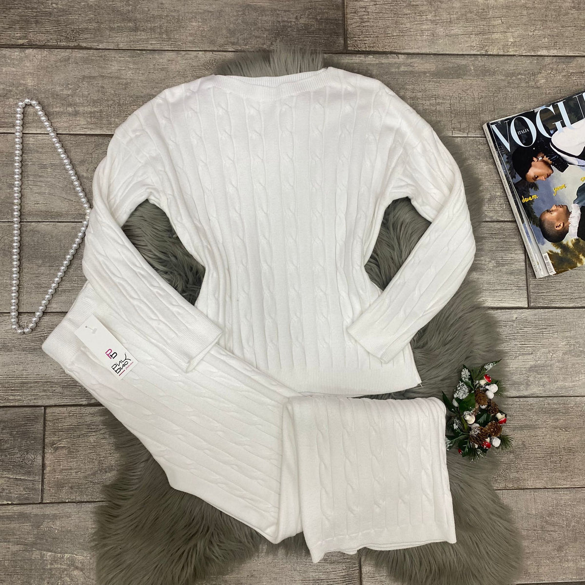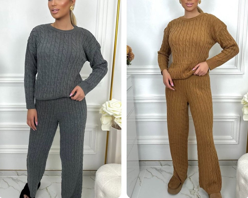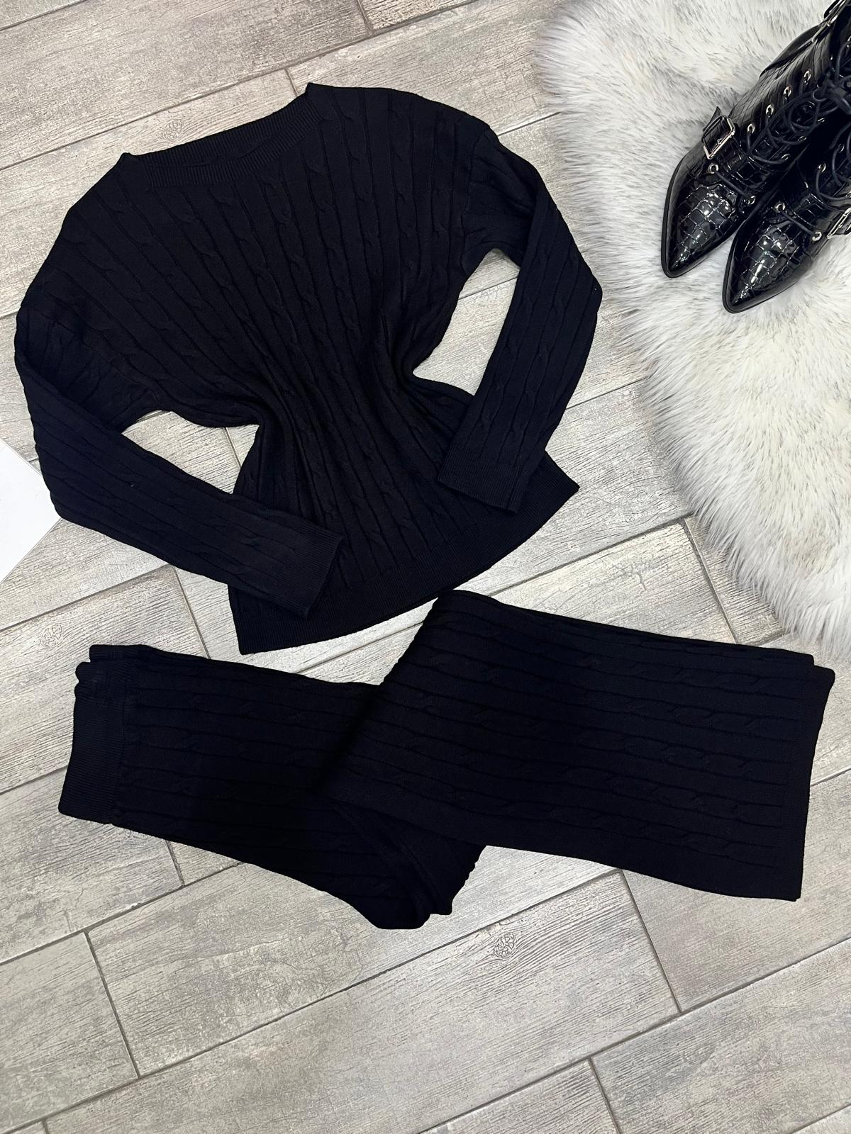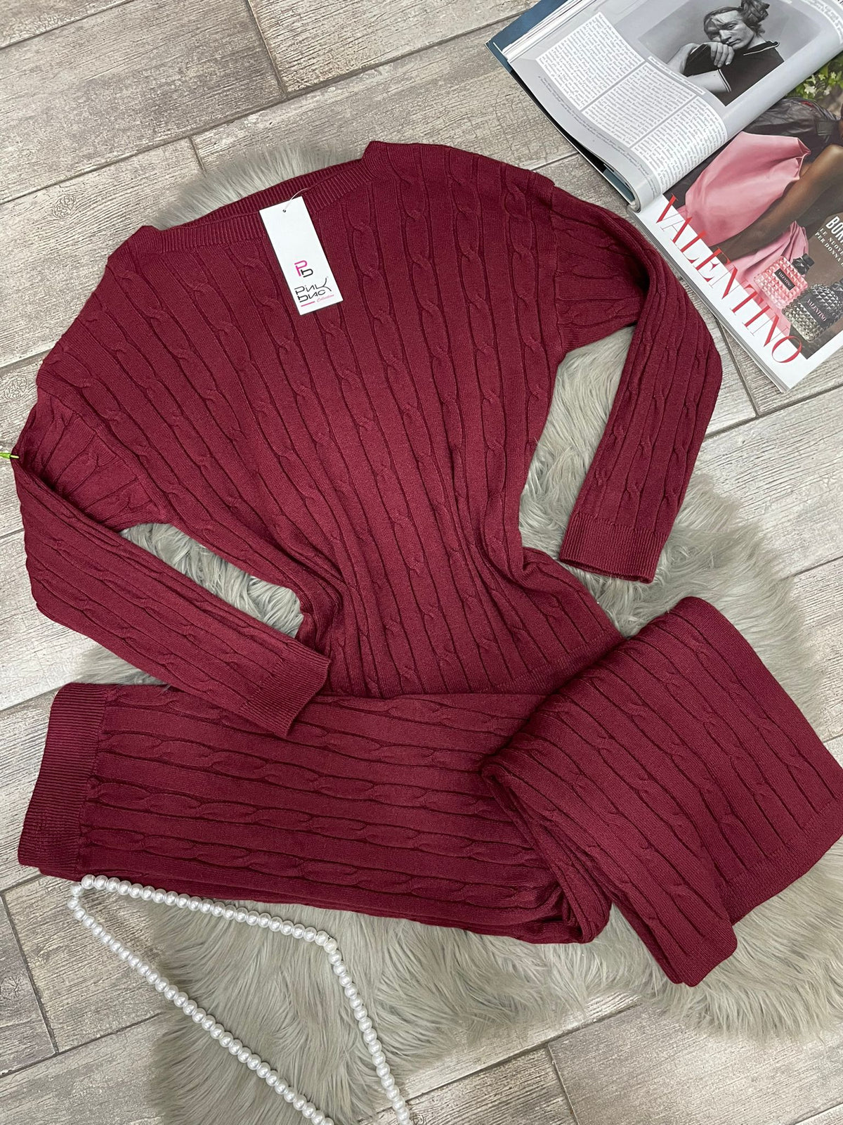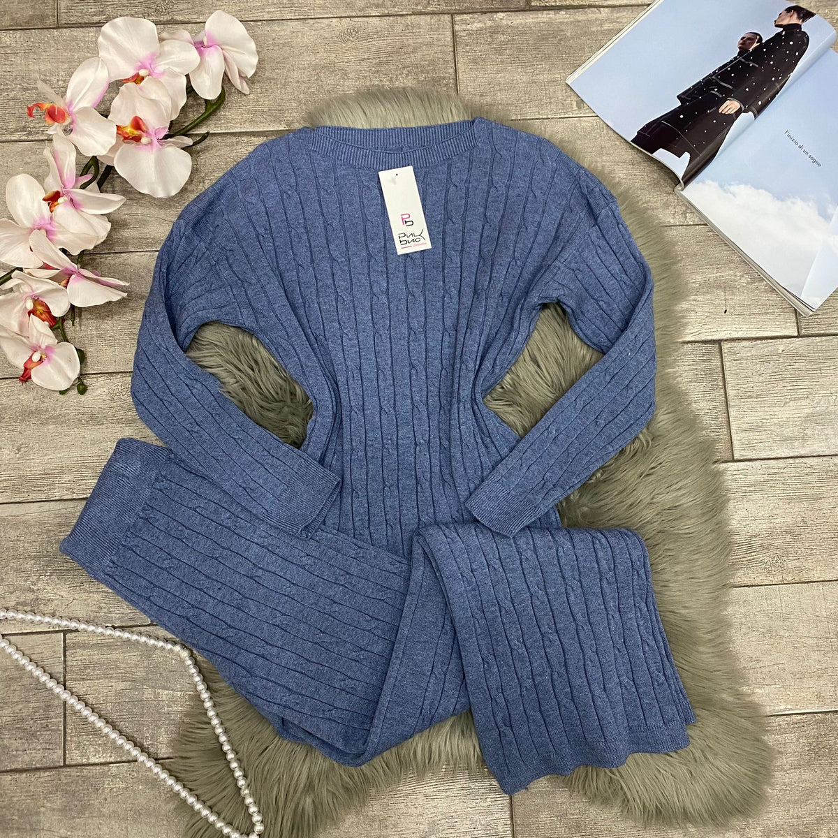 Coordinato con maglioncino e pantalone elasticizzati con motivo ad intreccio.