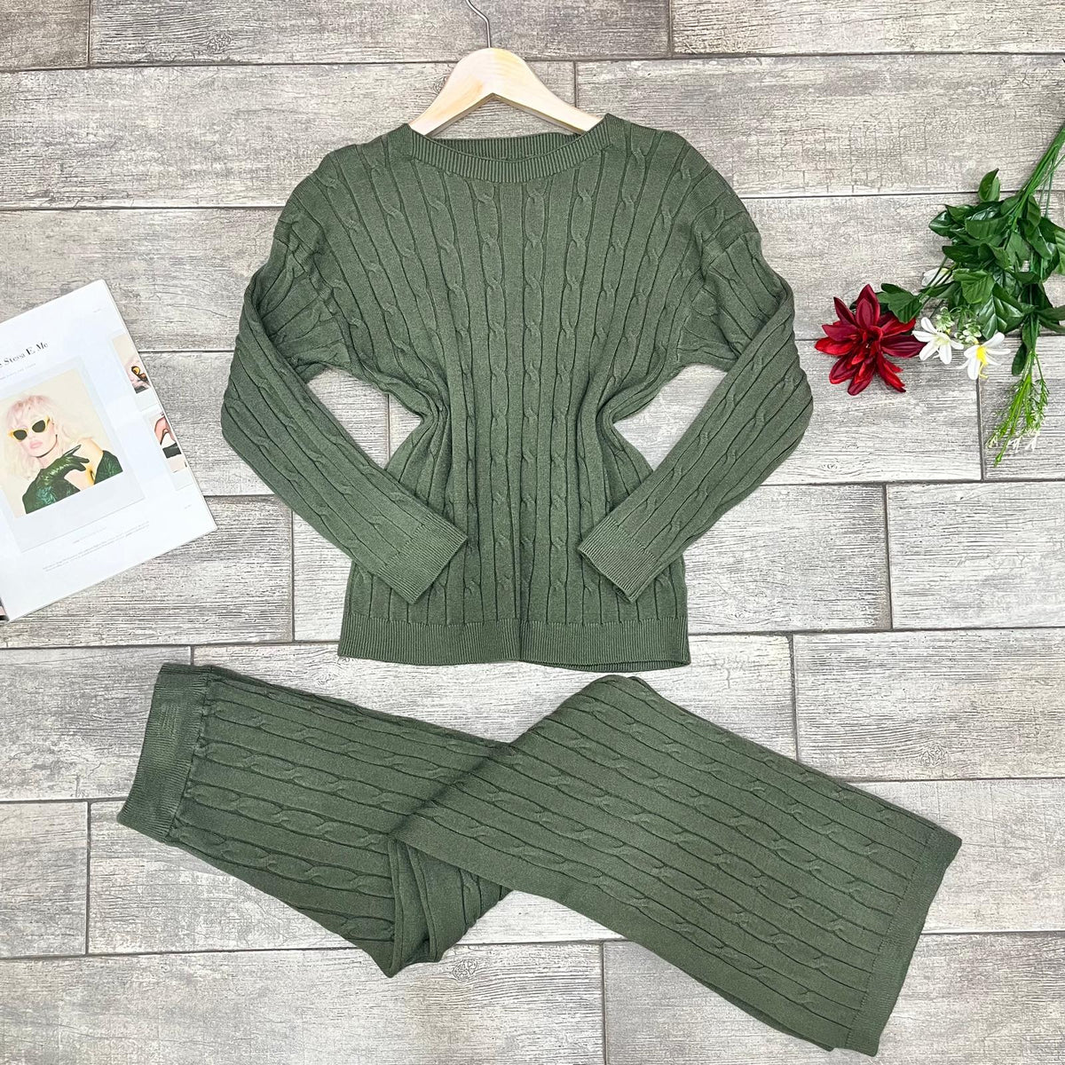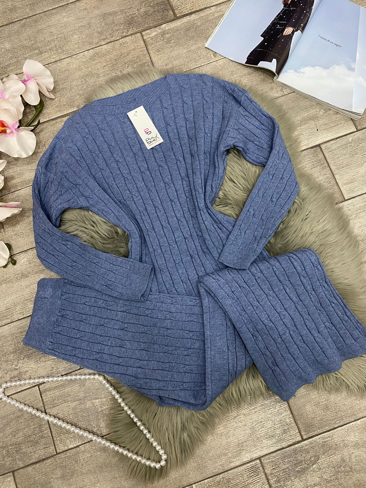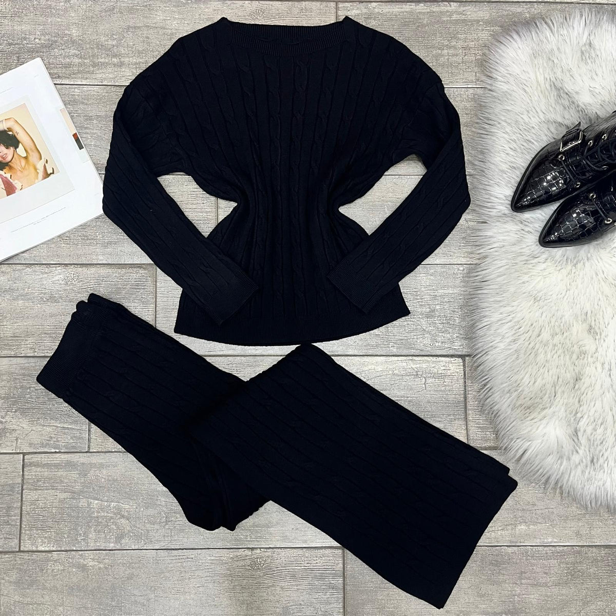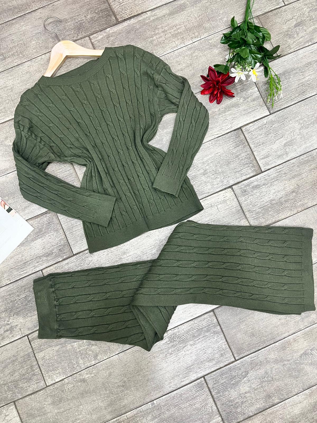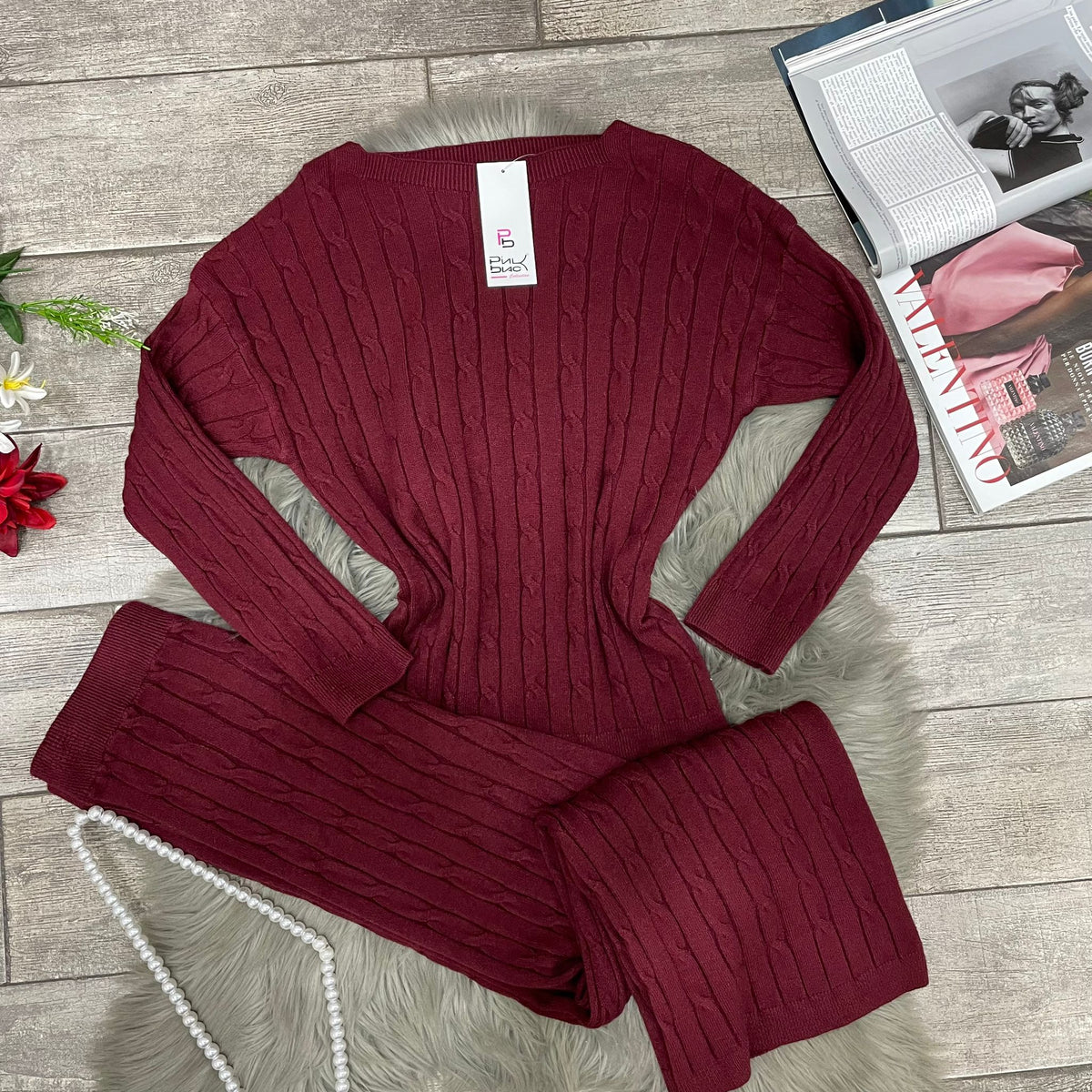 Coordinato con maglioncino e pantalone elasticizzati con motivo ad intreccio.