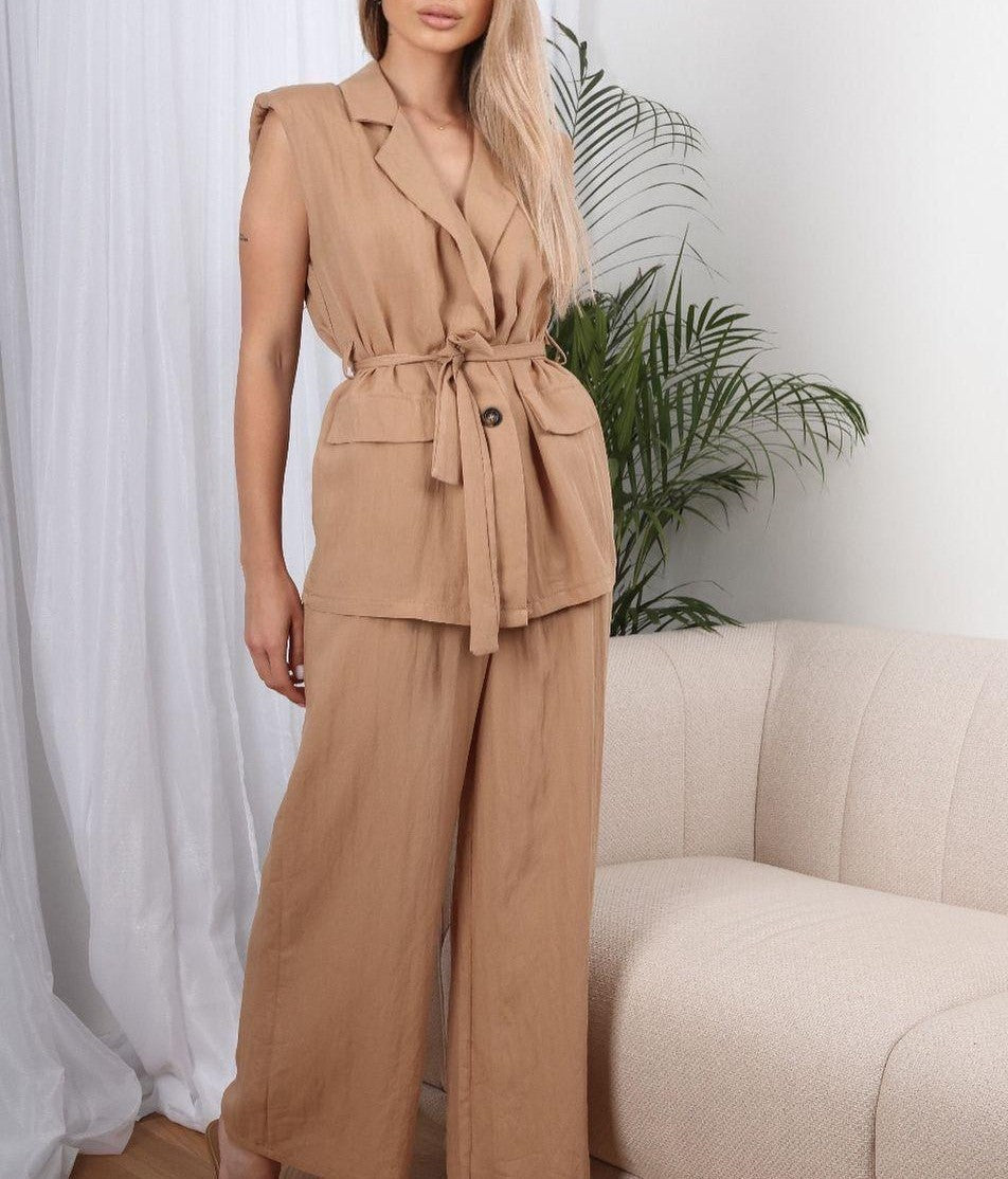 Set 2 pezzi effetto lino con camicia con chiusura con bottoni e tasche estetiche , pantalone largo con elastico in vita Fabbricato in Italia.