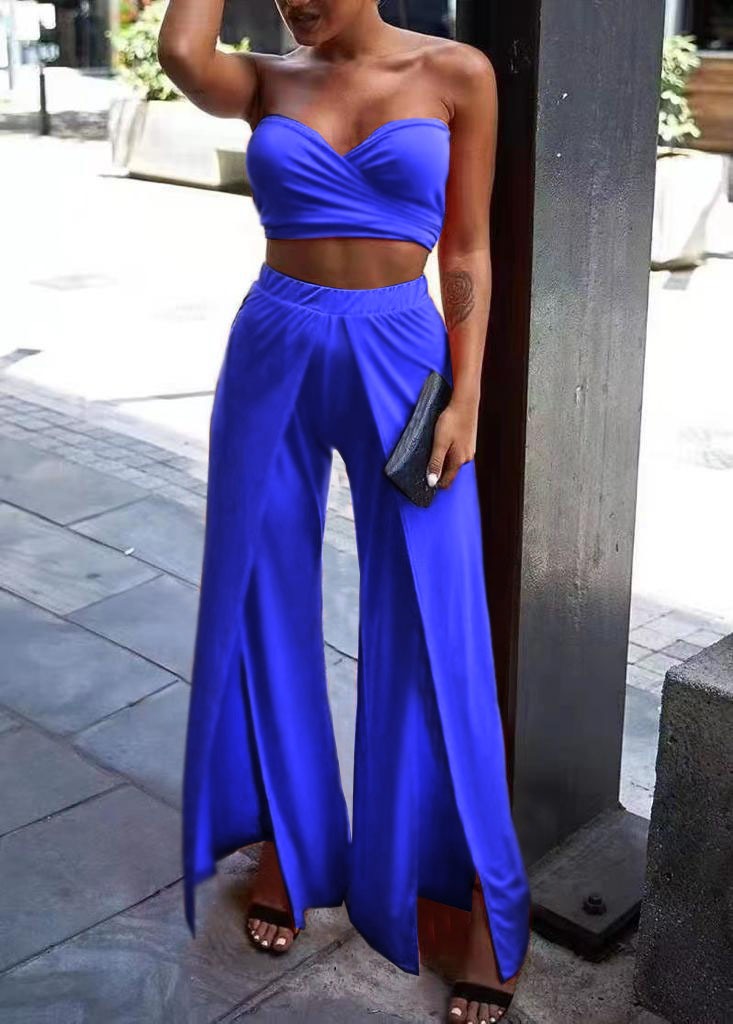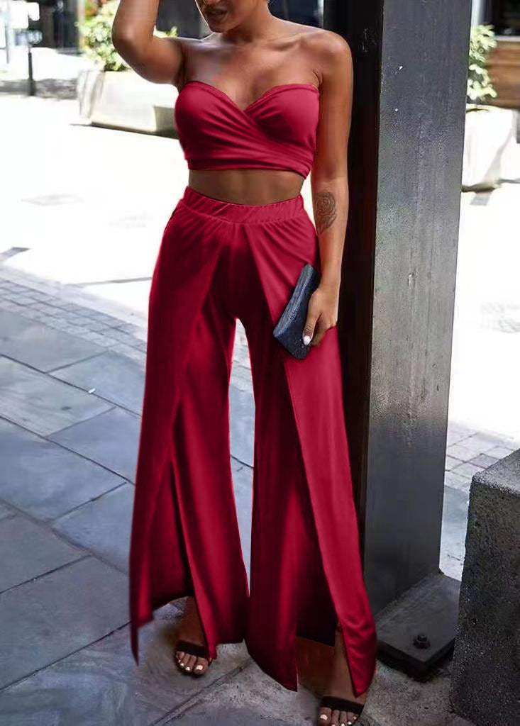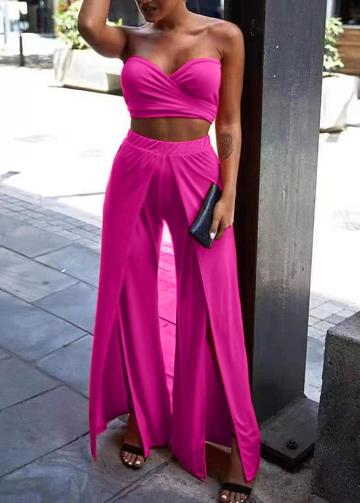 Completo in viscosa, top a fascia con coppe preformate e allacciatura a fiocco e pantalone palazzo con elastico in vita e spacchi. Fabbricato in Italia.