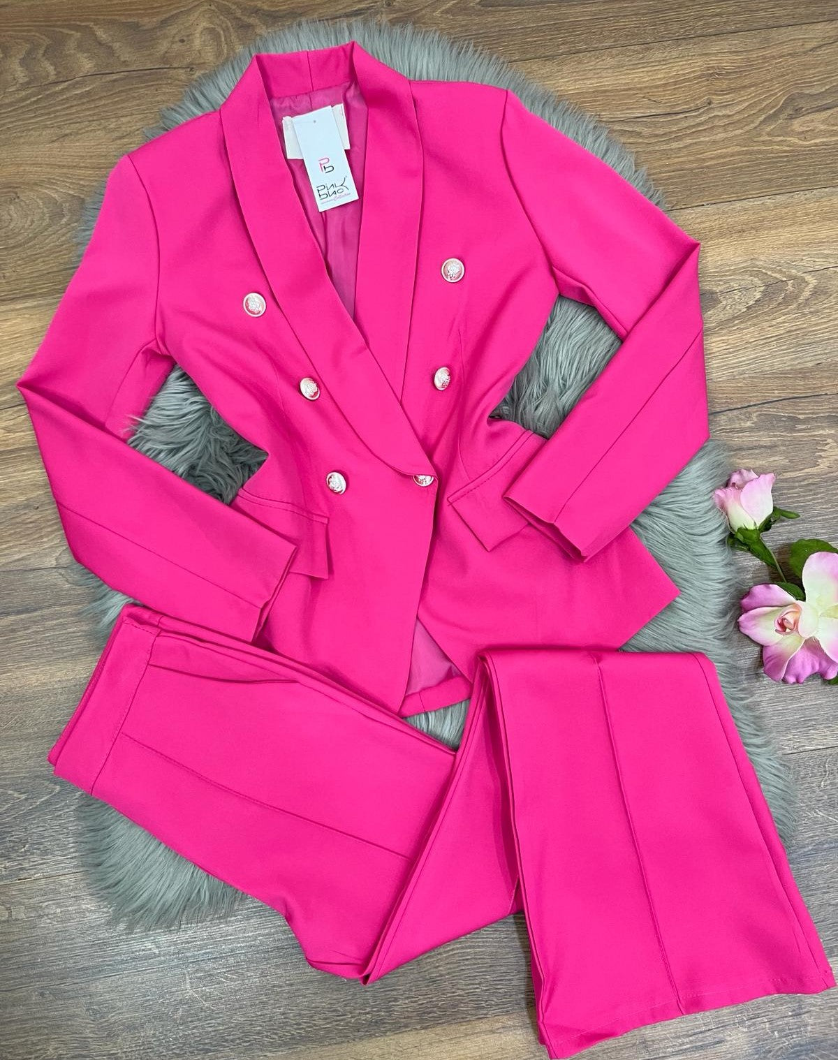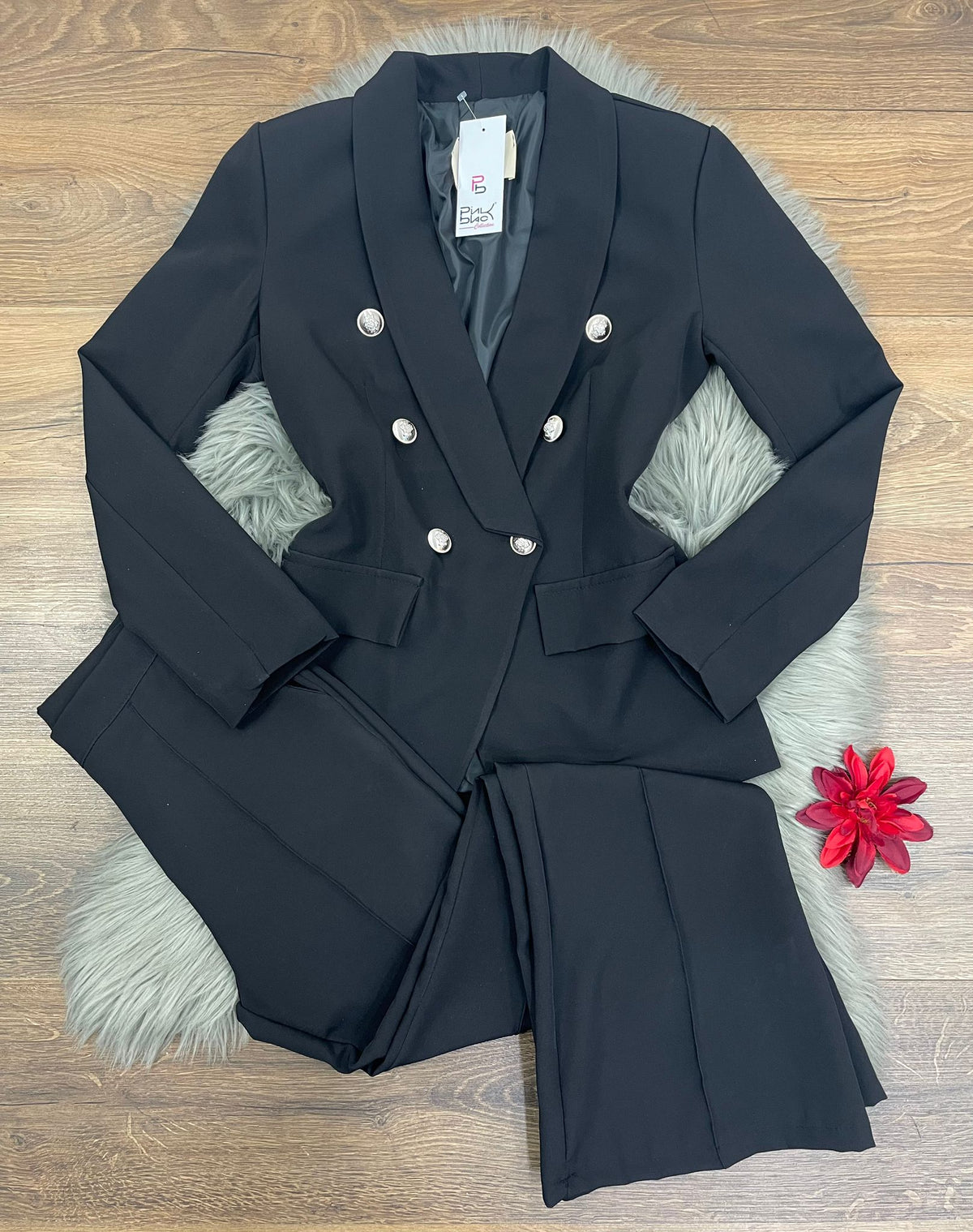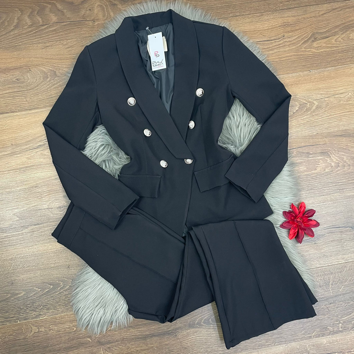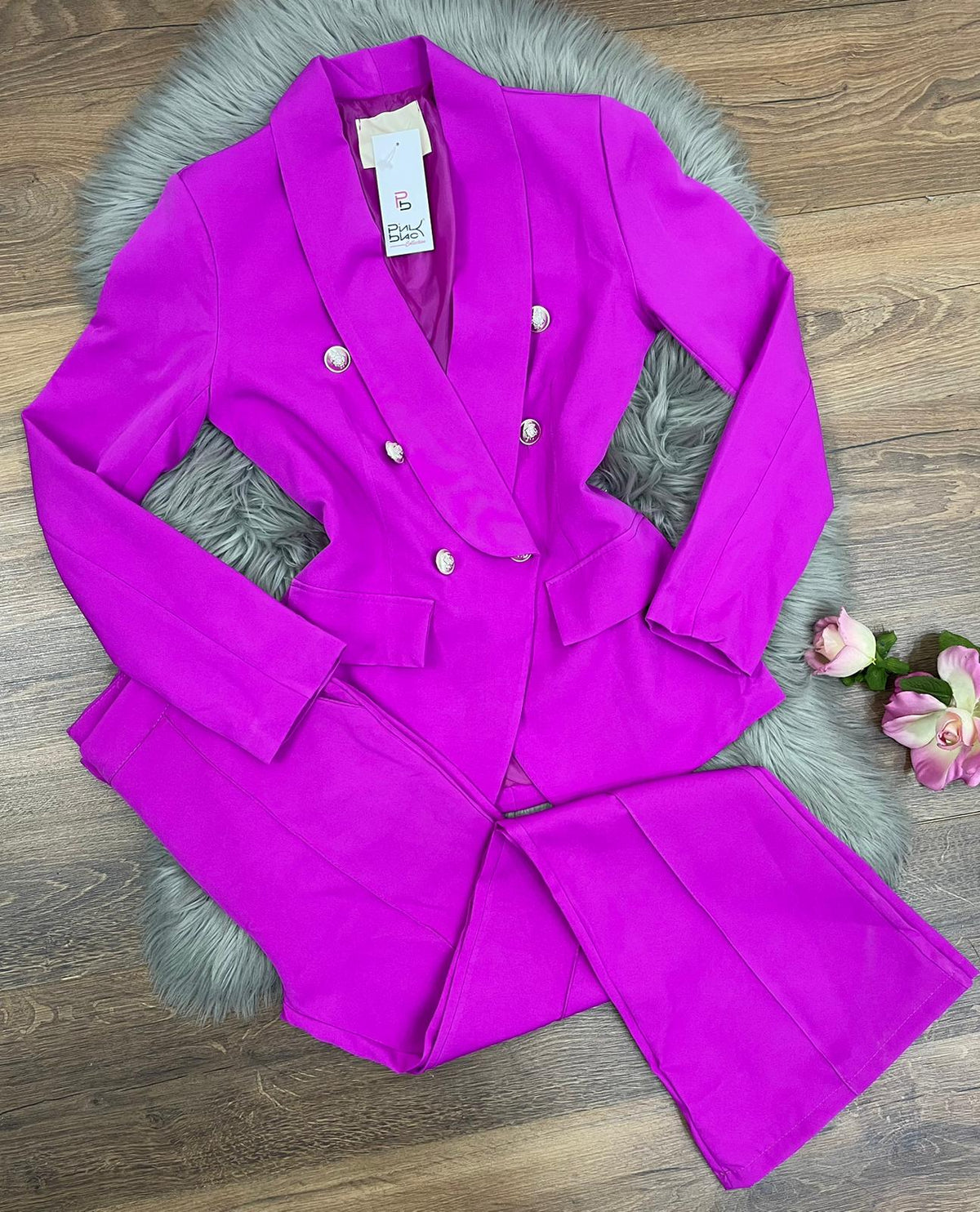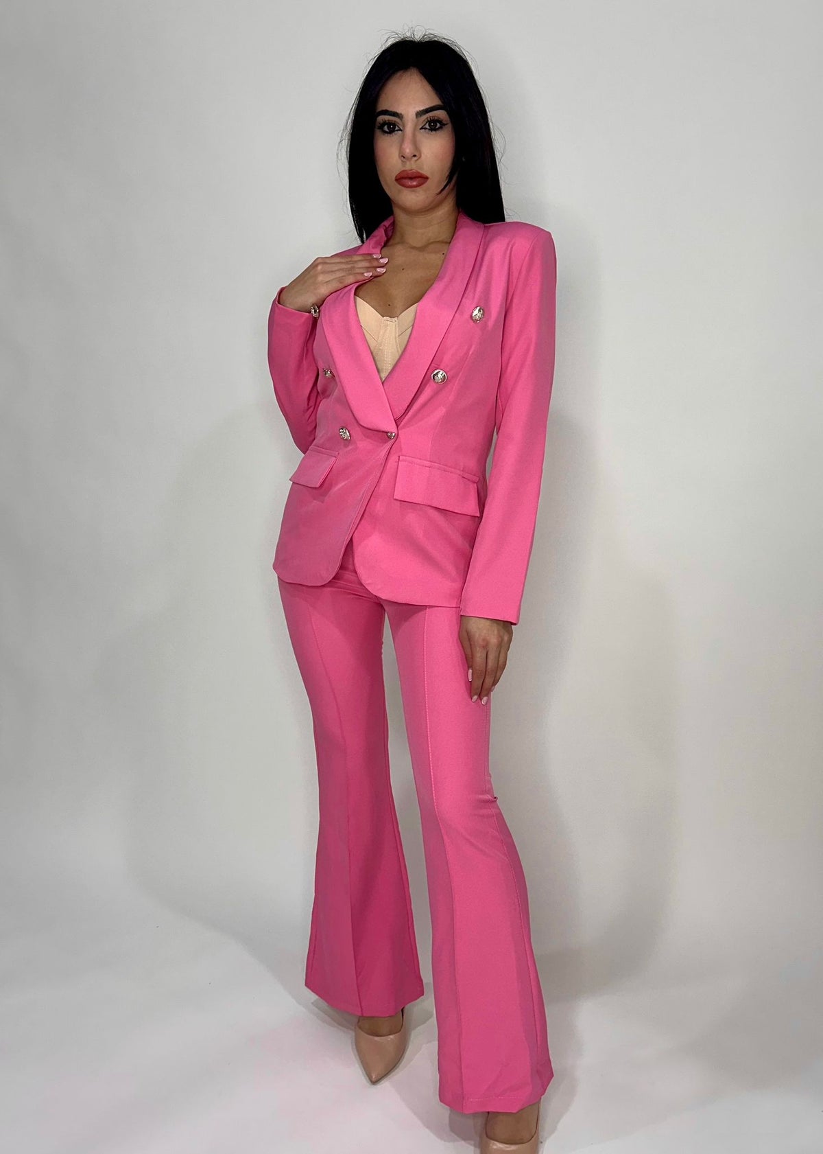 Completo giacca - pantalone, tessuto scuba crepe. Tailleur con spalline imbottite e pantalone a zampa d'elefante. Fabbricato in Italia.