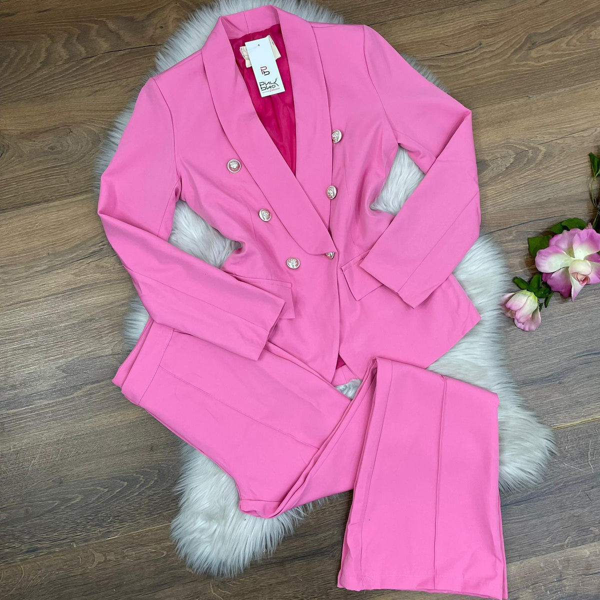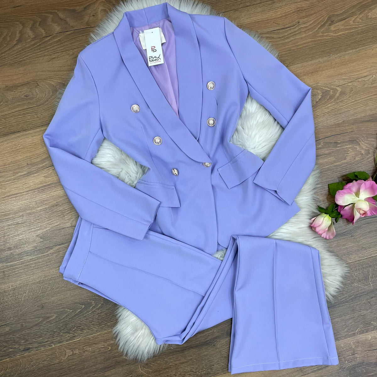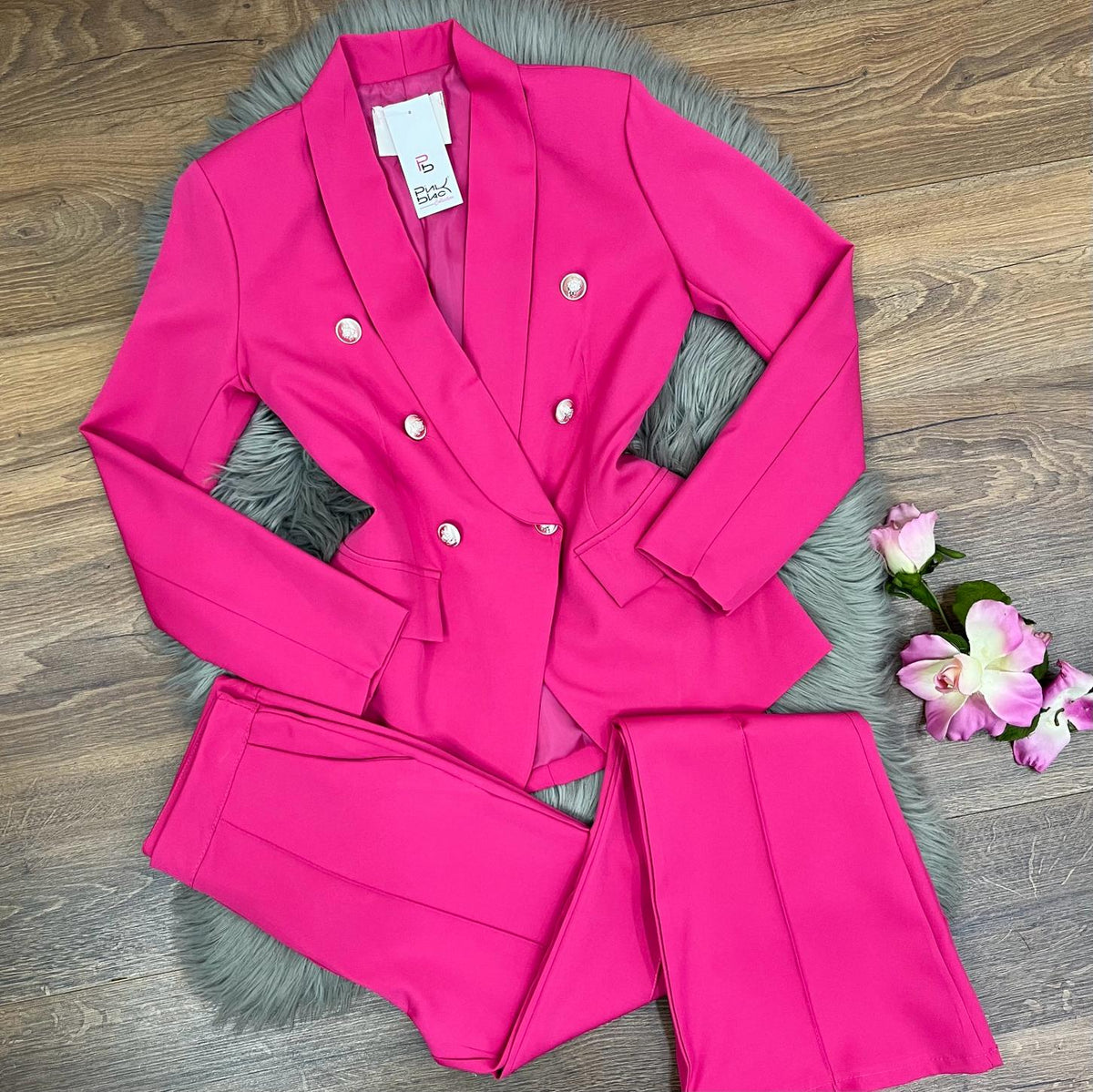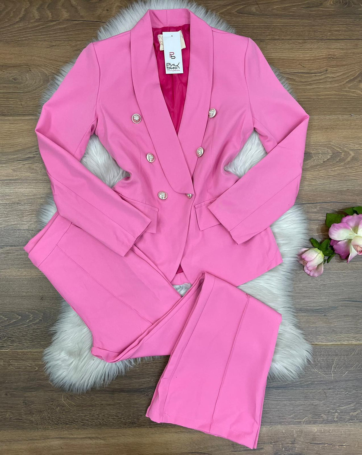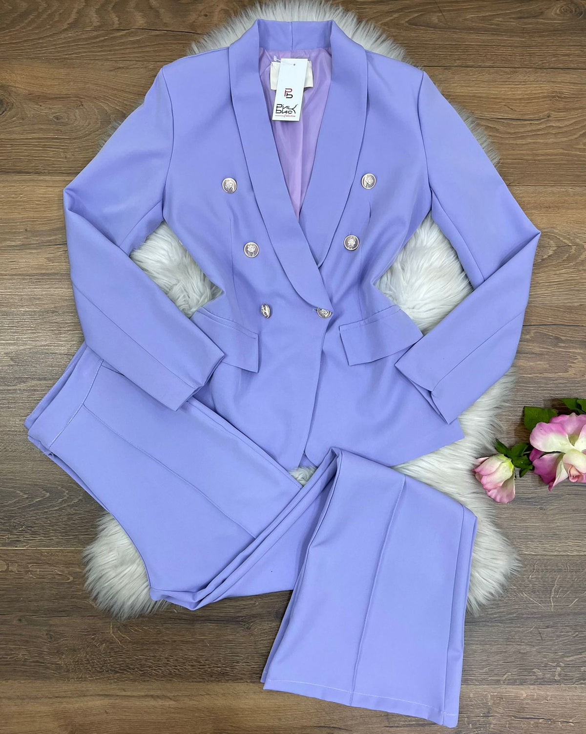 Completo giacca - pantalone, tessuto scuba crepe. Tailleur con spalline imbottite e pantalone a zampa d'elefante. Fabbricato in Italia.