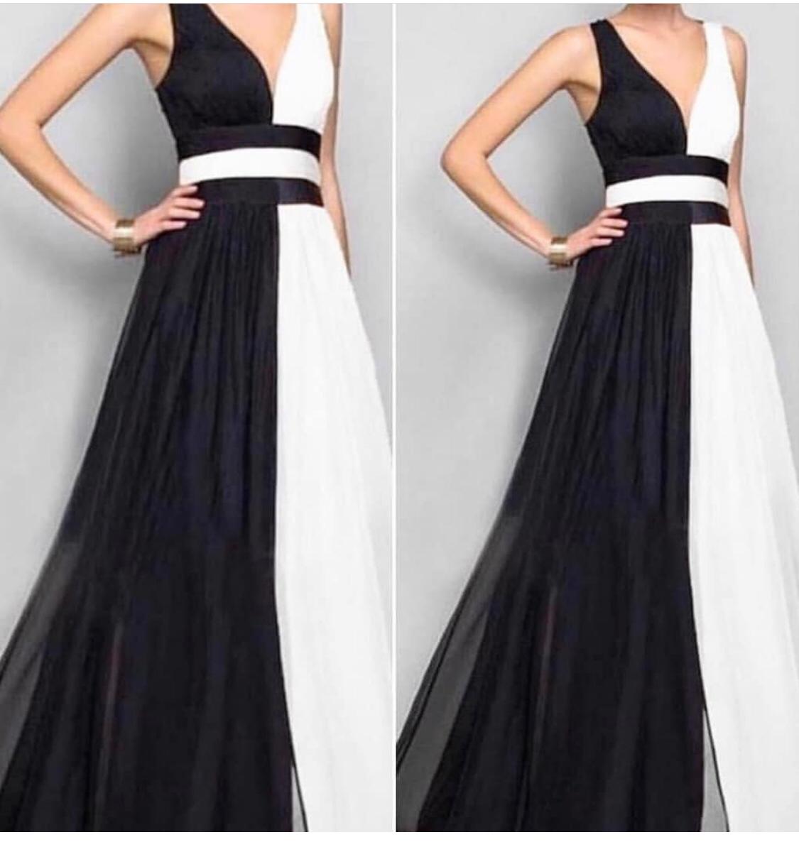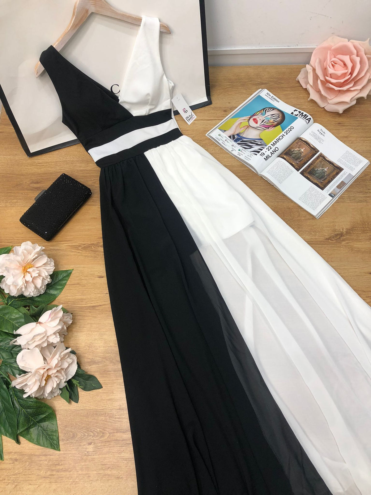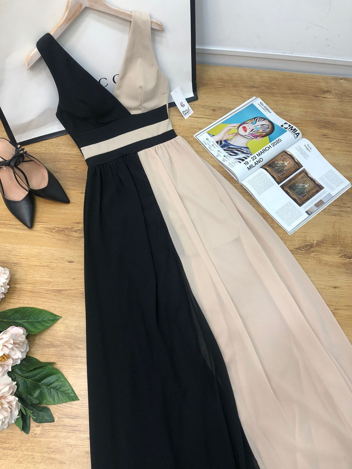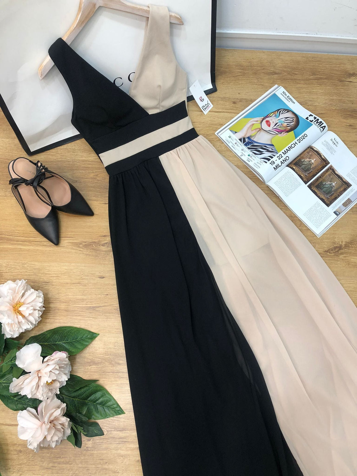 Abito lungo bicolore tessuto scuba crepe nel corpetto e gonna in chiffon con elastico in vita e chiusura posteriore con cerniera. Fabbricato in Italia.