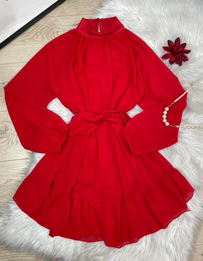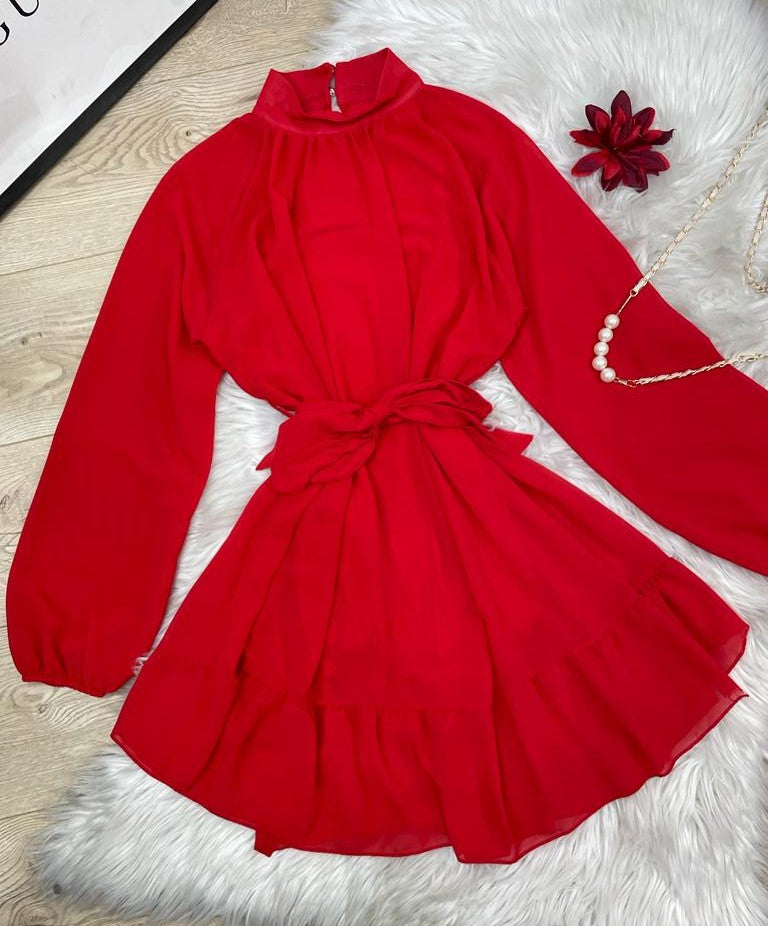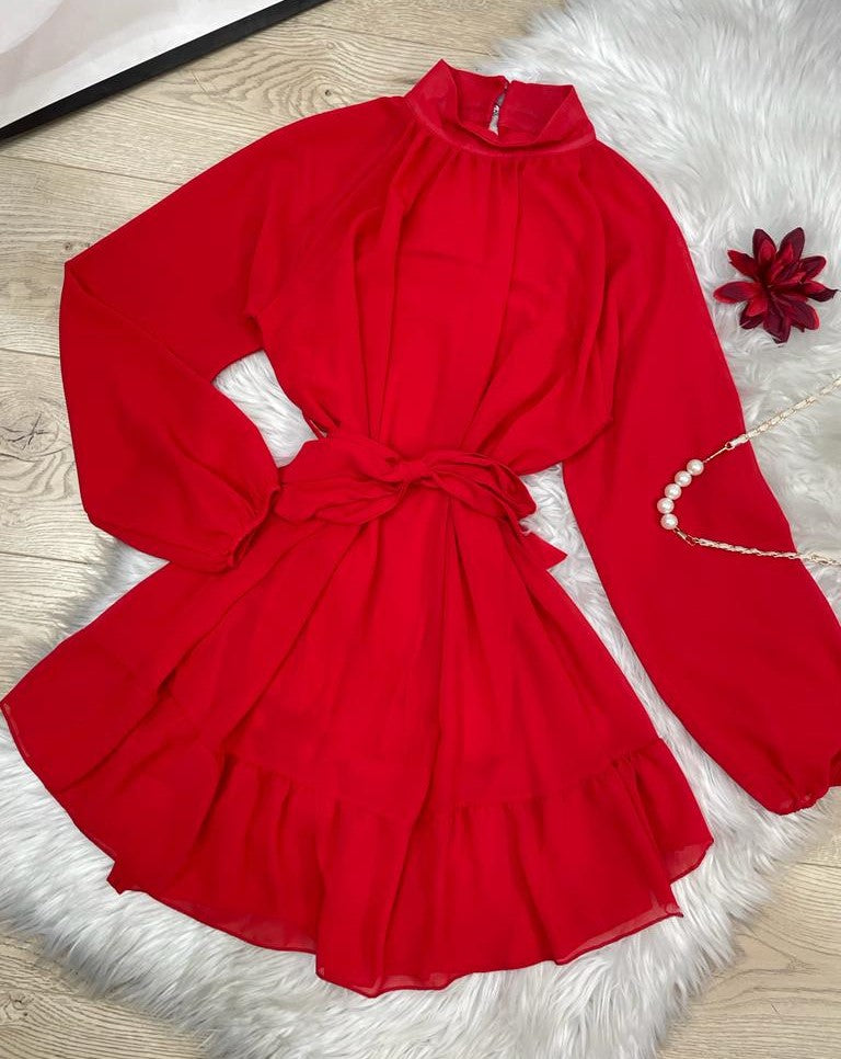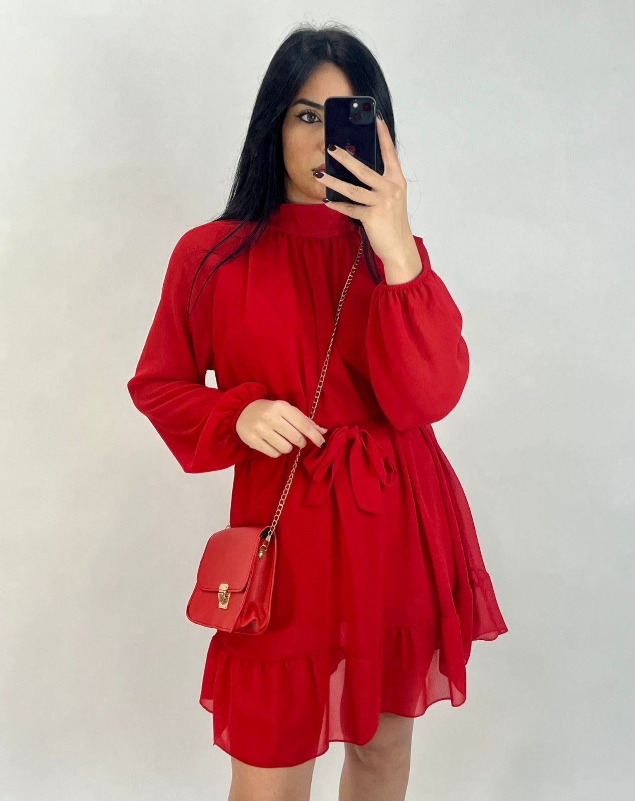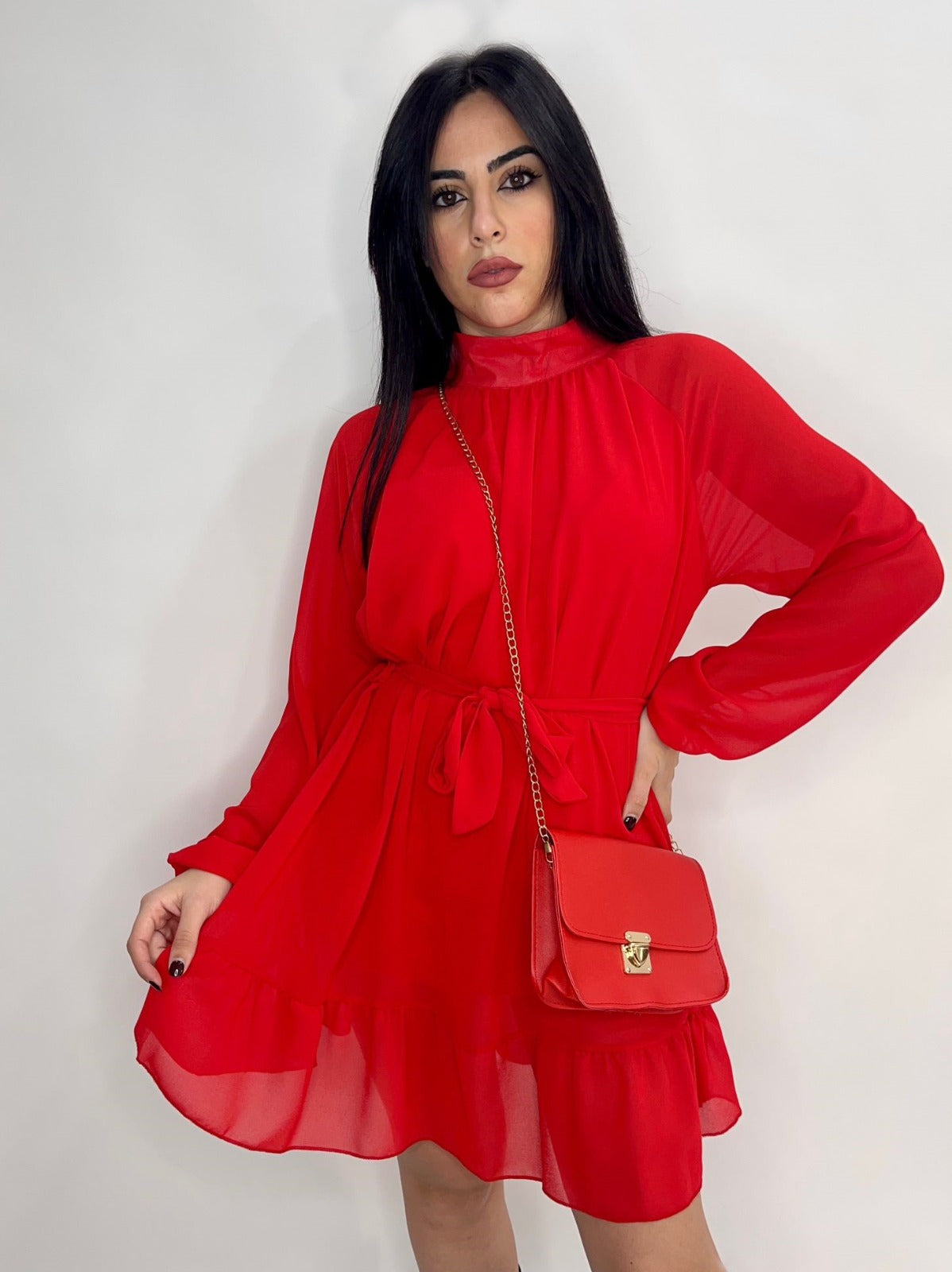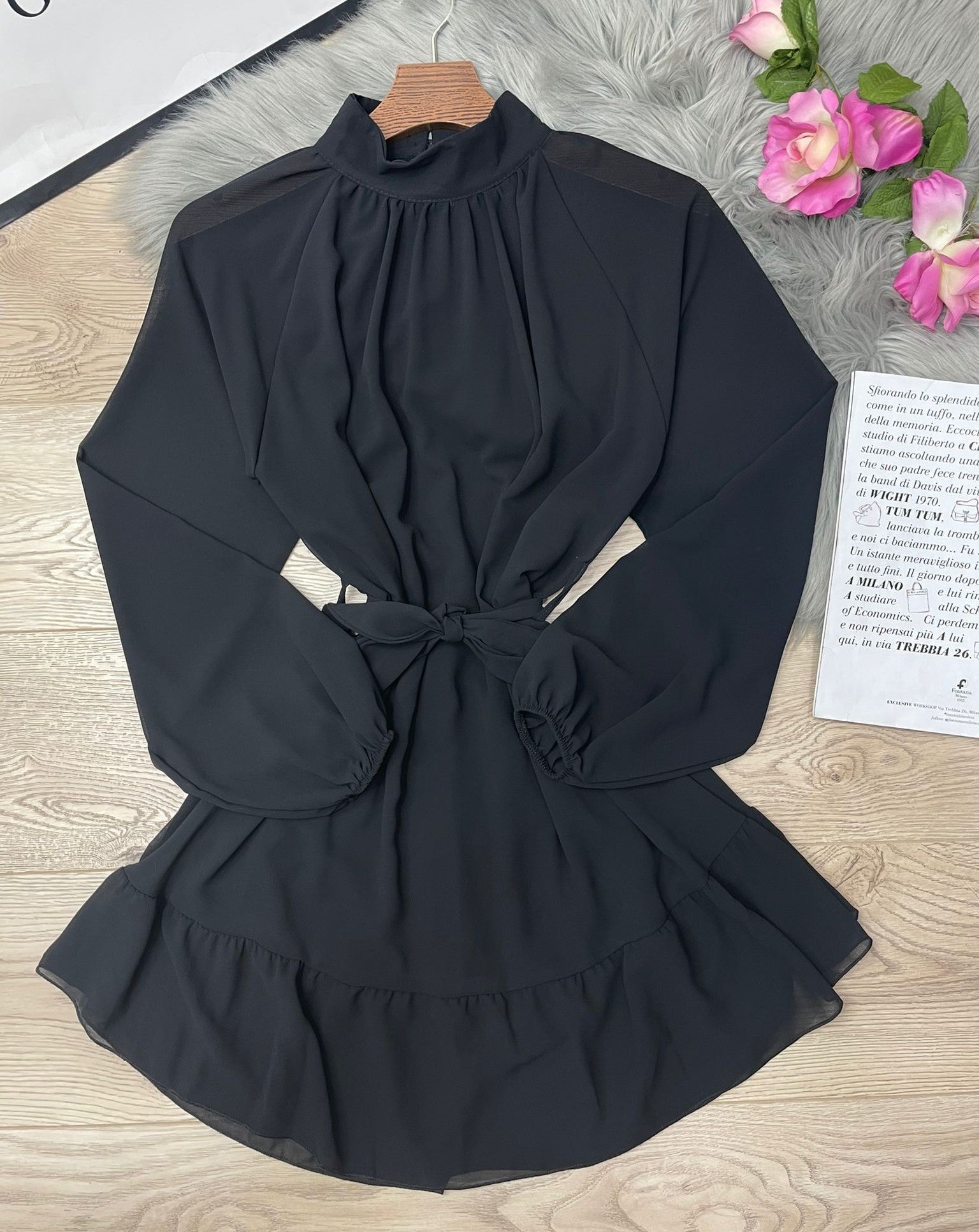 Abito in chiffon con manica lunga velata, gonna lenta con volant sull'orlo e cintura inclusa. Fabbricato in Italia.