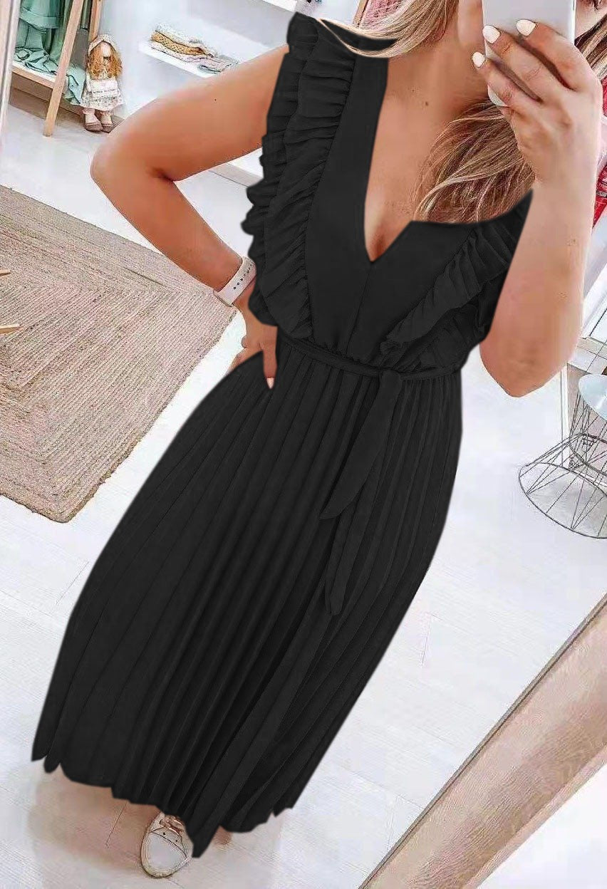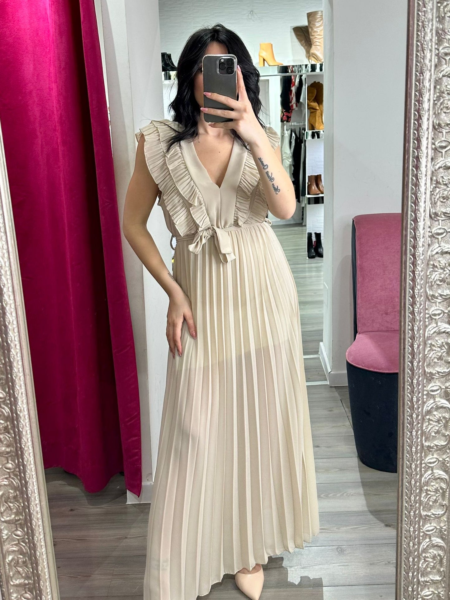 Abito lungo in chiffon con elastico in vita e gonna plissè. Fabbricato in Italia.