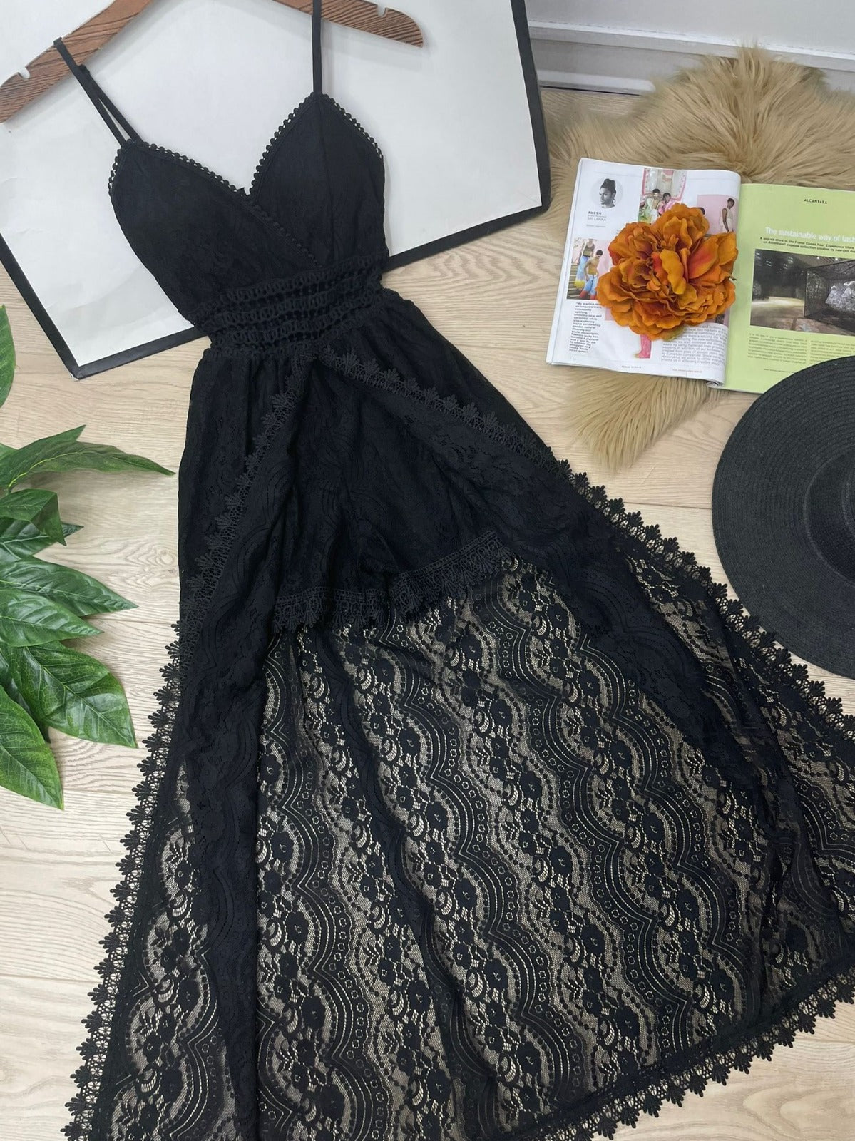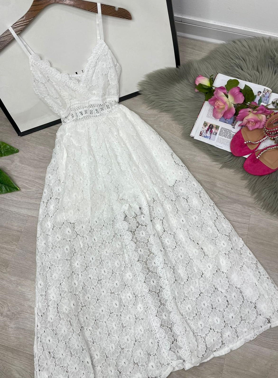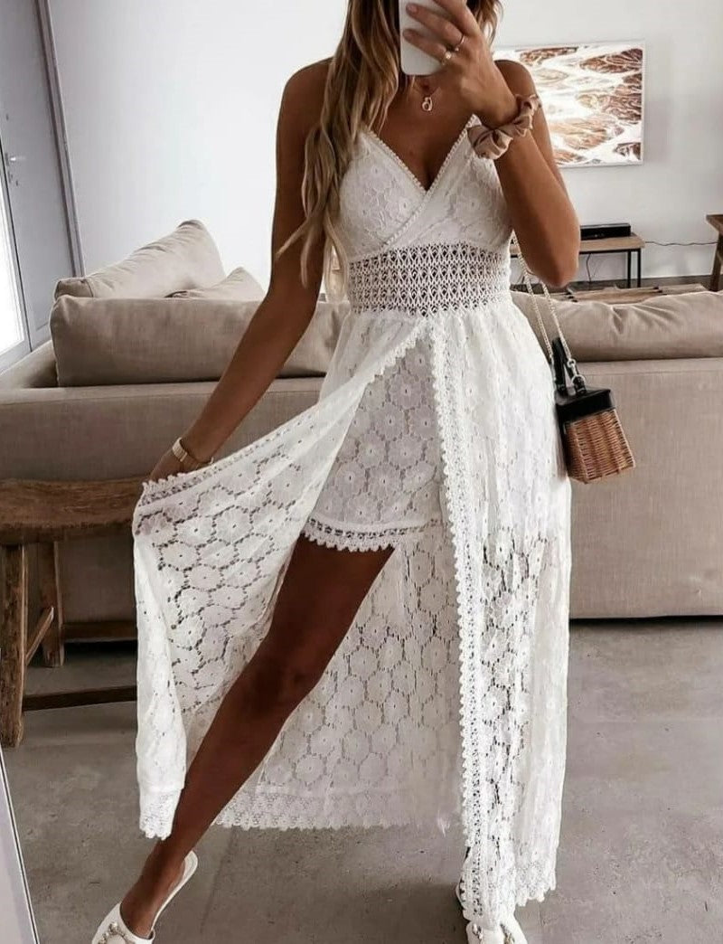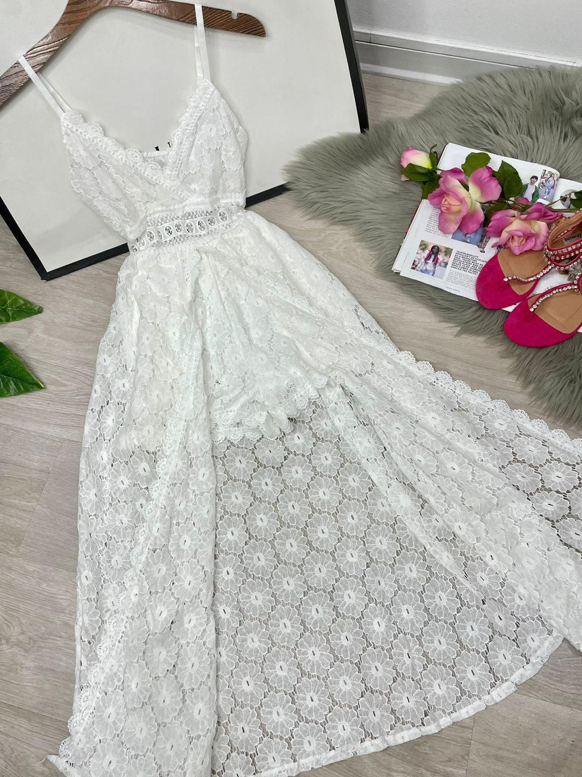 Abito in pizzo e macramè con pantaloncino e gonna lunga. Fabbricato in Italia.