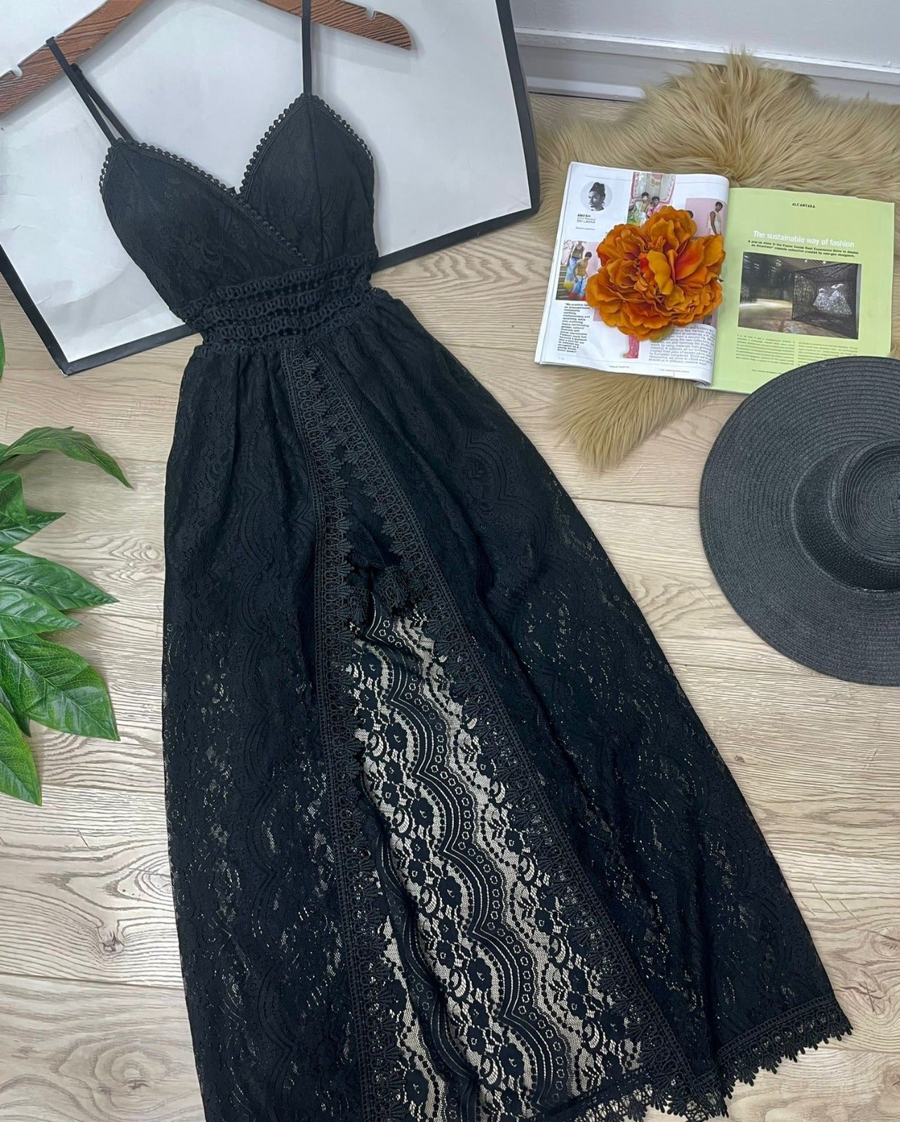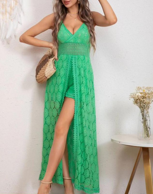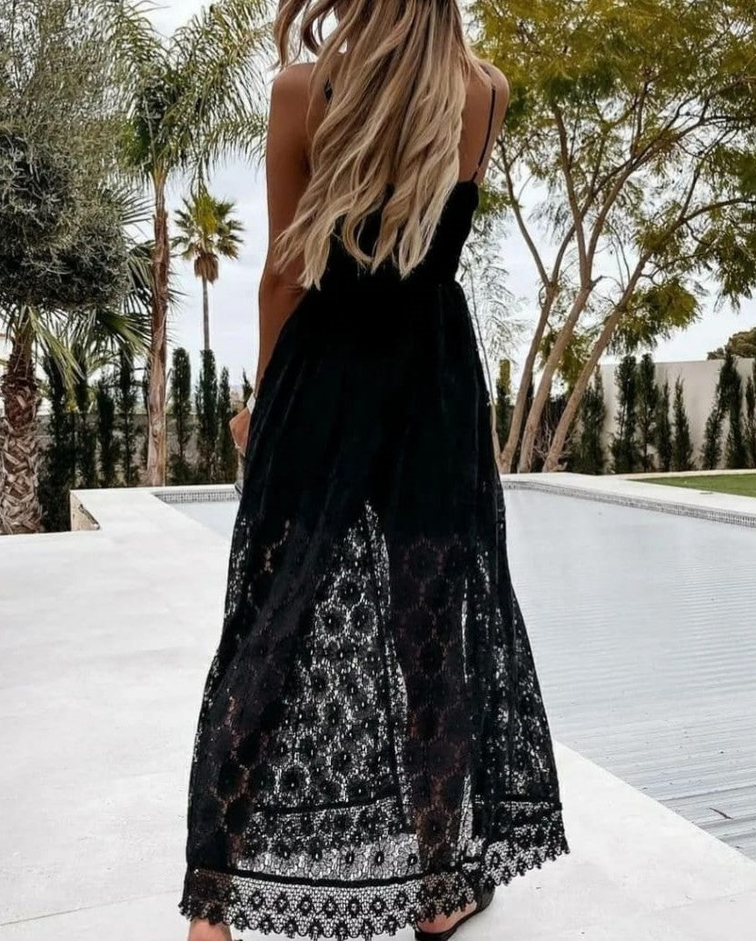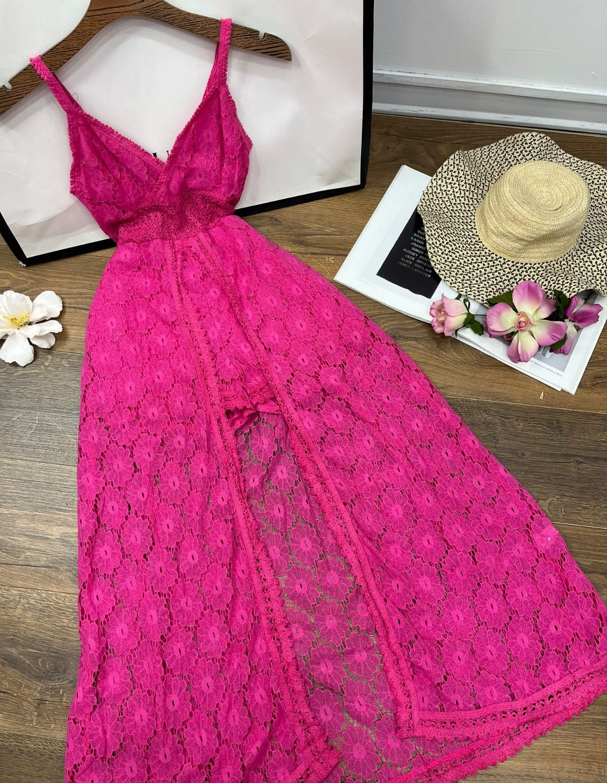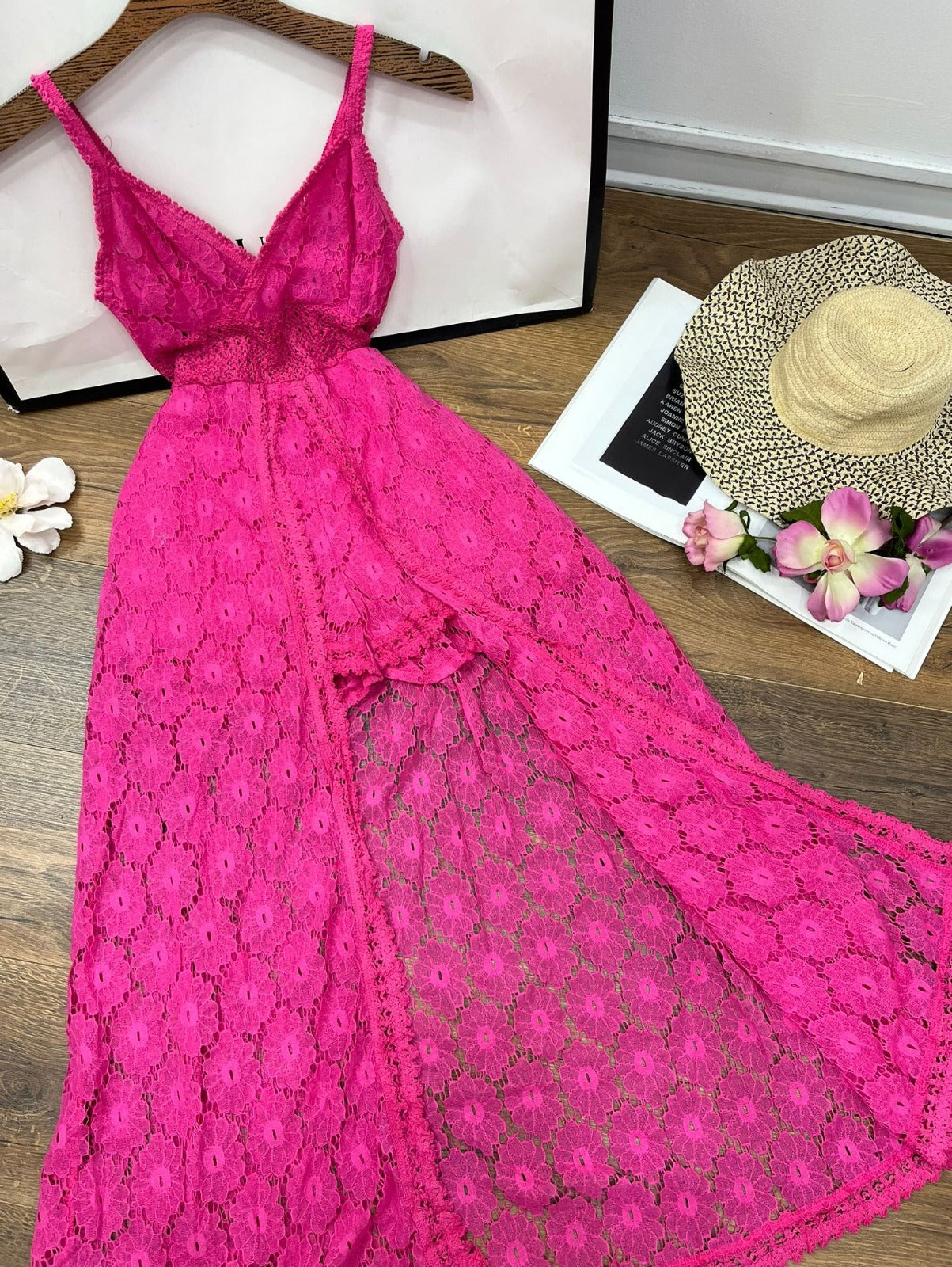 Abito in pizzo e macramè con pantaloncino e gonna lunga. Fabbricato in Italia.