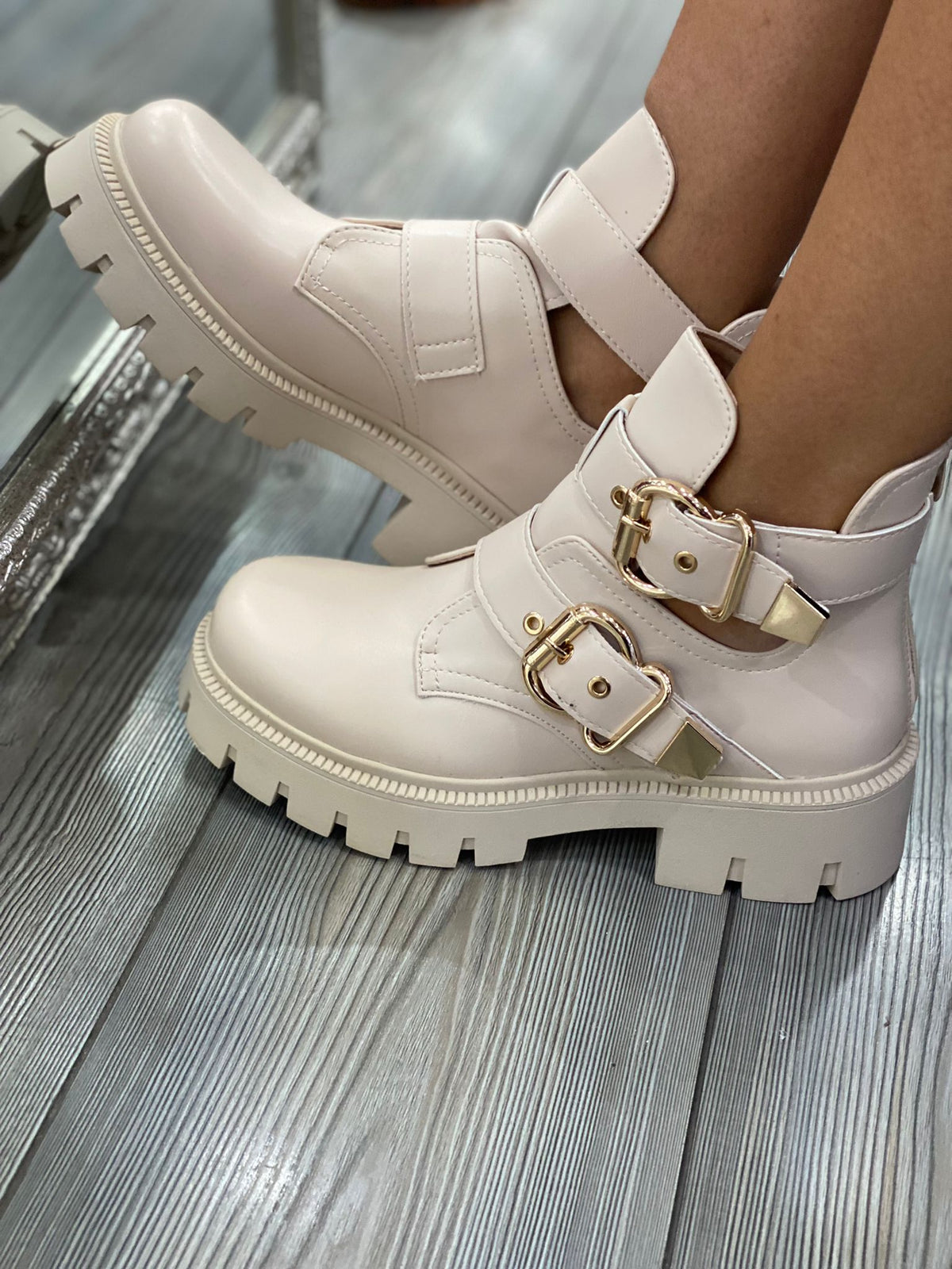 Stivaletto in ecopelle con doppia fibbia, cerniera e suola a carrarmato.