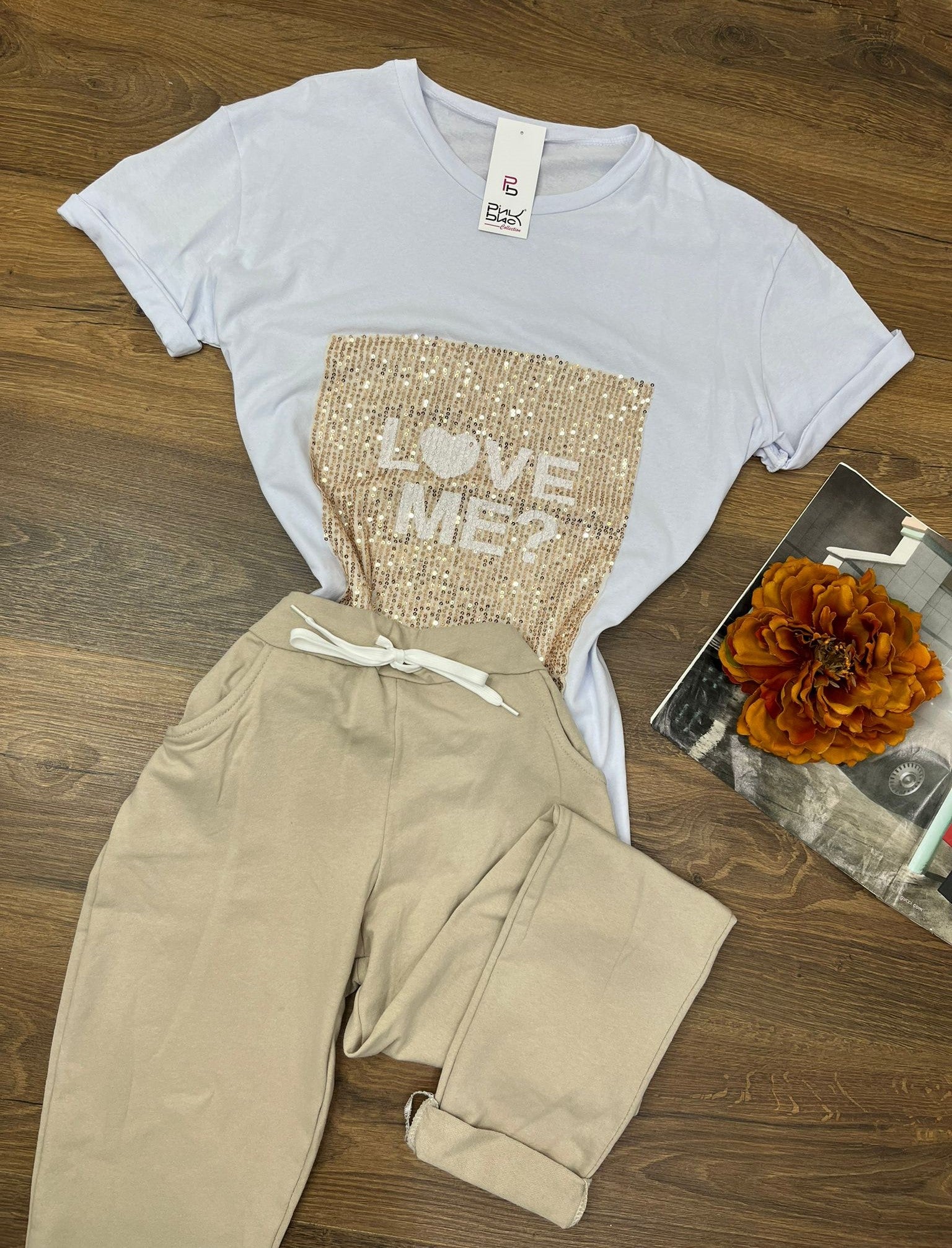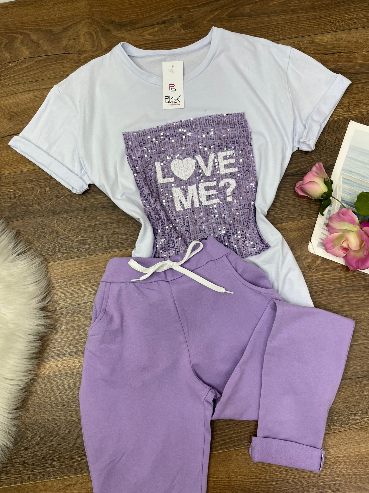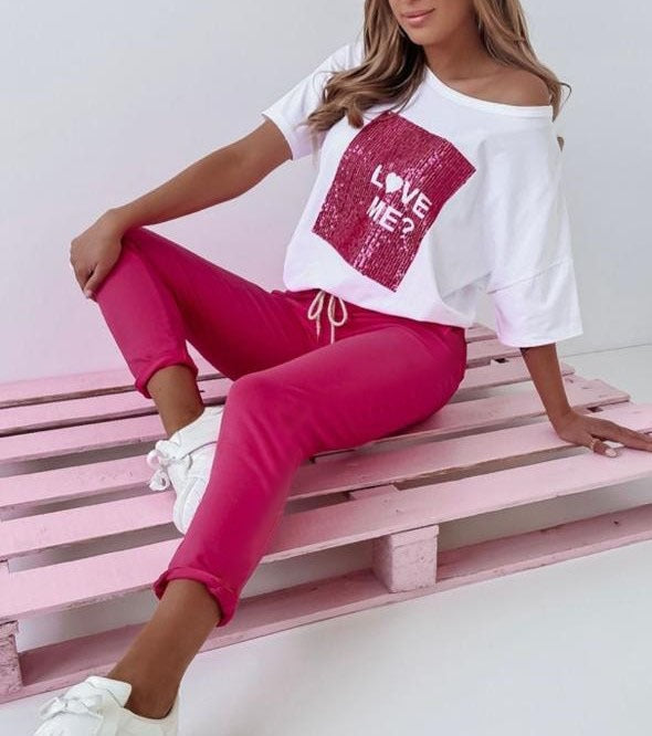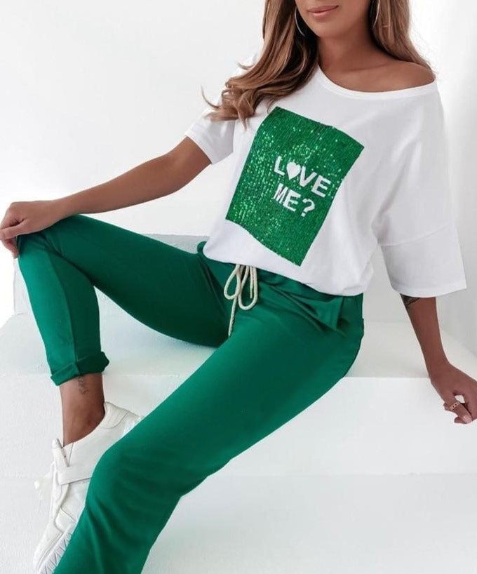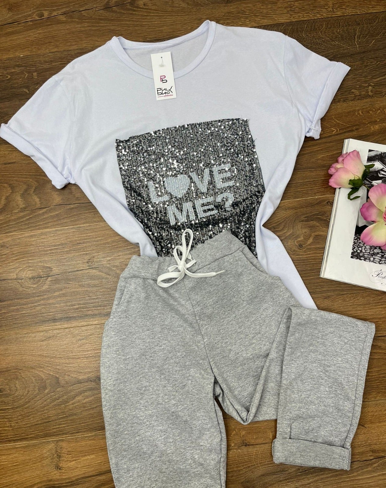 Completo tuta maglia - pantalone con applicazione di paillettes, elastico in vita e tasche. Fabbricato in Italia.
