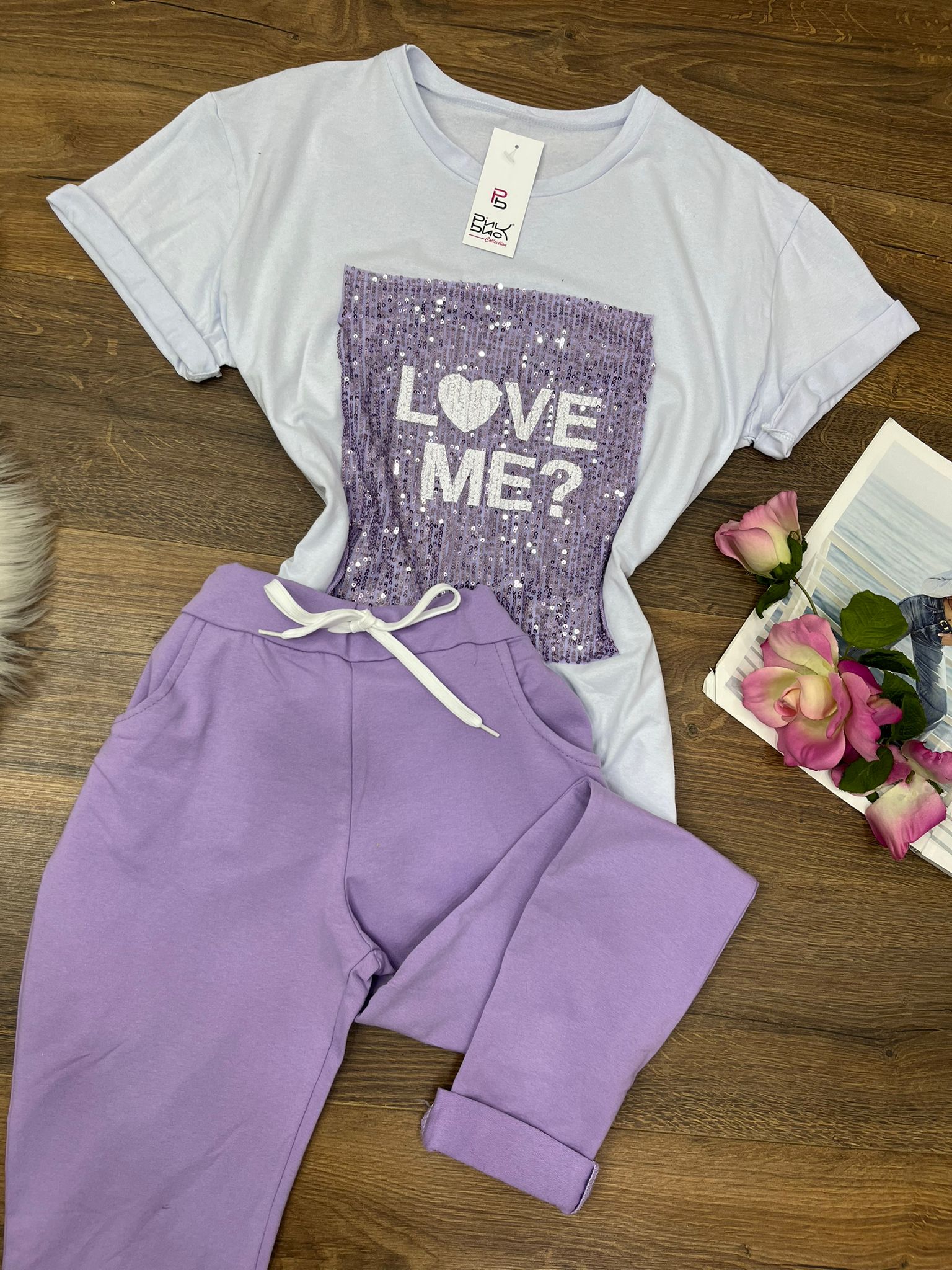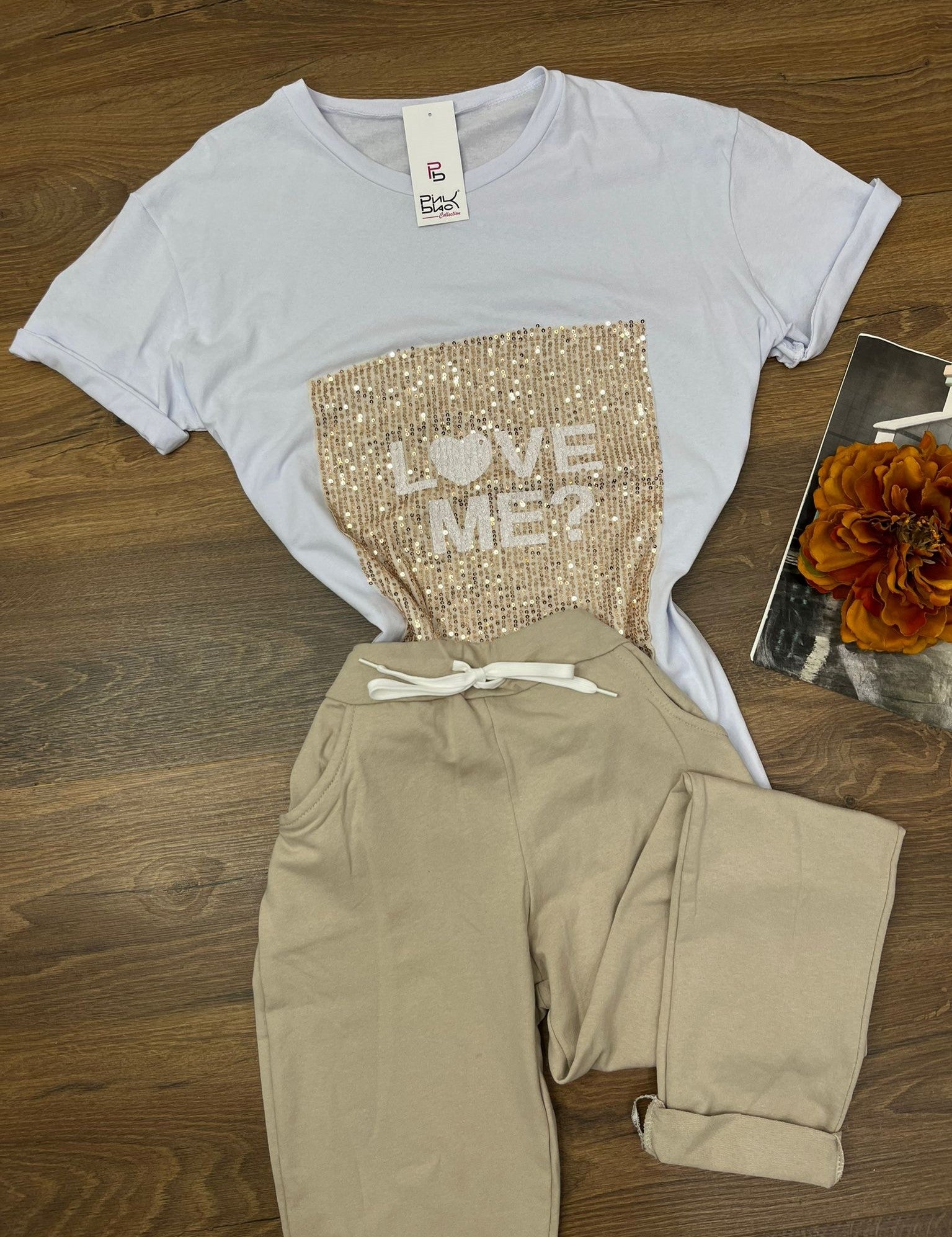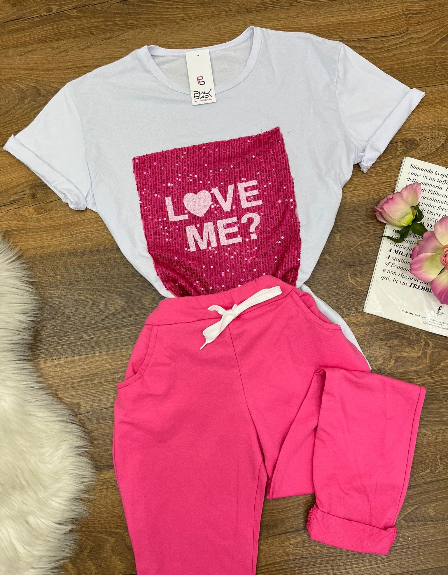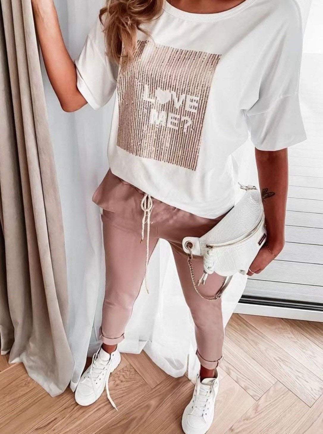 Completo tuta maglia - pantalone con applicazione di paillettes, elastico in vita e tasche. Fabbricato in Italia.