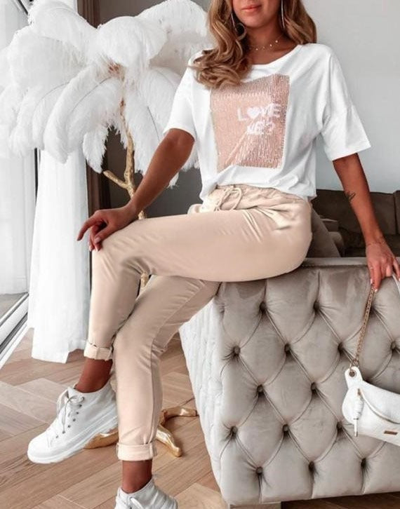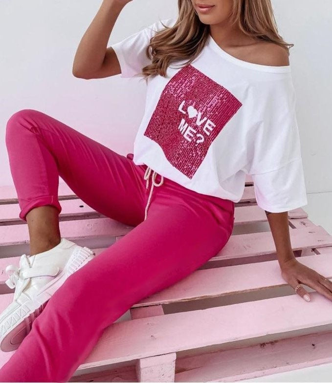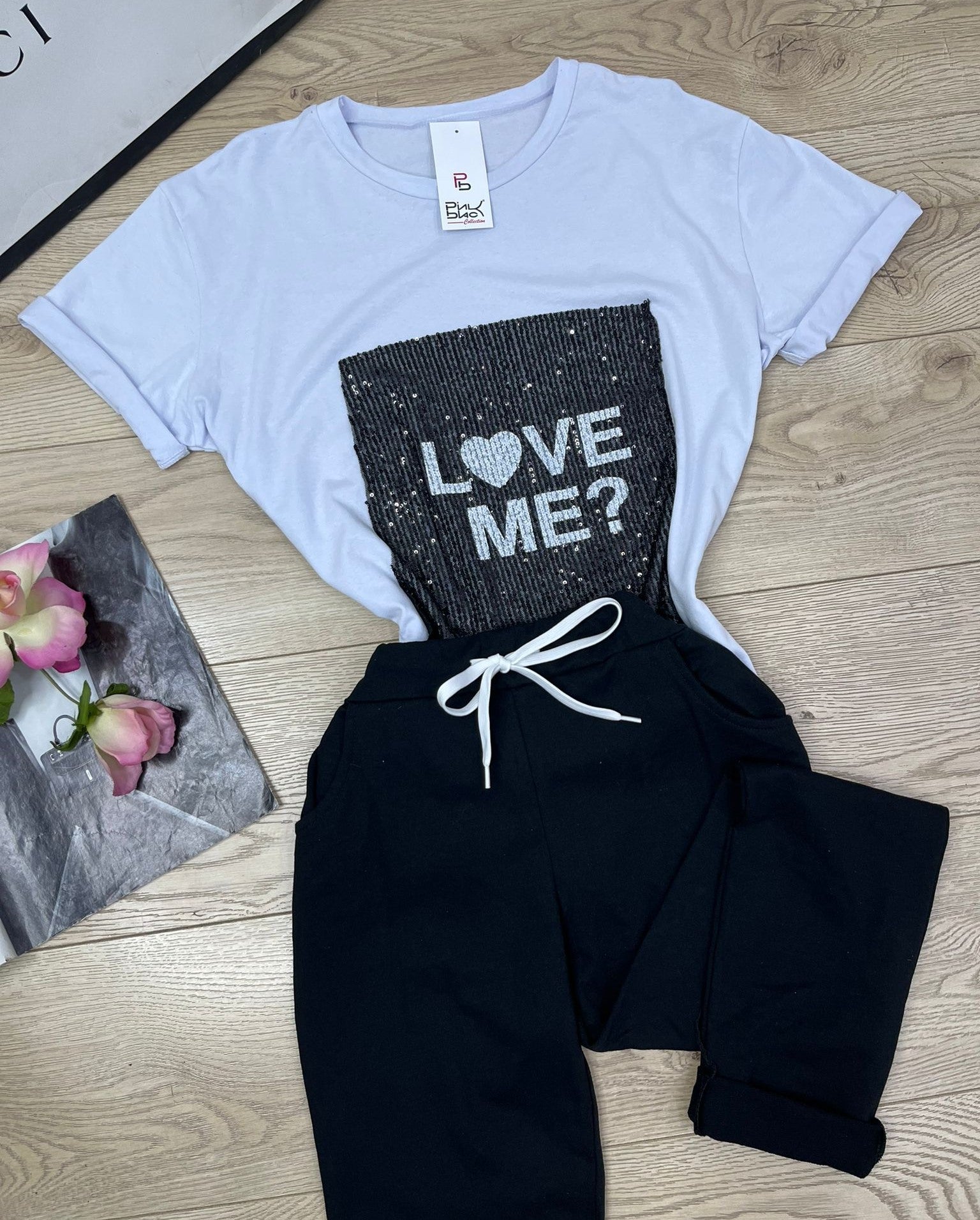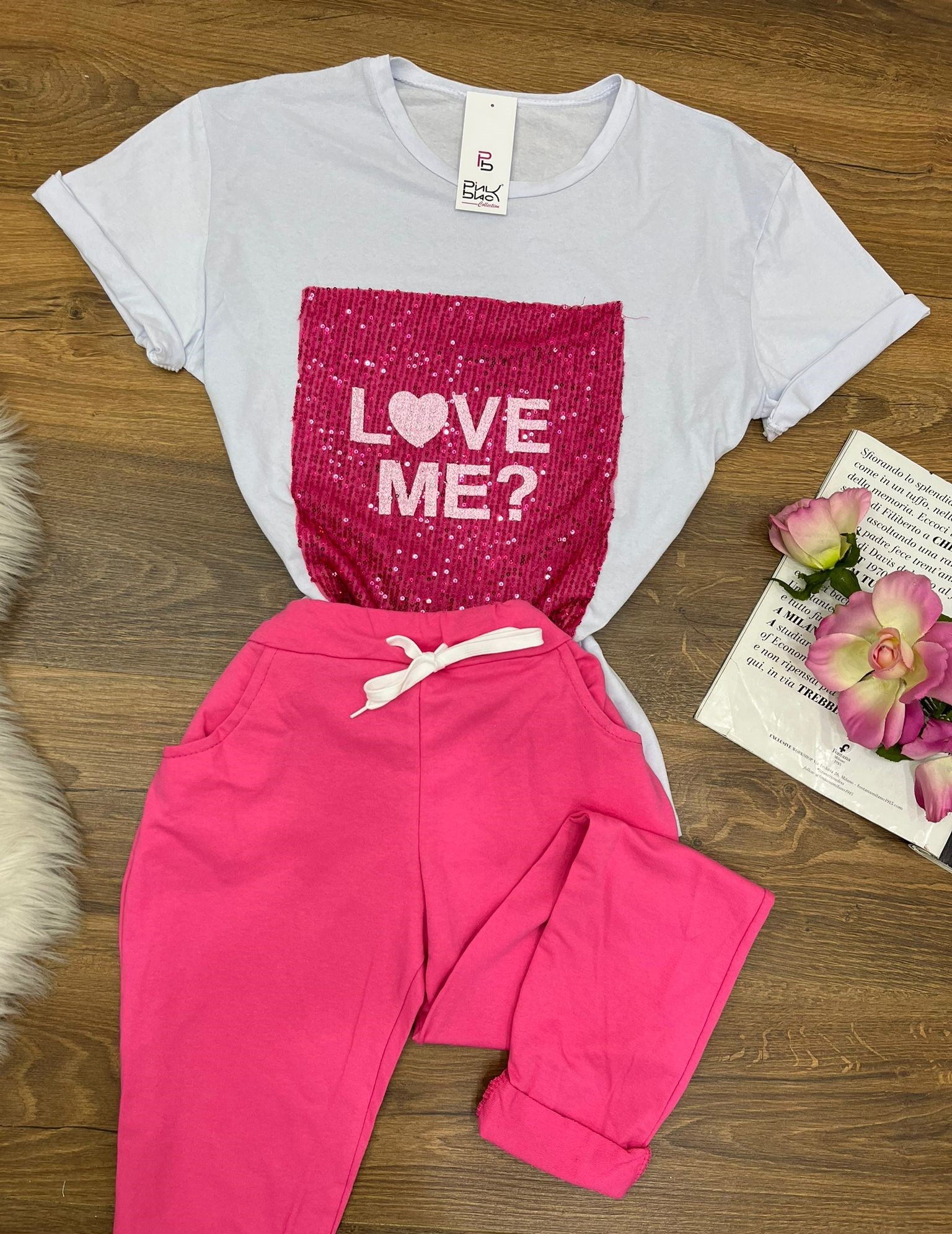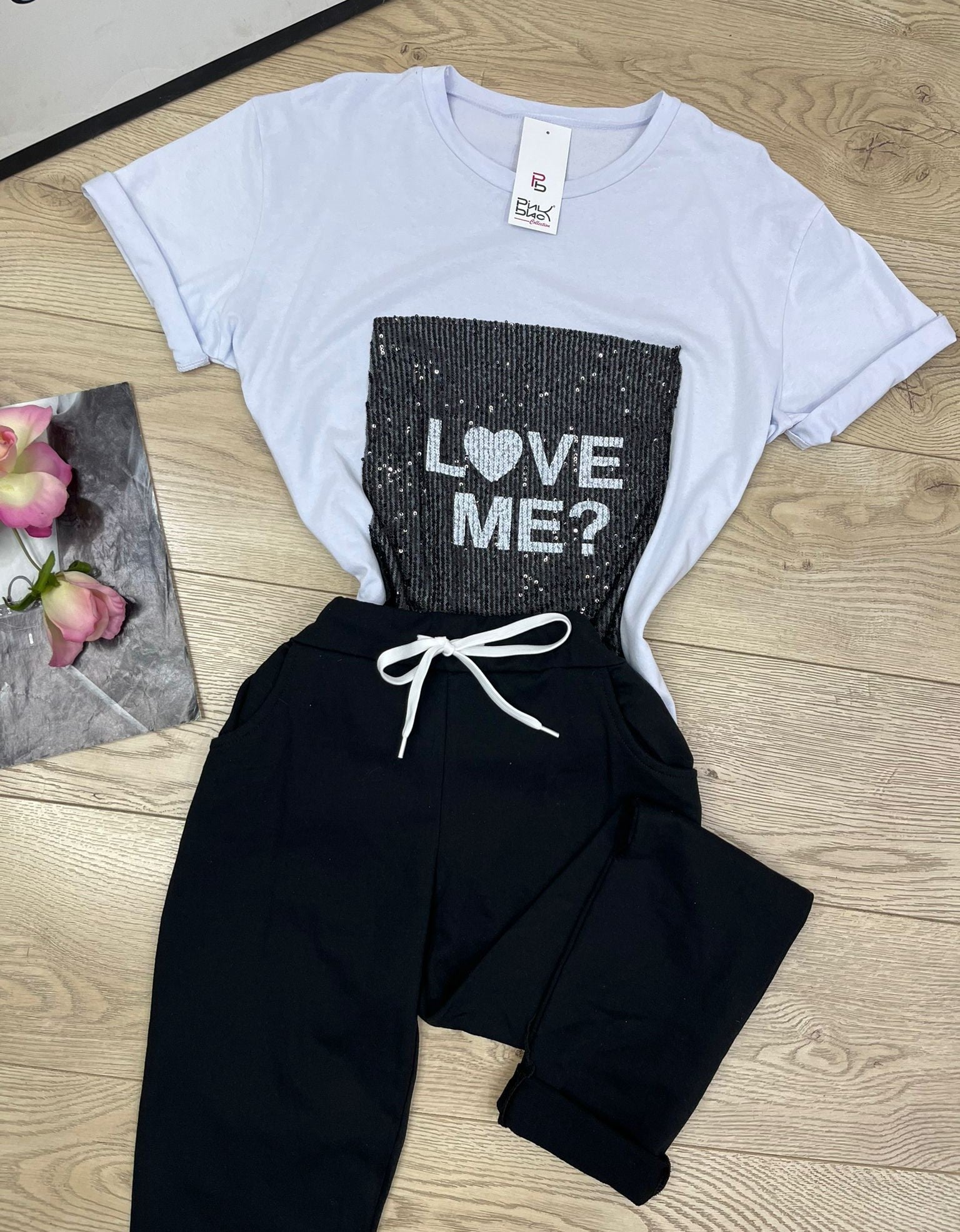 Completo tuta maglia - pantalone con applicazione di paillettes, elastico in vita e tasche. Fabbricato in Italia.