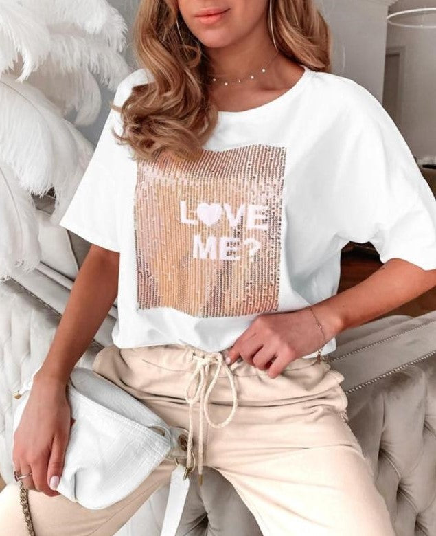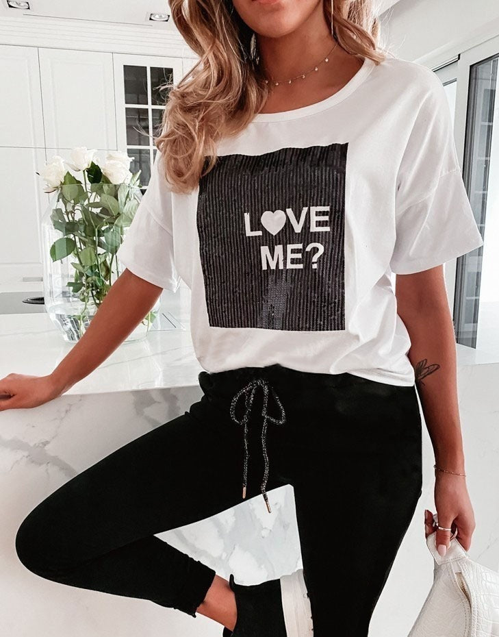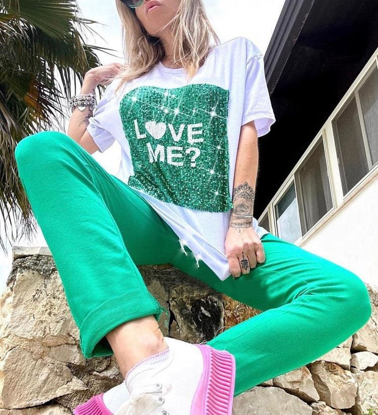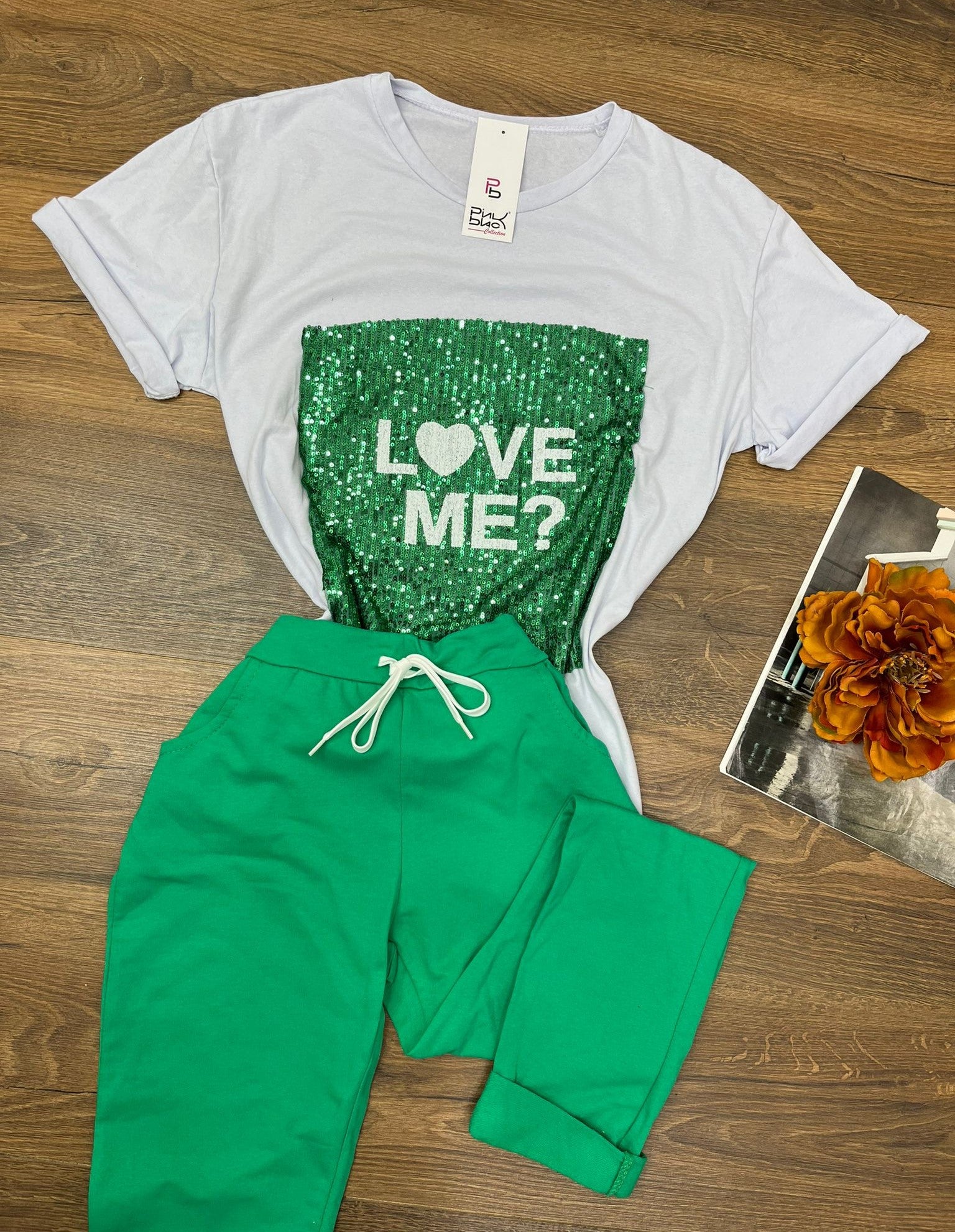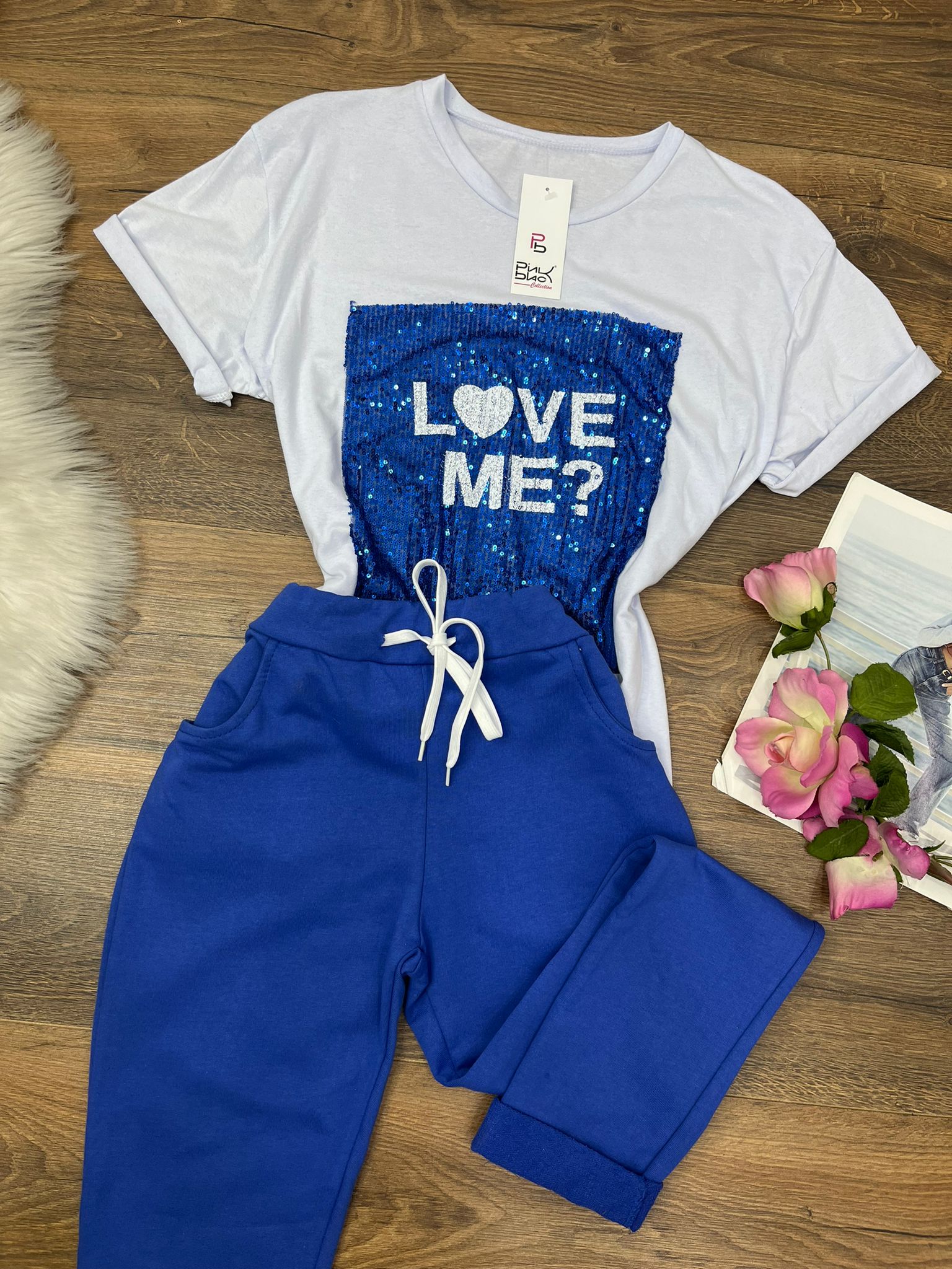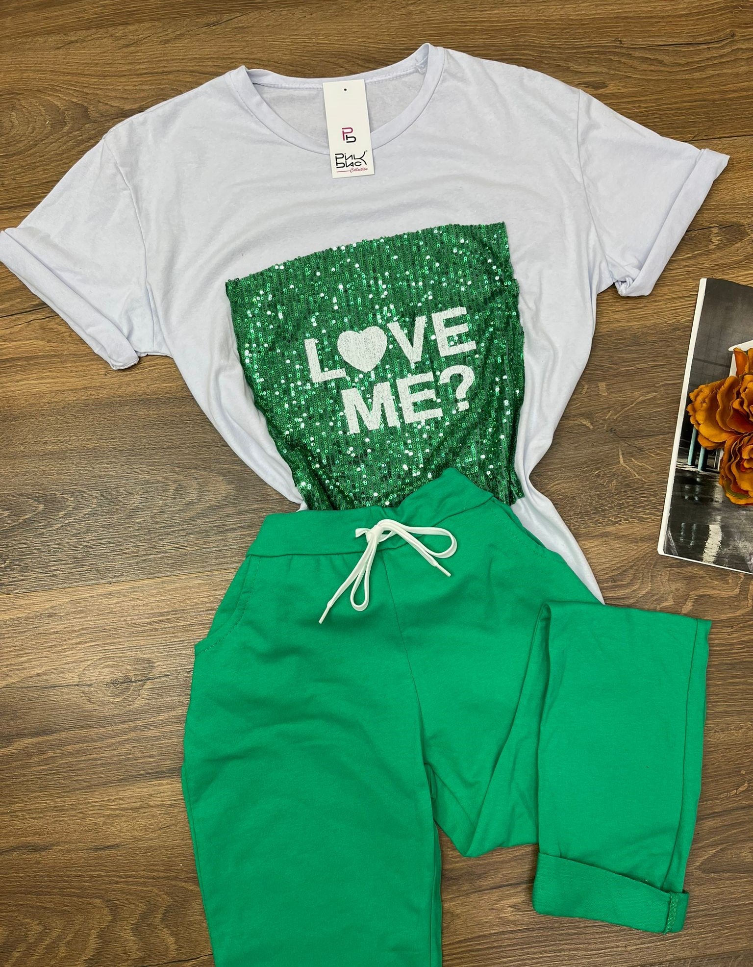 Completo tuta maglia - pantalone con applicazione di paillettes, elastico in vita e tasche. Fabbricato in Italia.