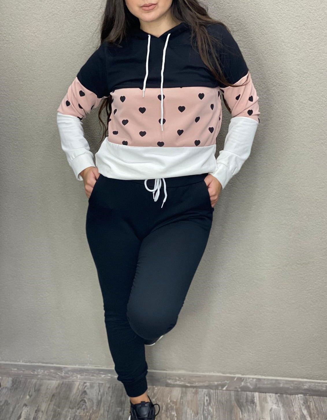 Completo tuta felpa - pantalone con stampa cuori. Felpa con cappuccio e manica lunga ; pantalone con elastico in vita con laccio e tasche laterali. Casual e pratico, per un look sportivo e una vestibilità ottimale e alla moda. Fabbricato in Italia.