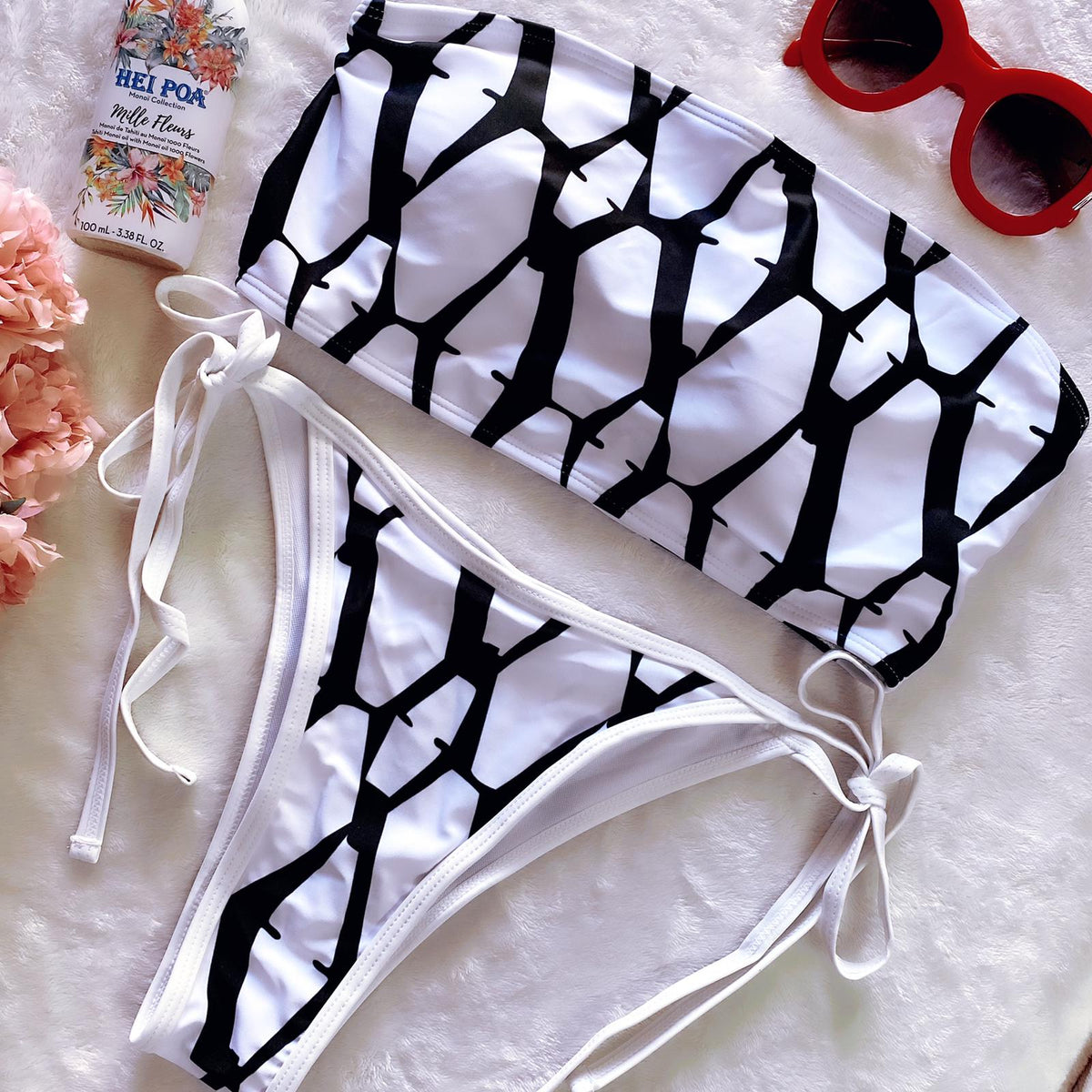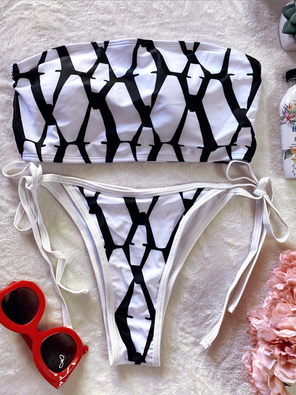 Costume a due pezzi con top a fascia grafica e slip-perizoma regolabile.