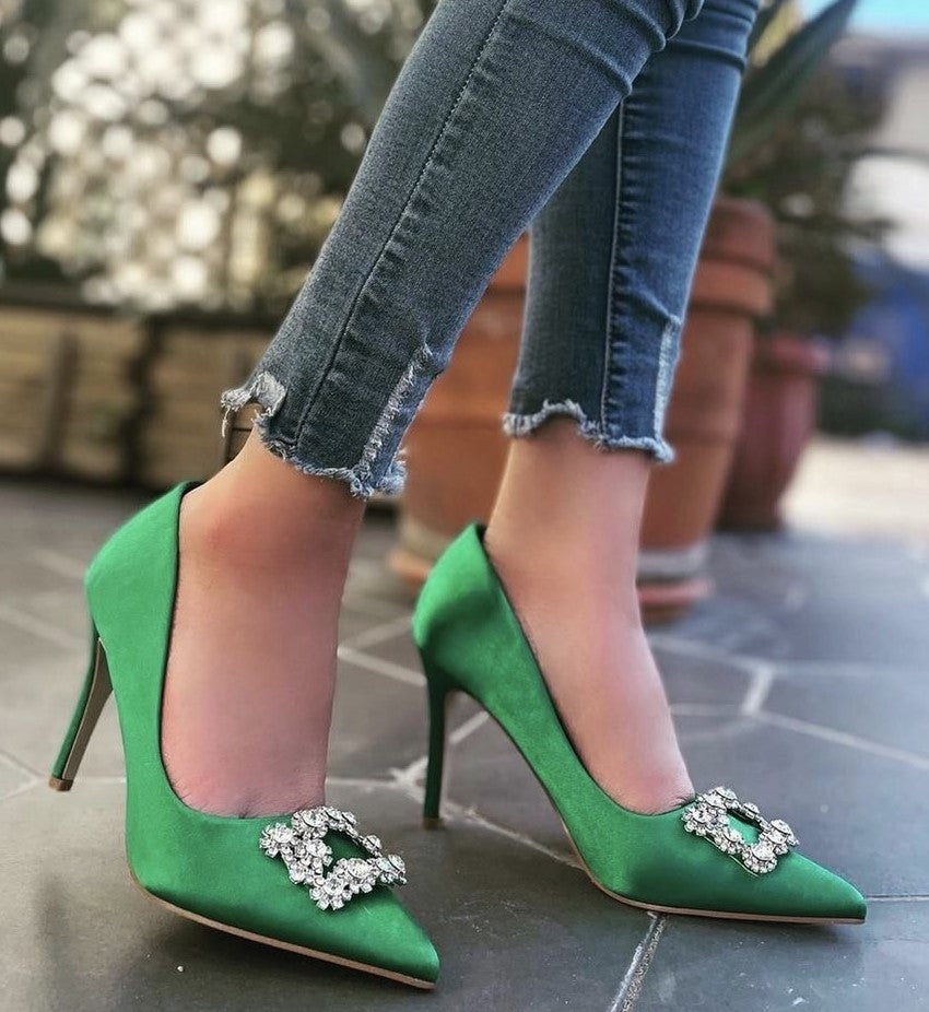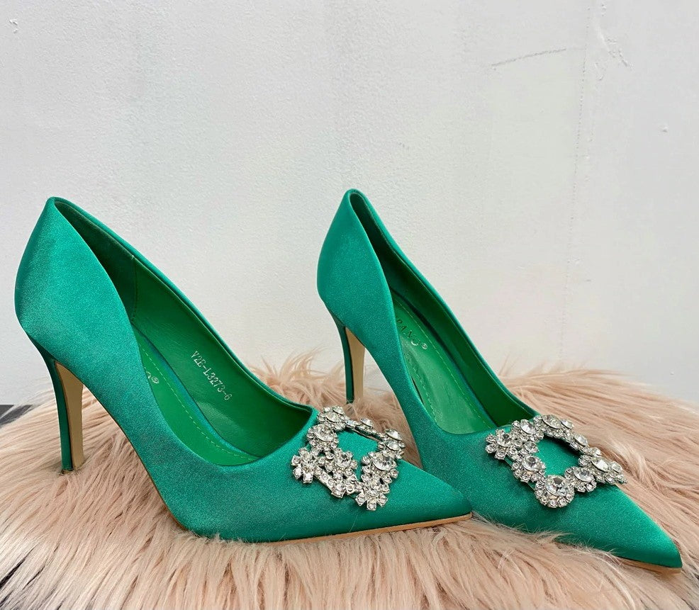 Décolleté in tessuto rasato con tacco a spillo e applicazione di pietre.