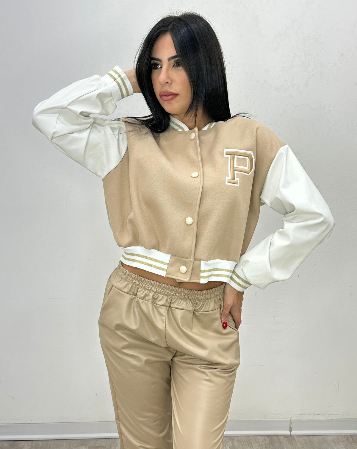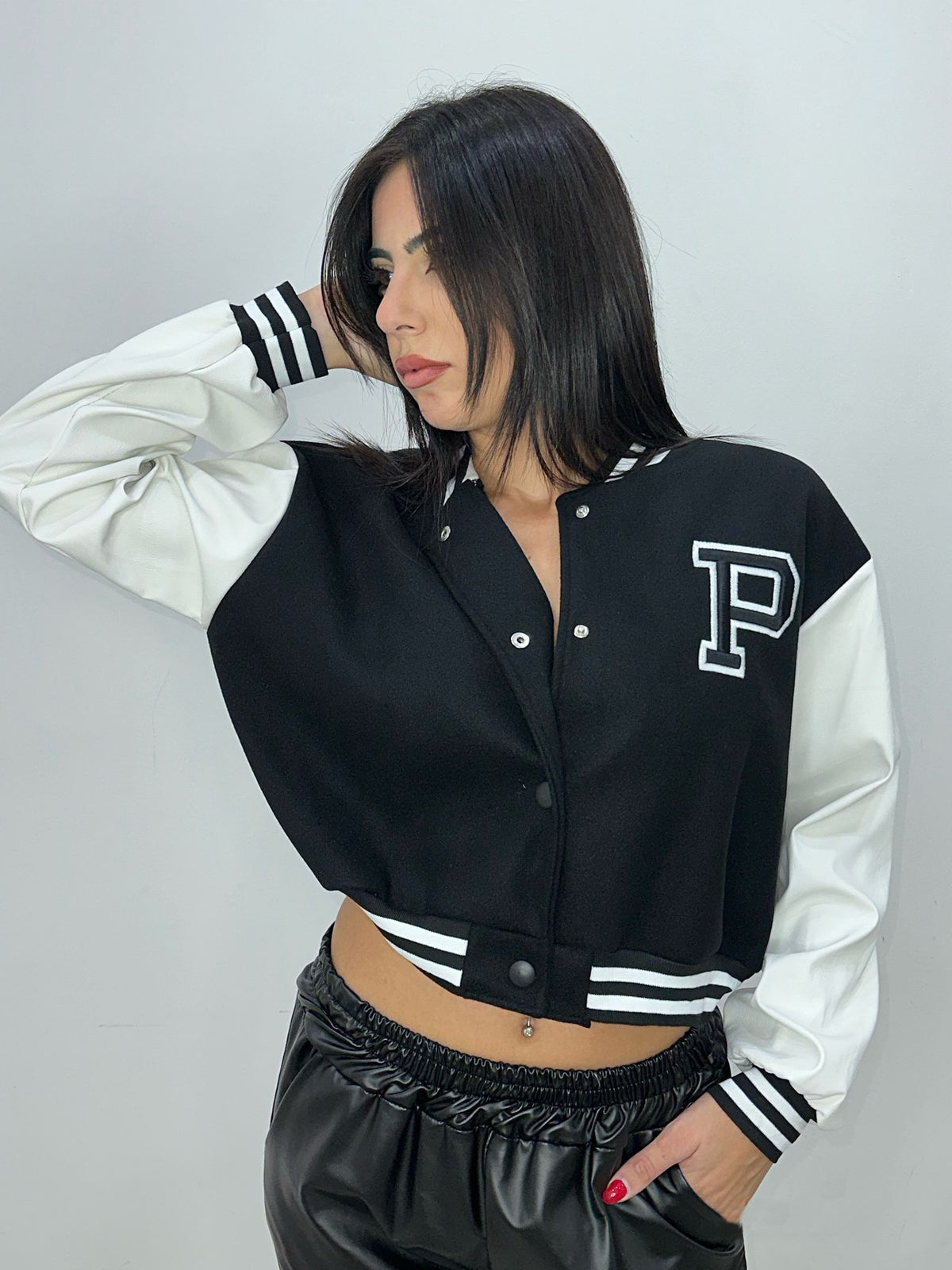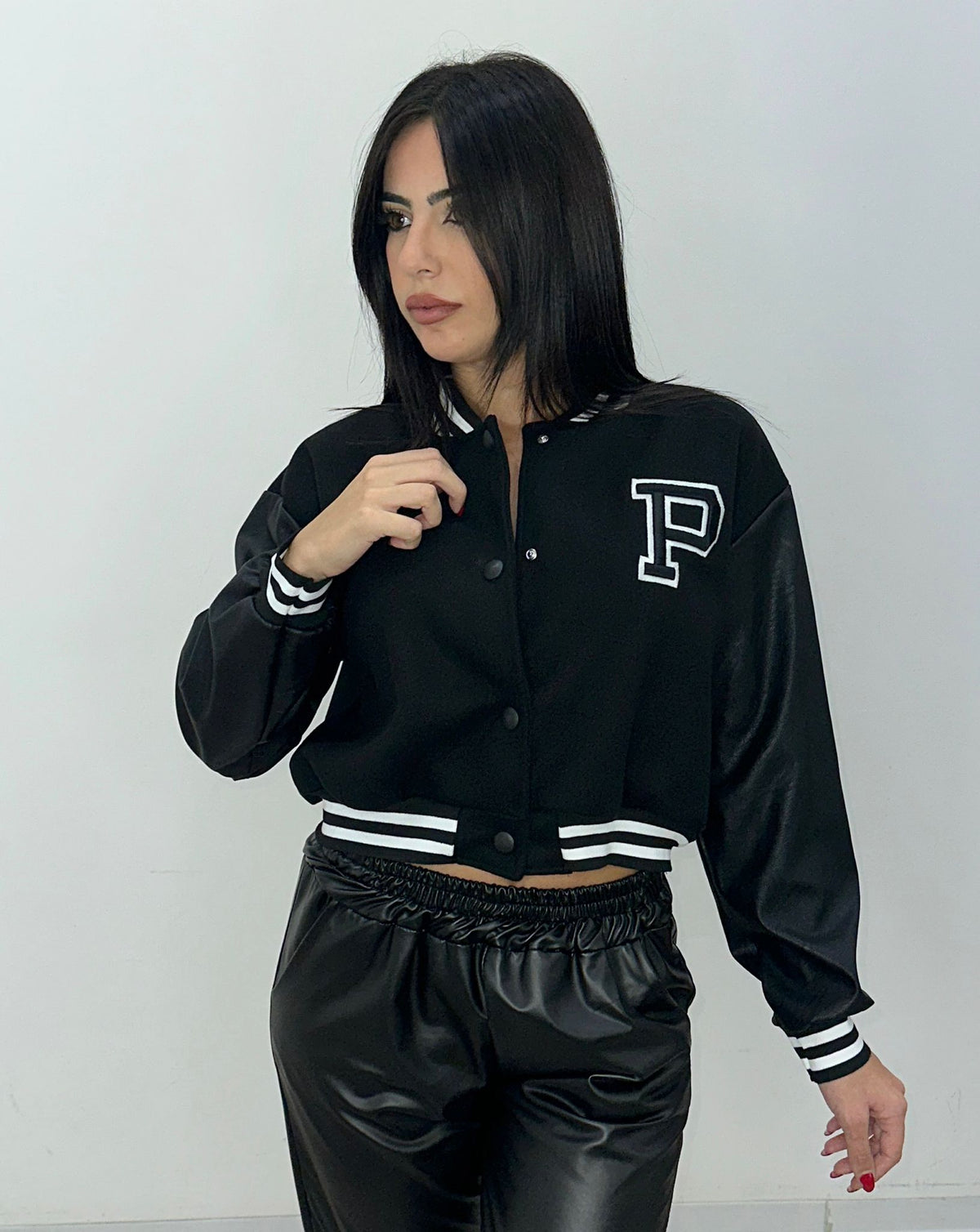 Giubbino in pile con manica in ecopelle e bottoni centrali. Fabbricato in Italia.