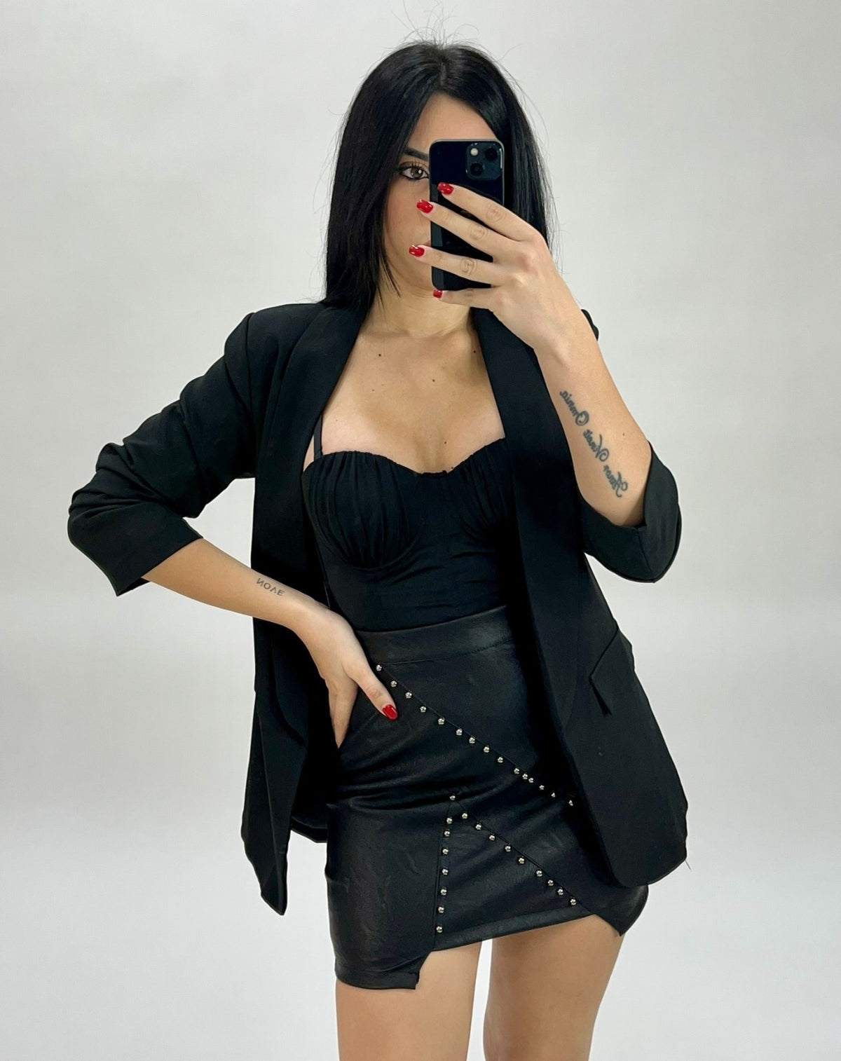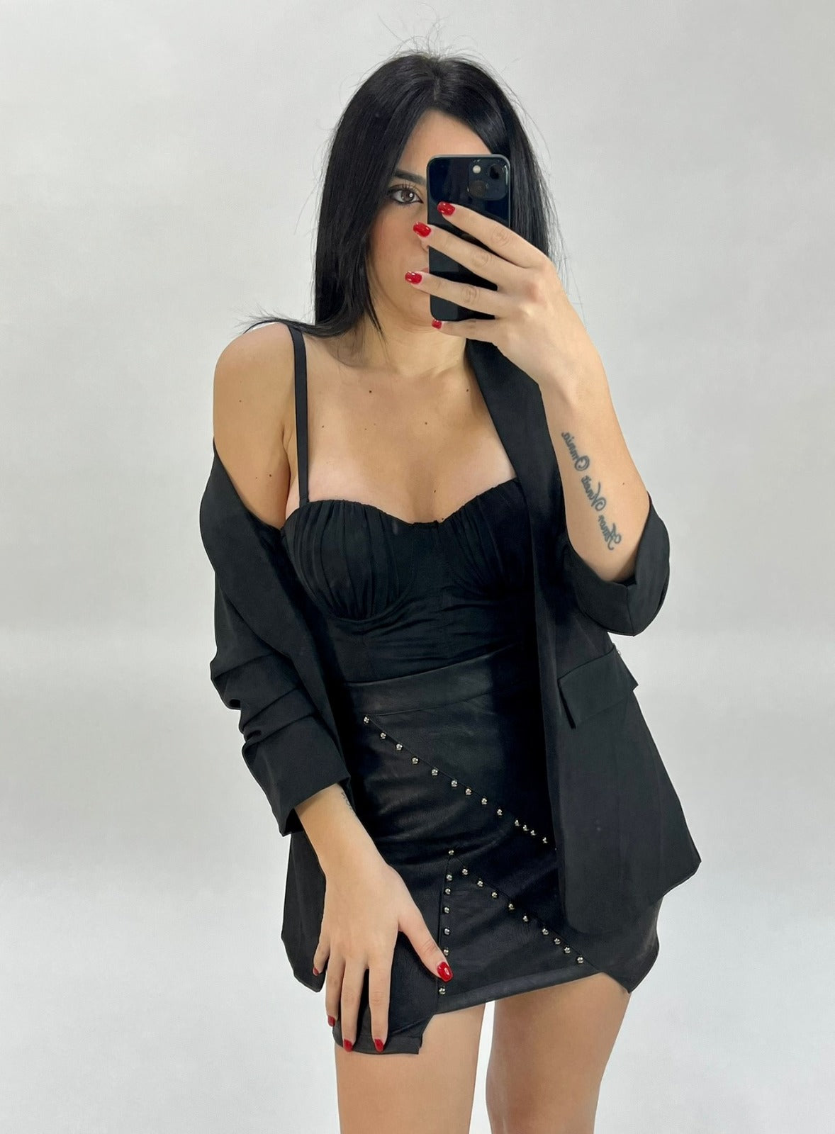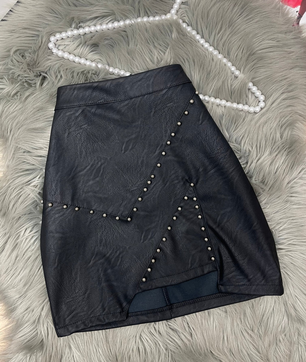 Gonna in ecopelle con borchie e chiusura con cerniera. La vestibilità della taglia risulta regolare. Fabbricato in Italia.