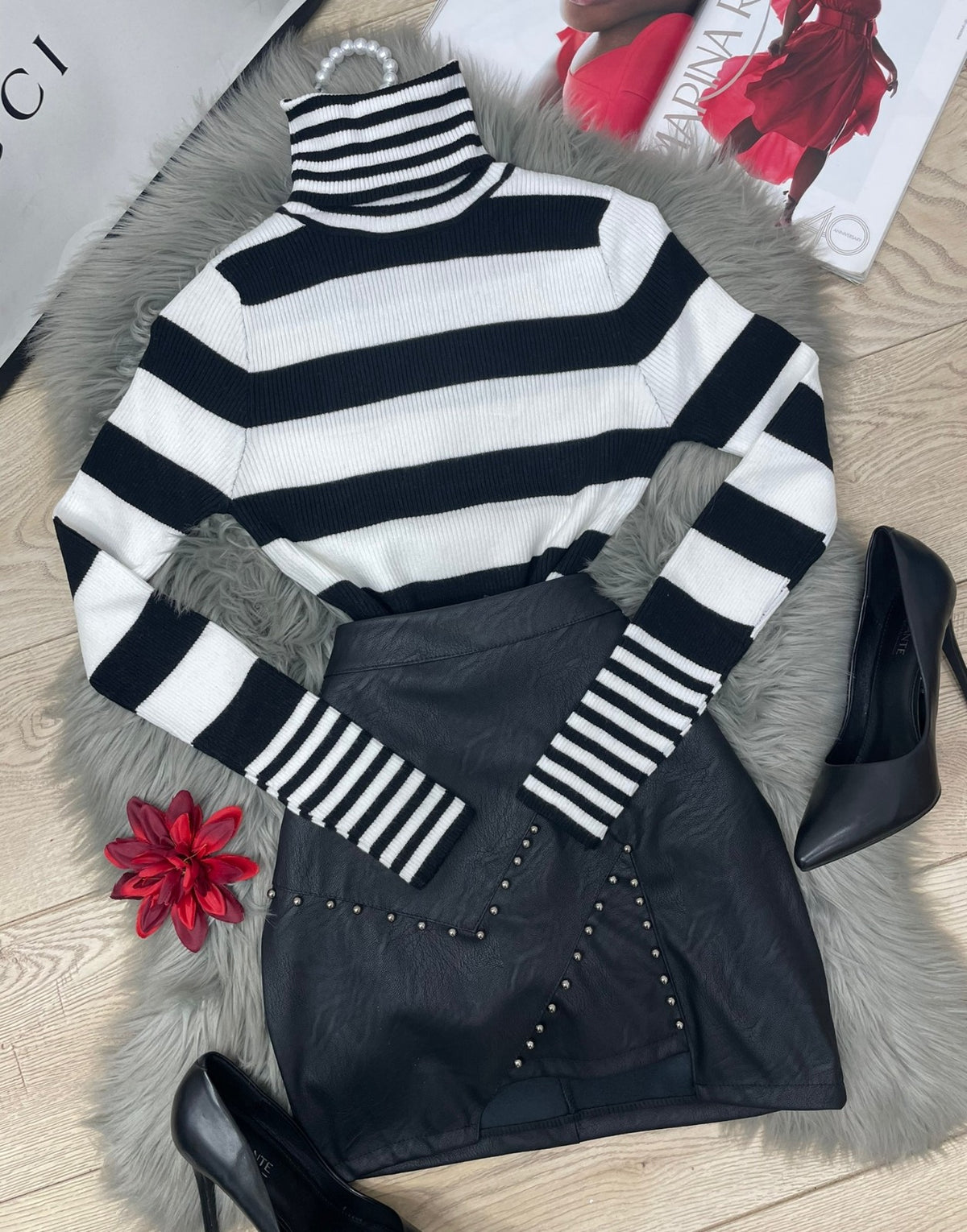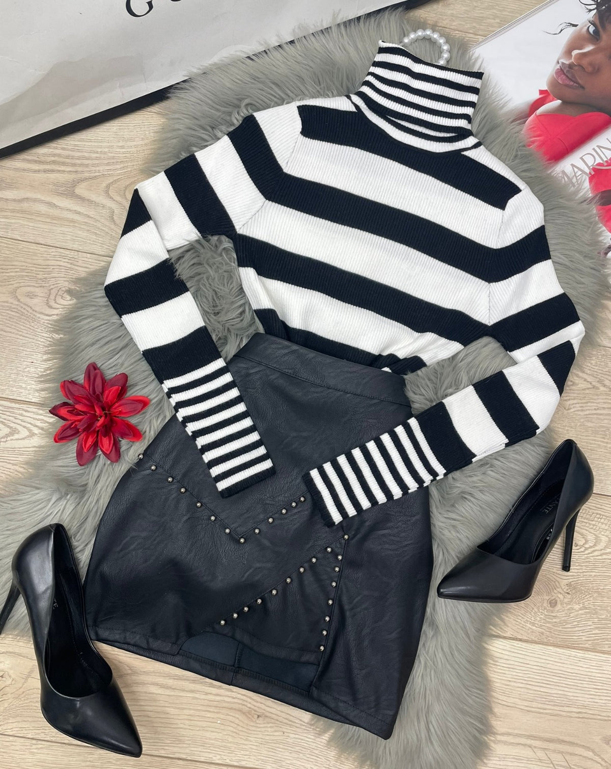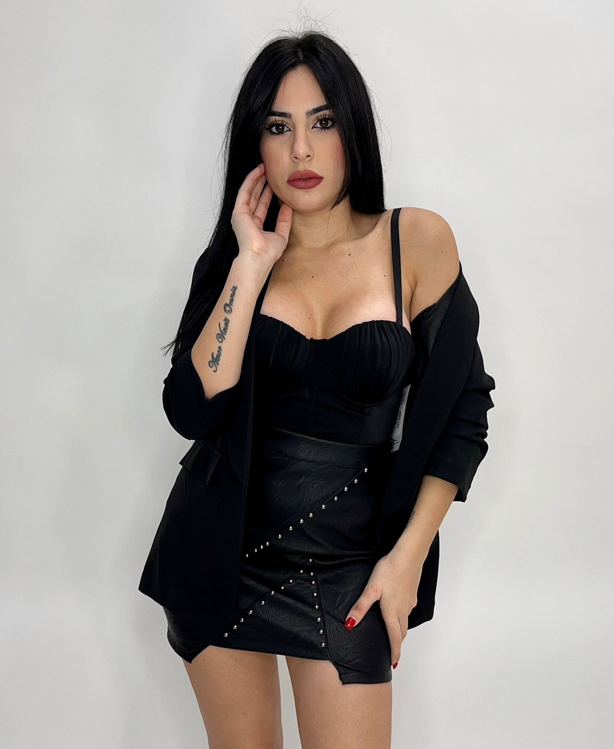 Gonna in ecopelle con borchie e chiusura con cerniera. La vestibilità della taglia risulta regolare. Fabbricato in Italia.