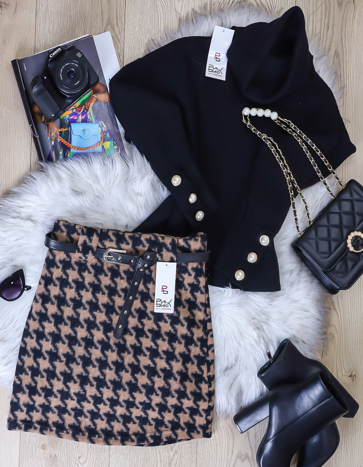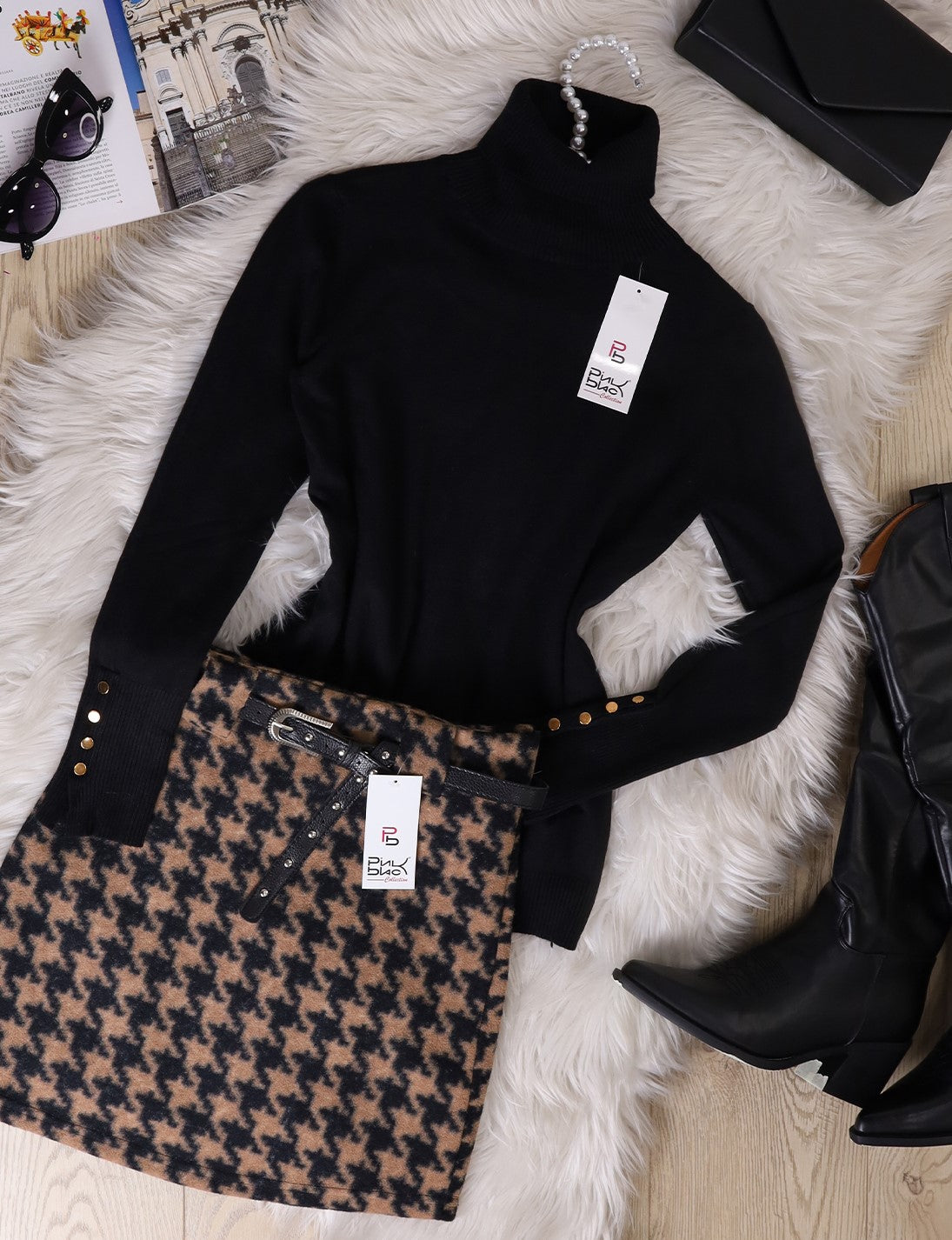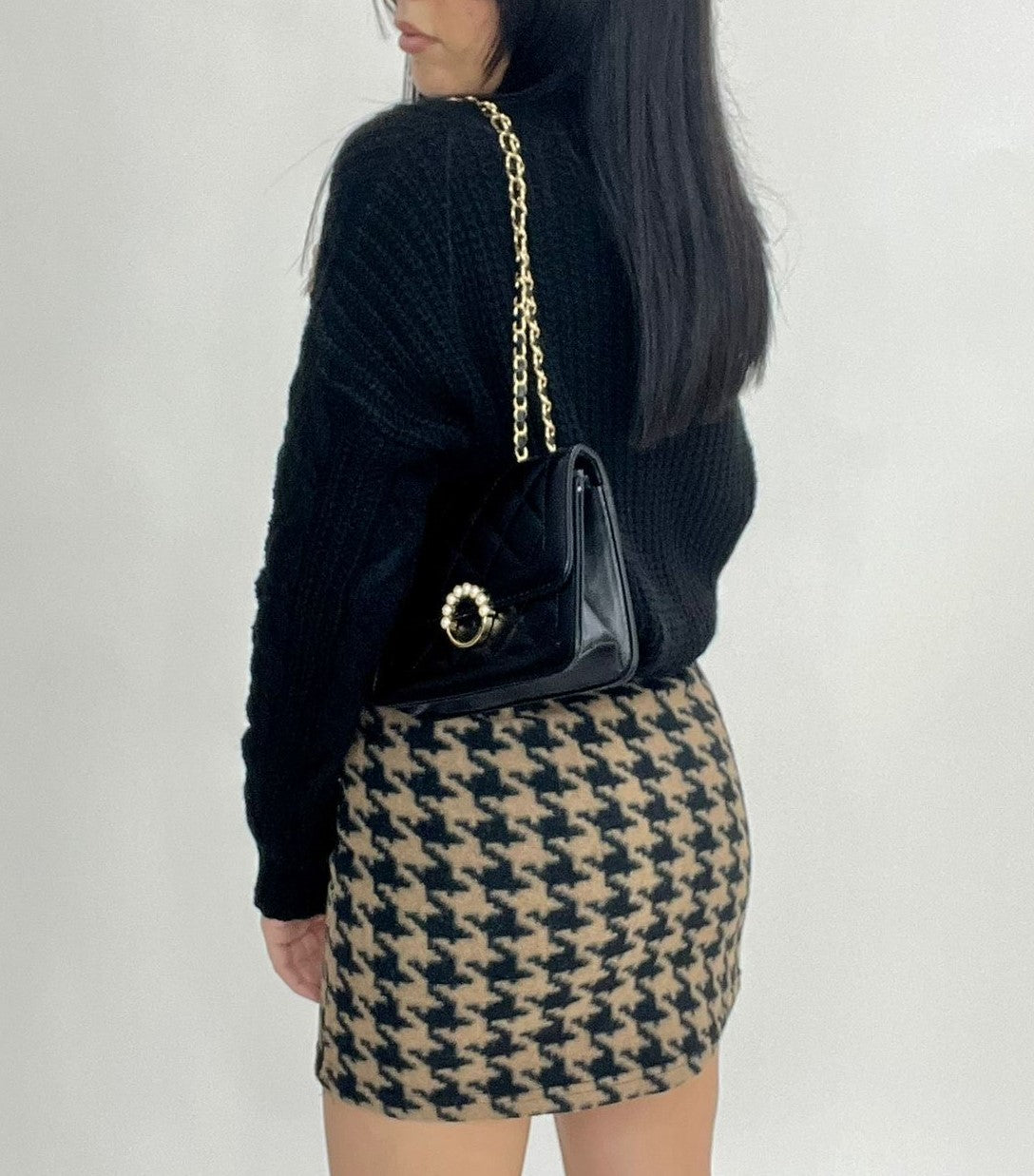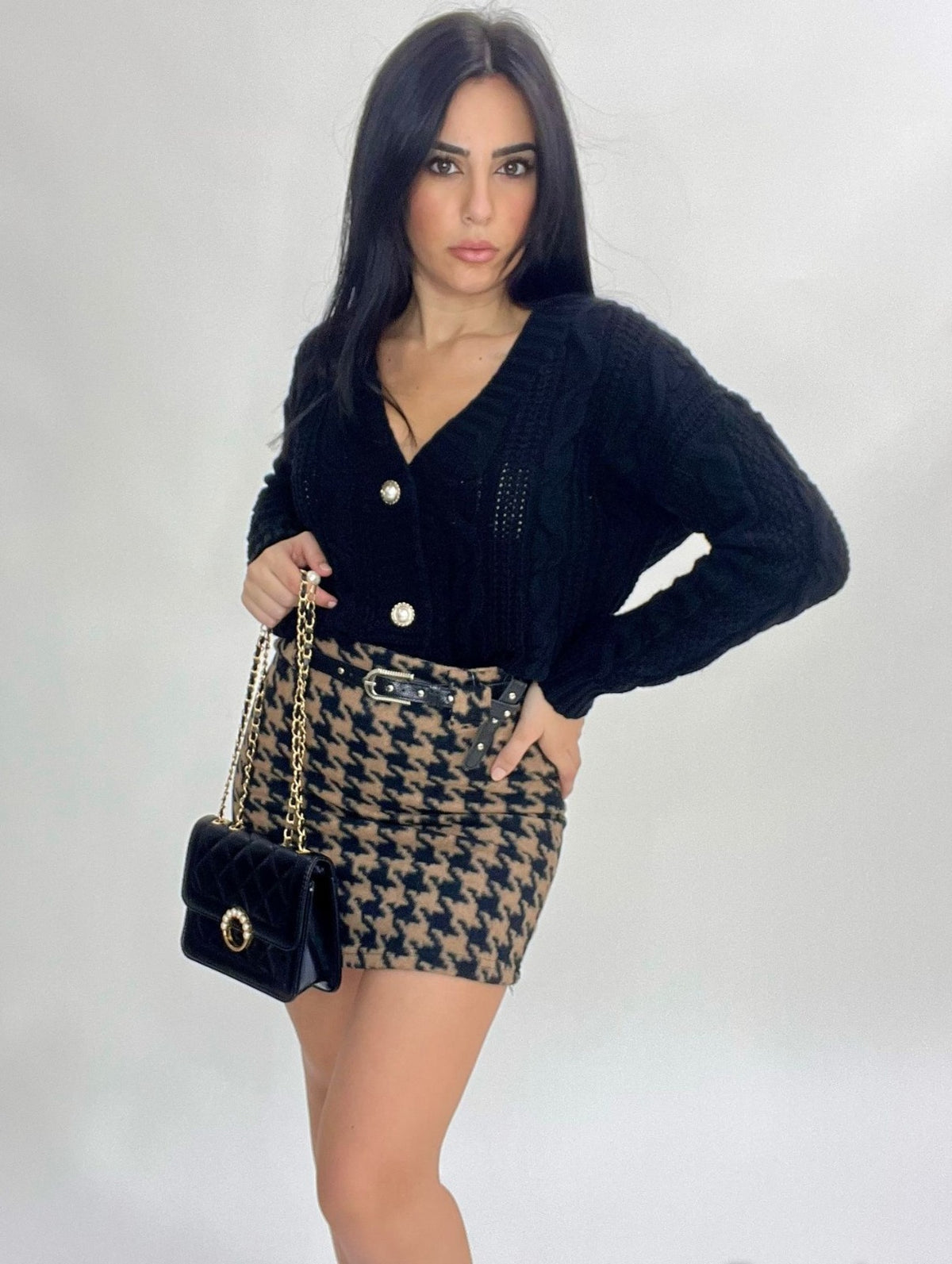 Gonna in panno a vita alta con fantasia pied de poule, cerniera e cintura inclusa. La vestibilità delle taglie risulta regolare. Fabbricato in Italia.