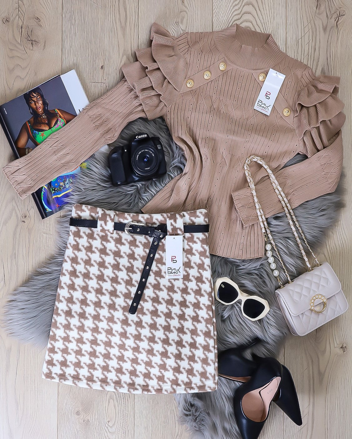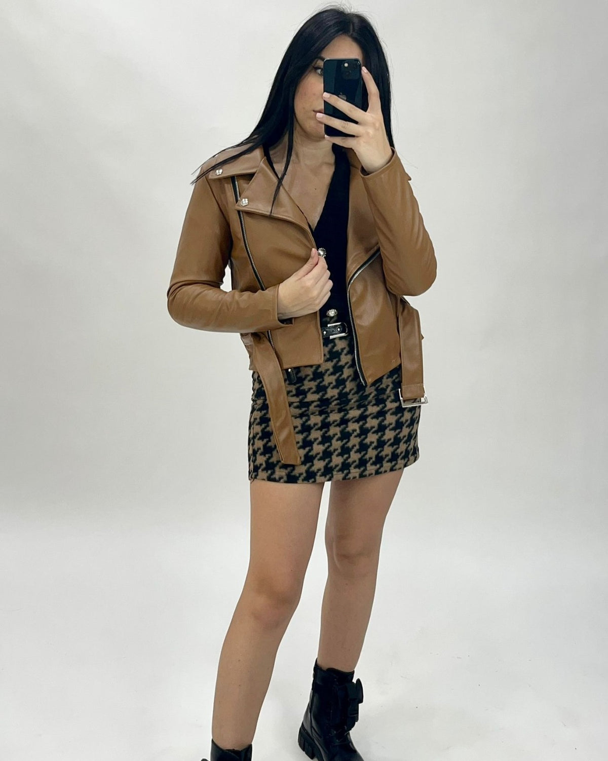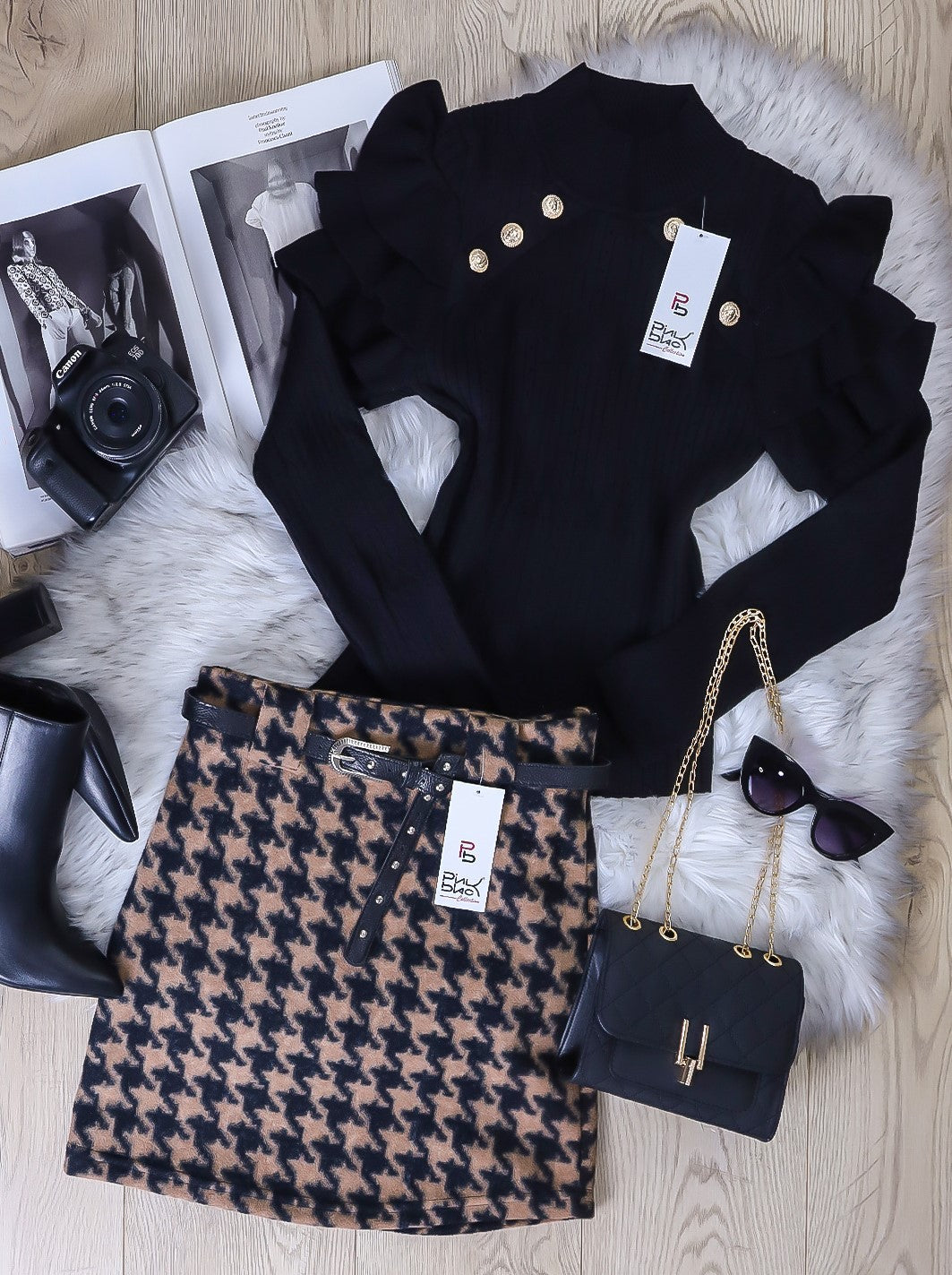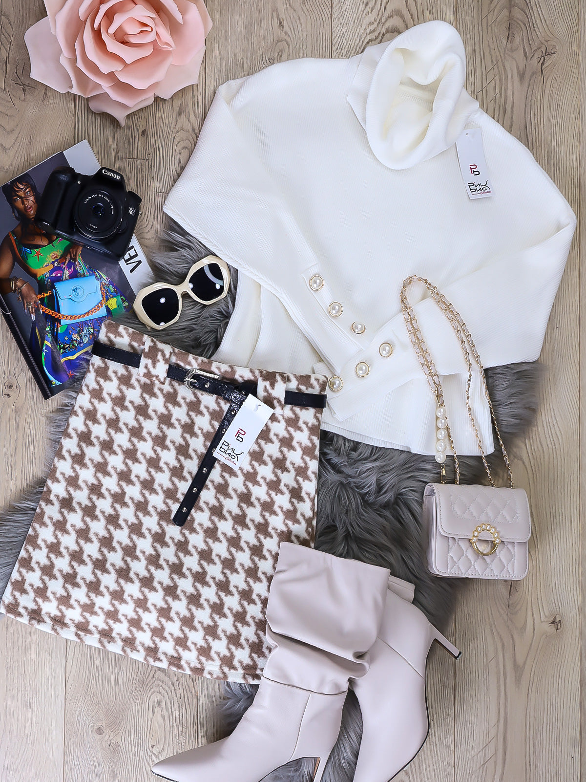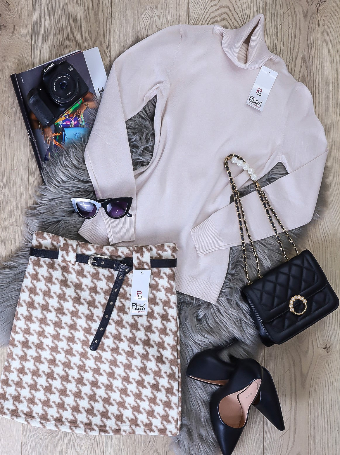 Gonna in panno a vita alta con fantasia pied de poule, cerniera e cintura inclusa. La vestibilità delle taglie risulta regolare. Fabbricato in Italia.