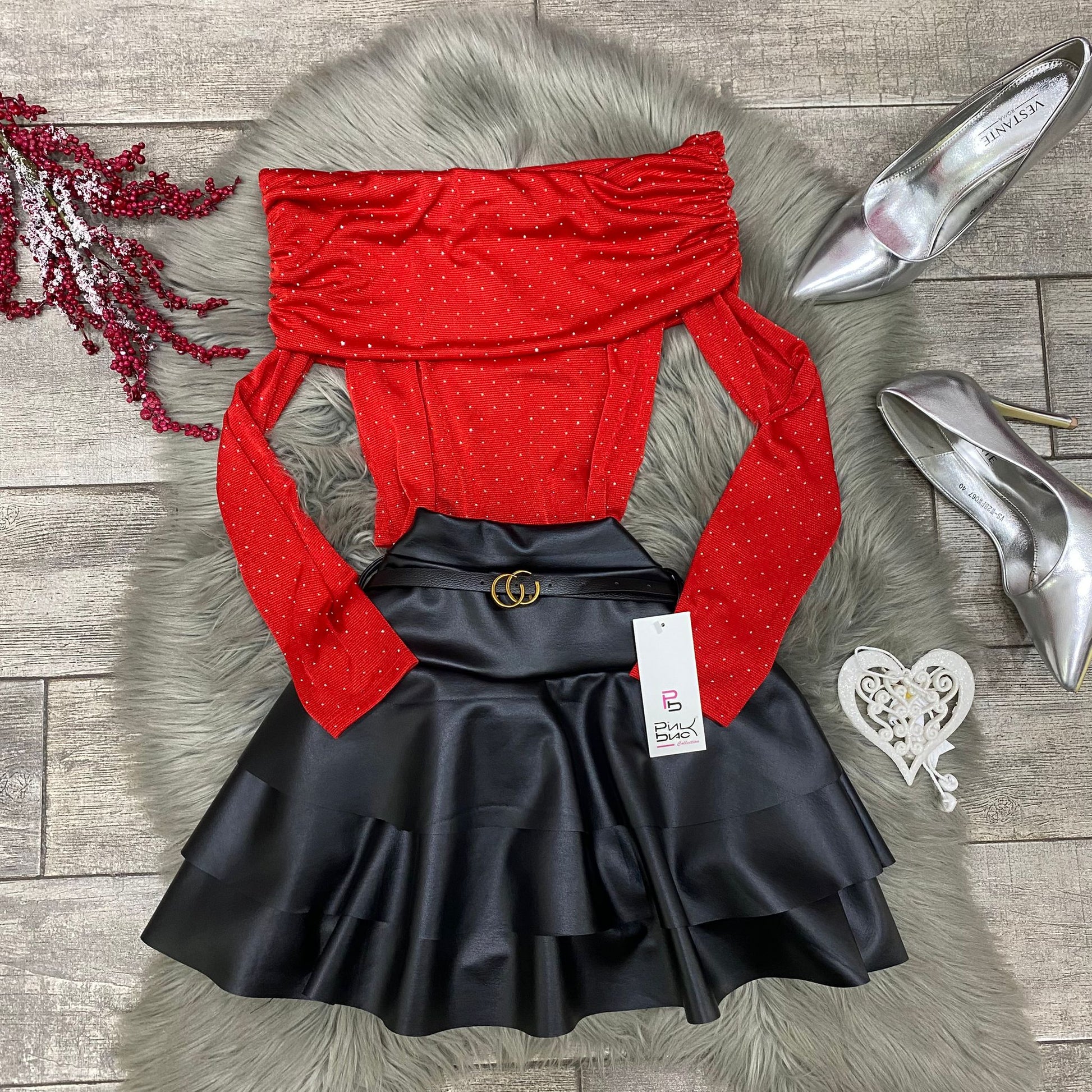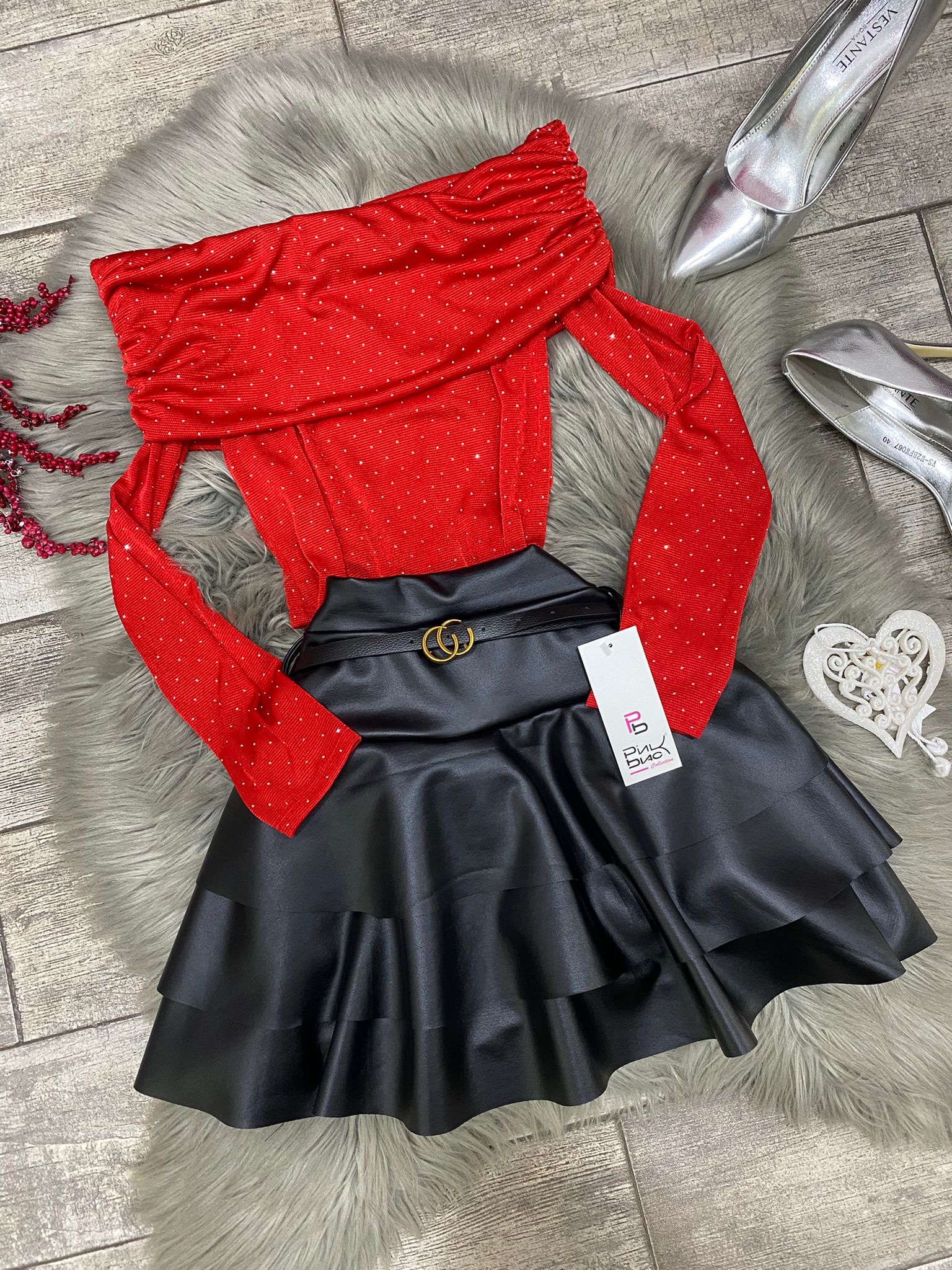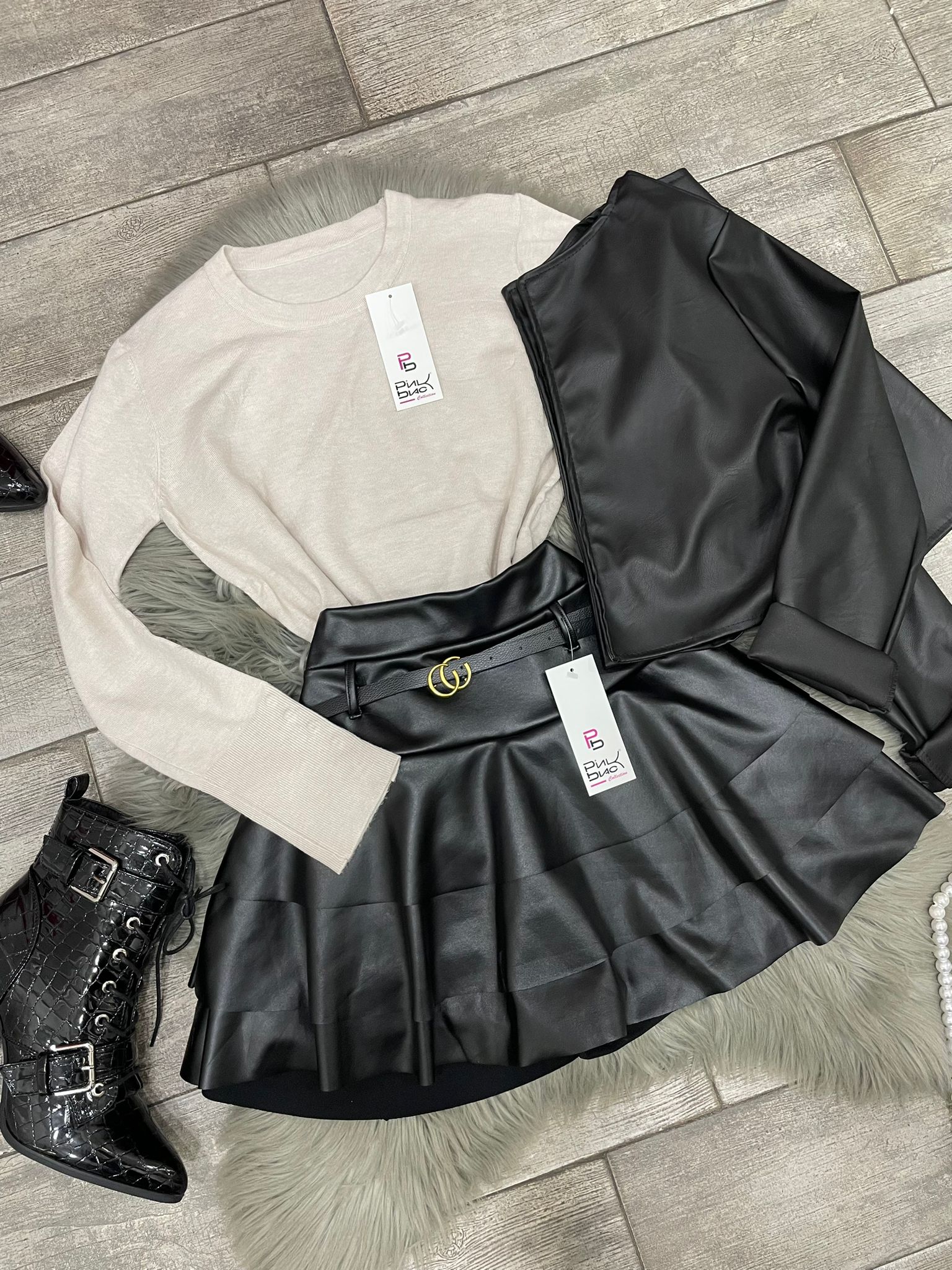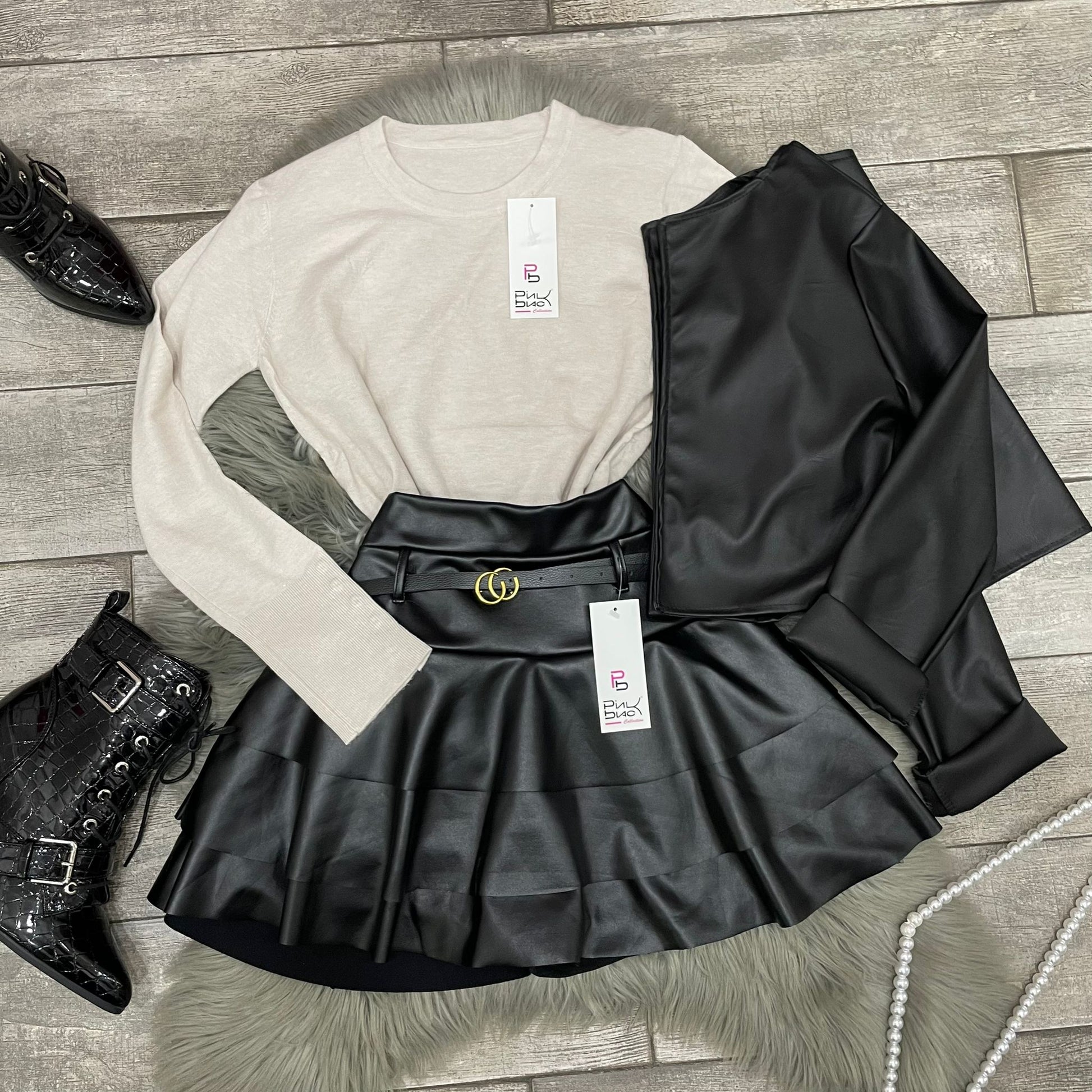 Pantagonna in ecopelle con balze e cinturino incluso.