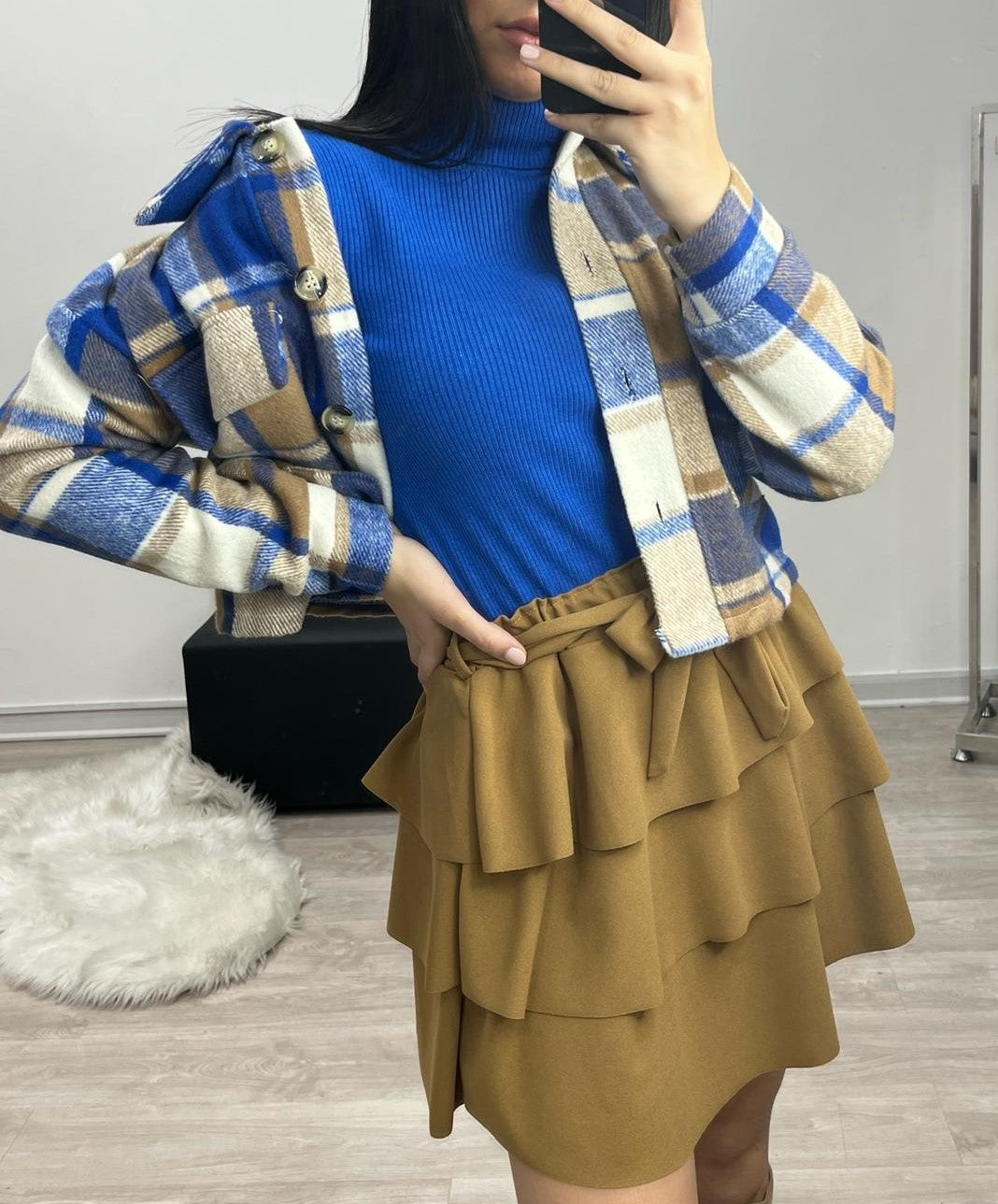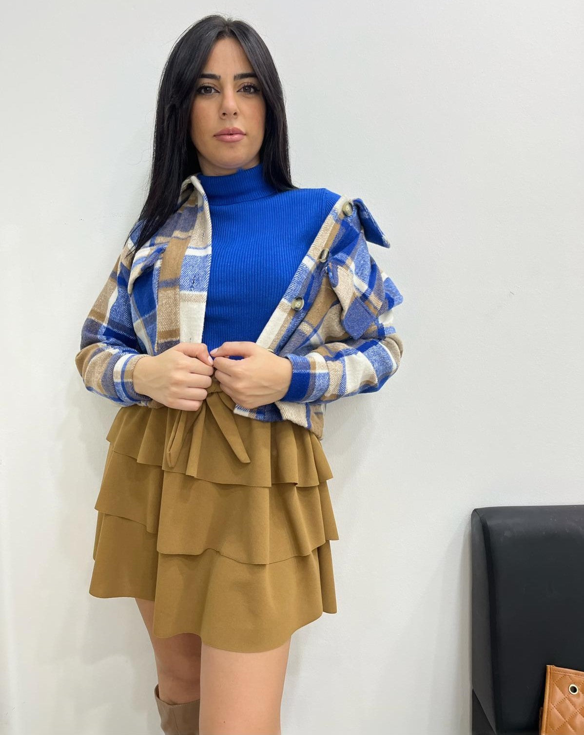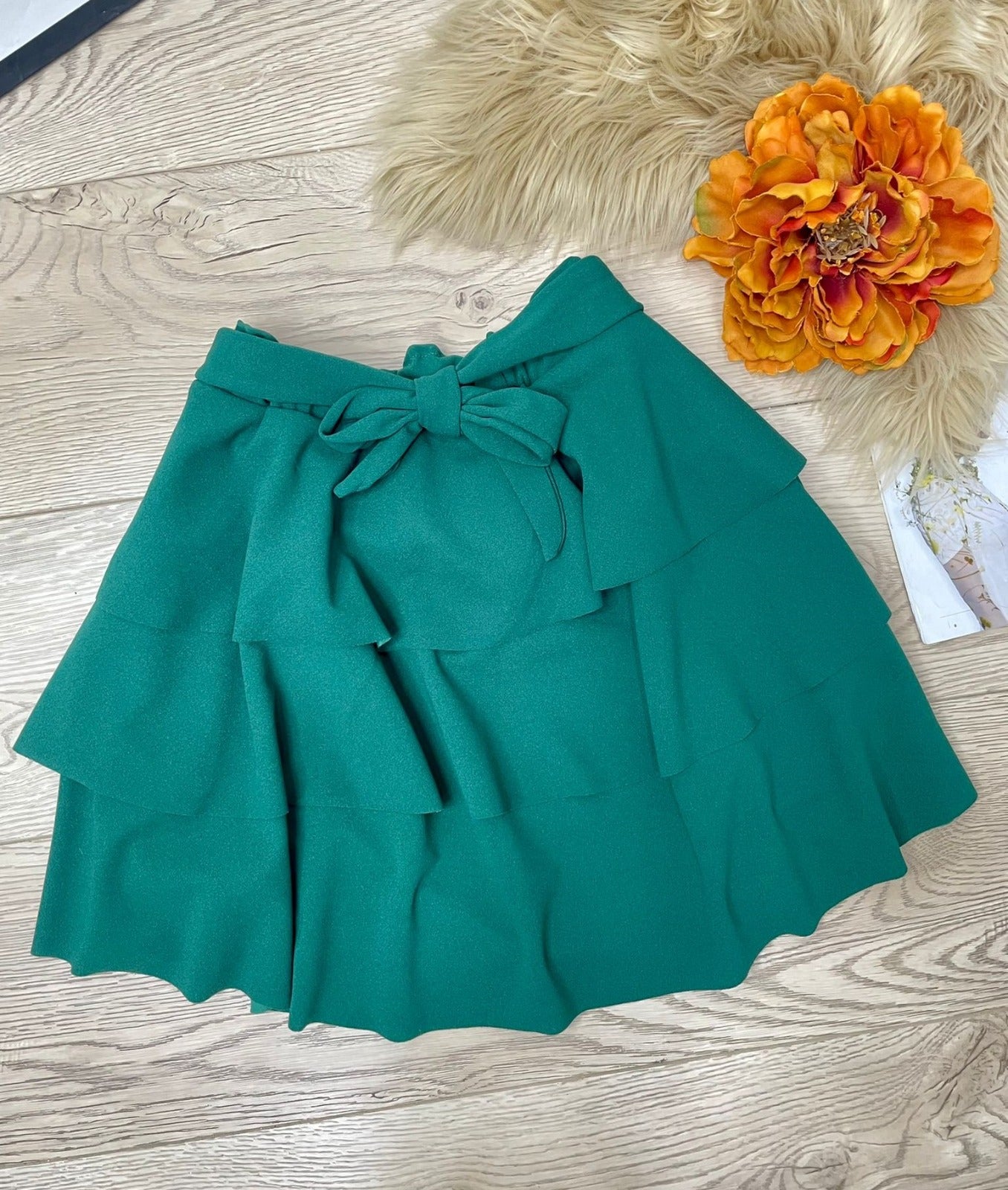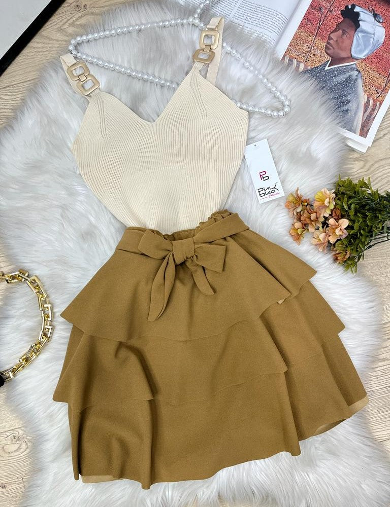 Gonna in tessuto scuba crepe con fascia elastica, balze e cintura inclusa. Fabbricato in Italia.