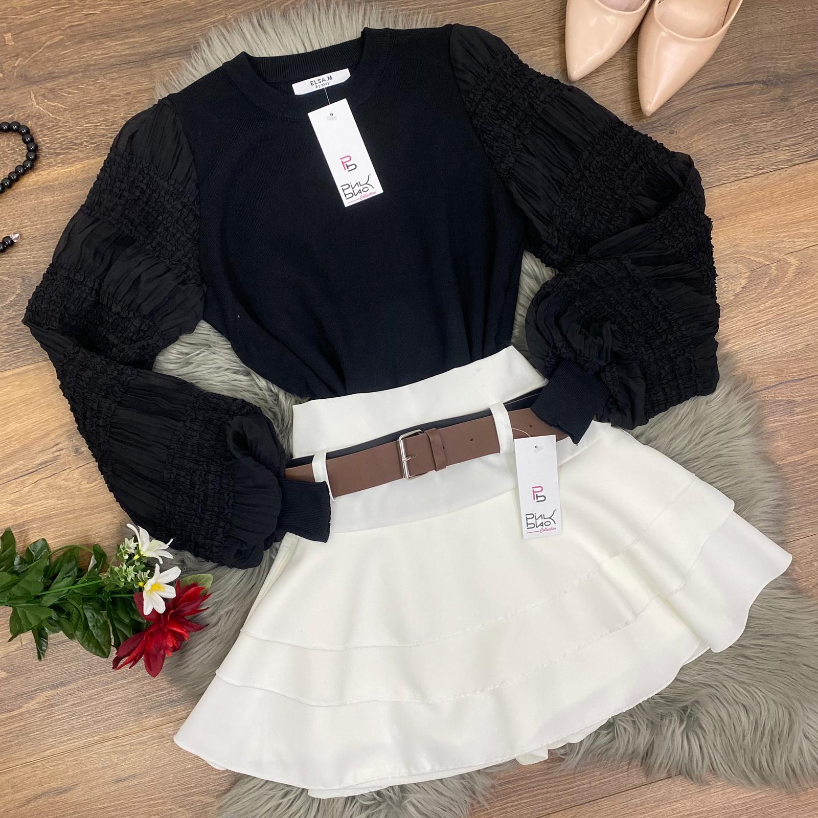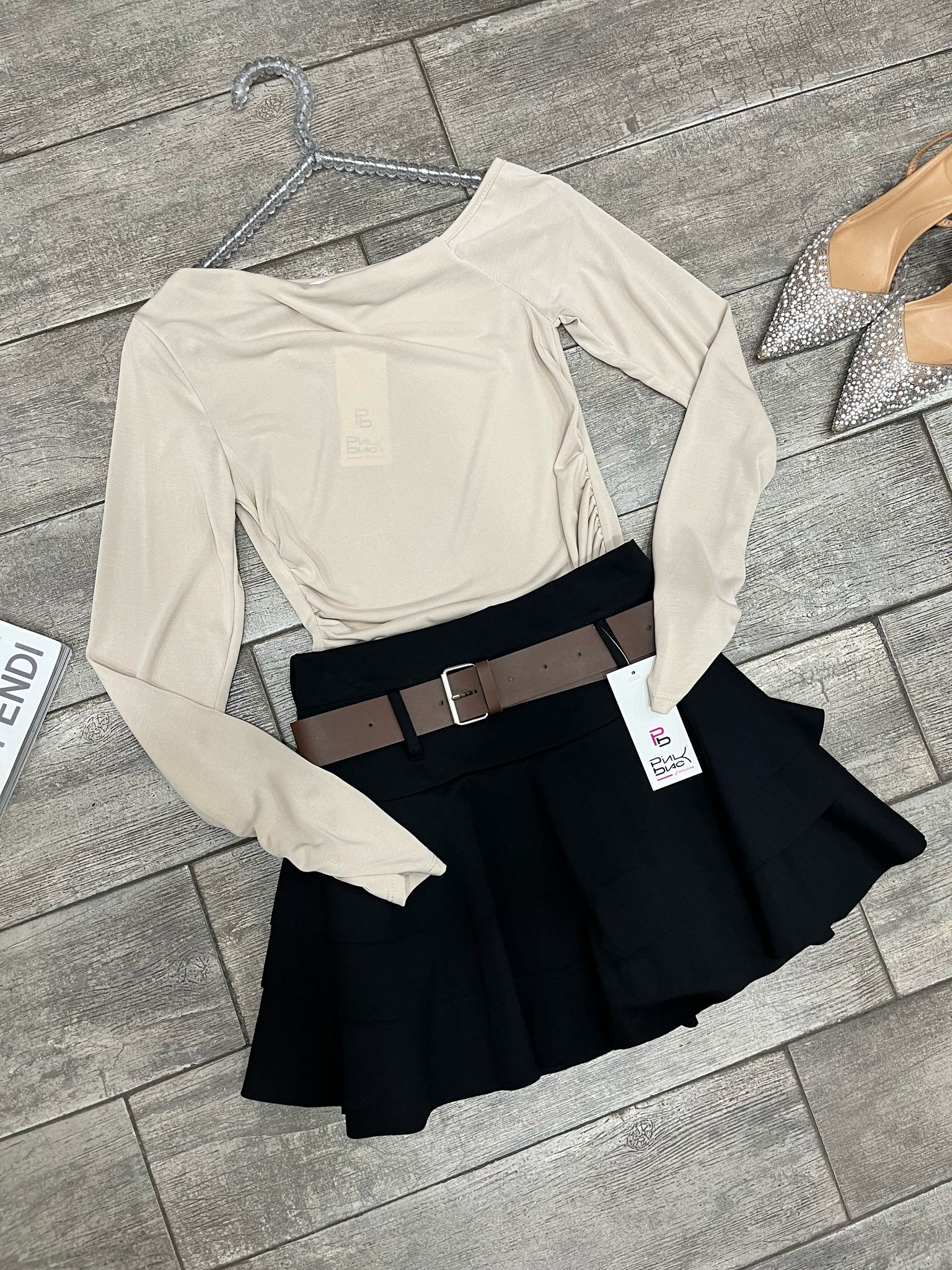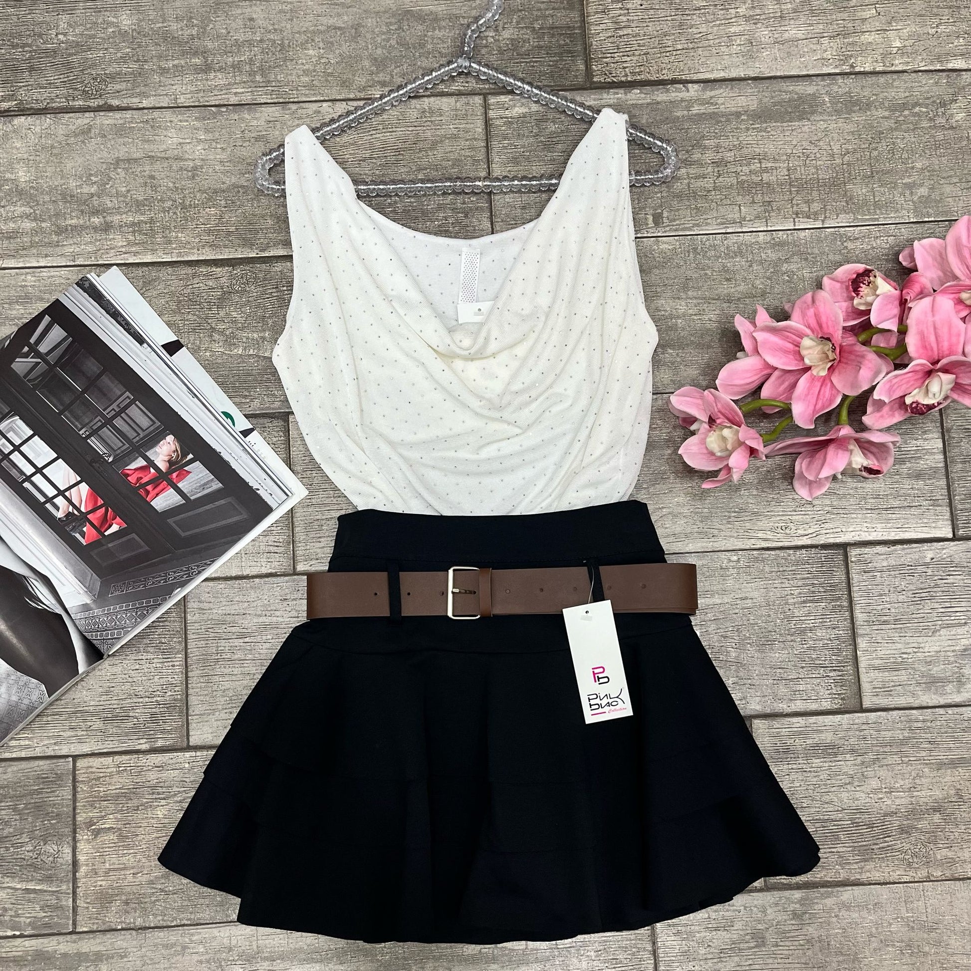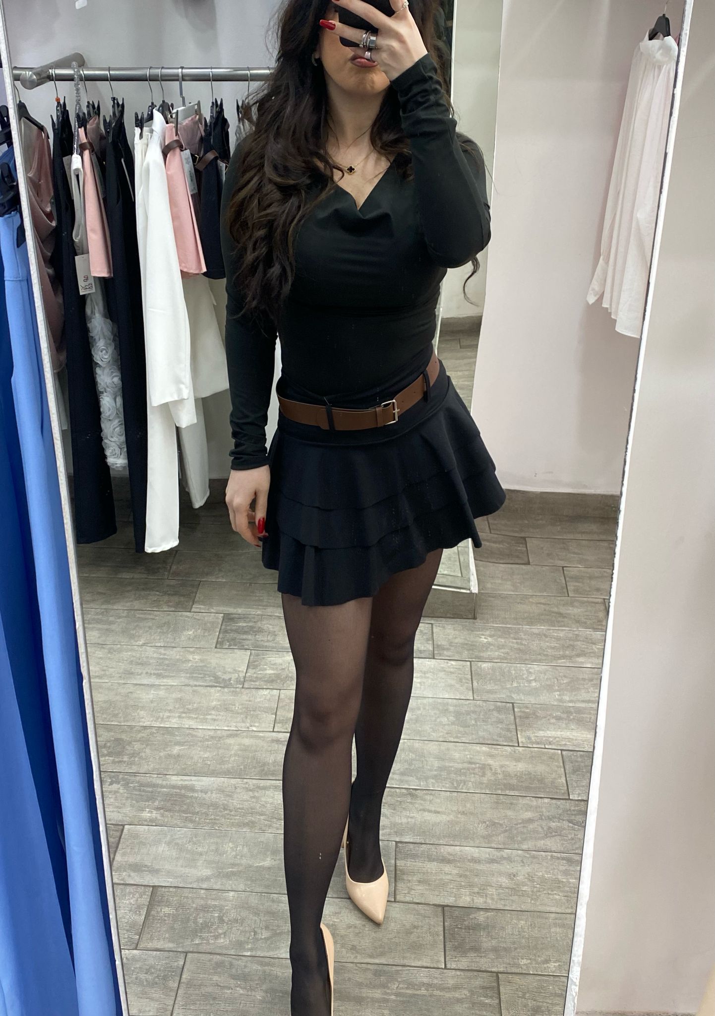 Pantagonna in tessuto scuba crepe con elastico sul retro in vita, balze e cintura inclusa.
