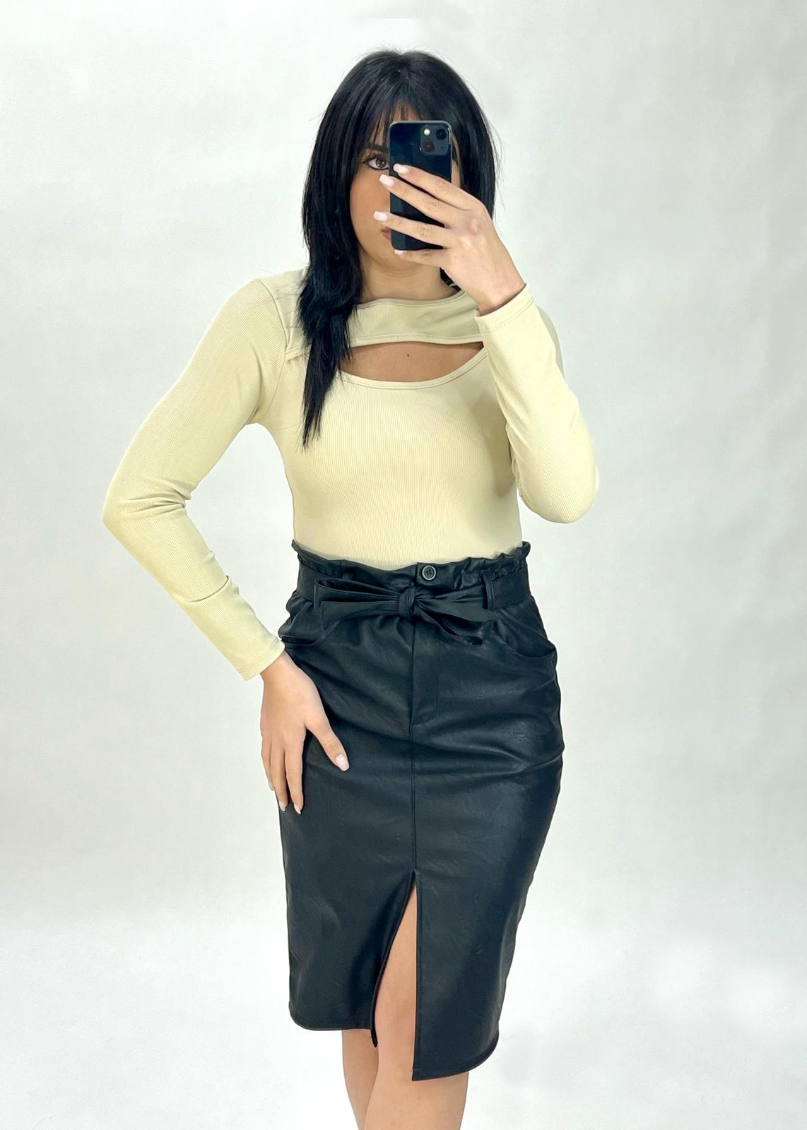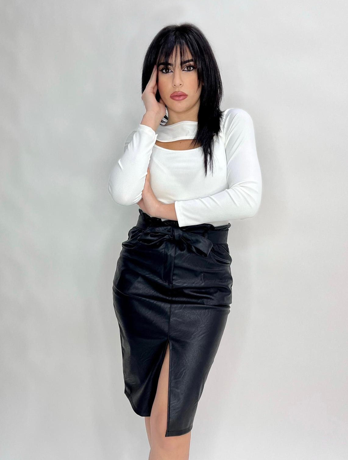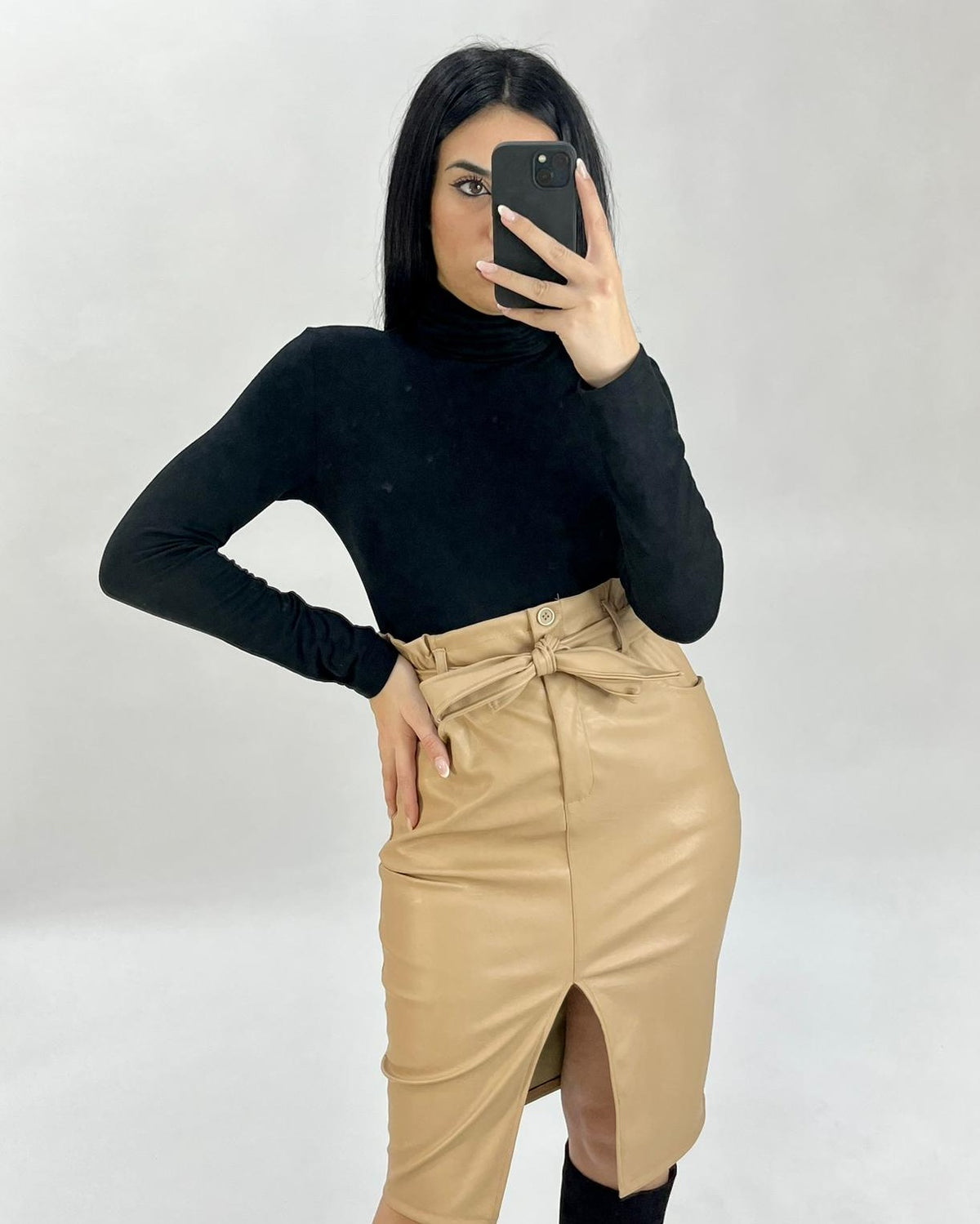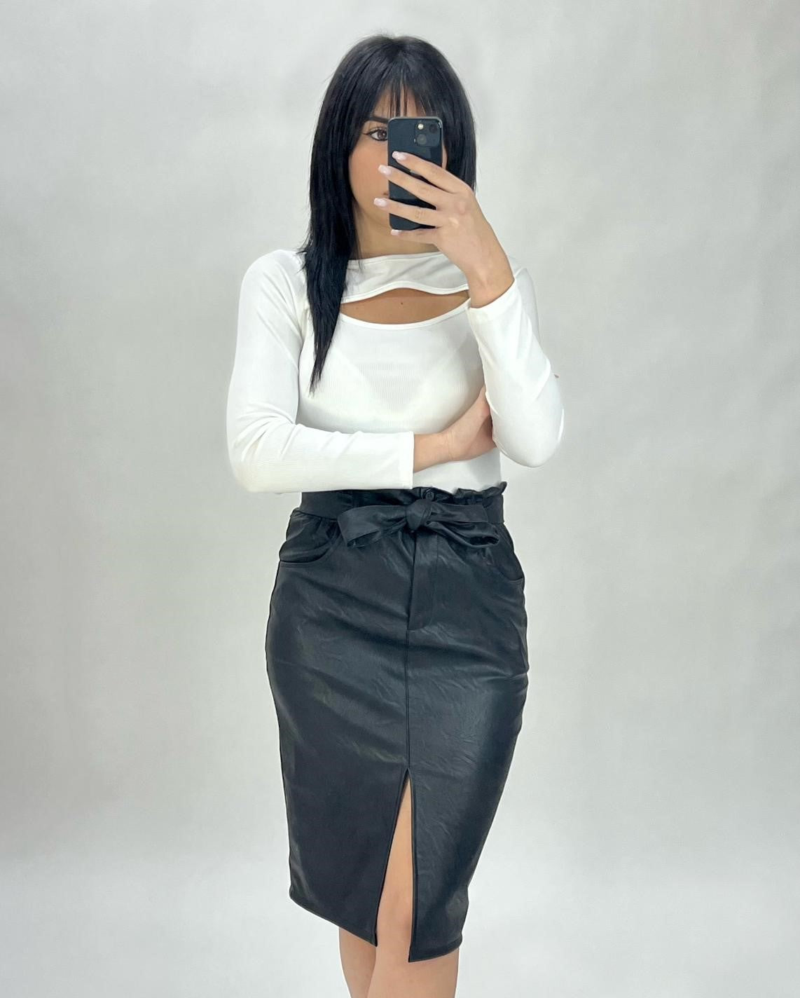 Gonna longuette in ecopelle con elastico in vita ondulato, bottoni, tasche, spacco centrale e cintura inclusa. La vestibilità delle taglie risulta regolare. Fabbricato in Italia.