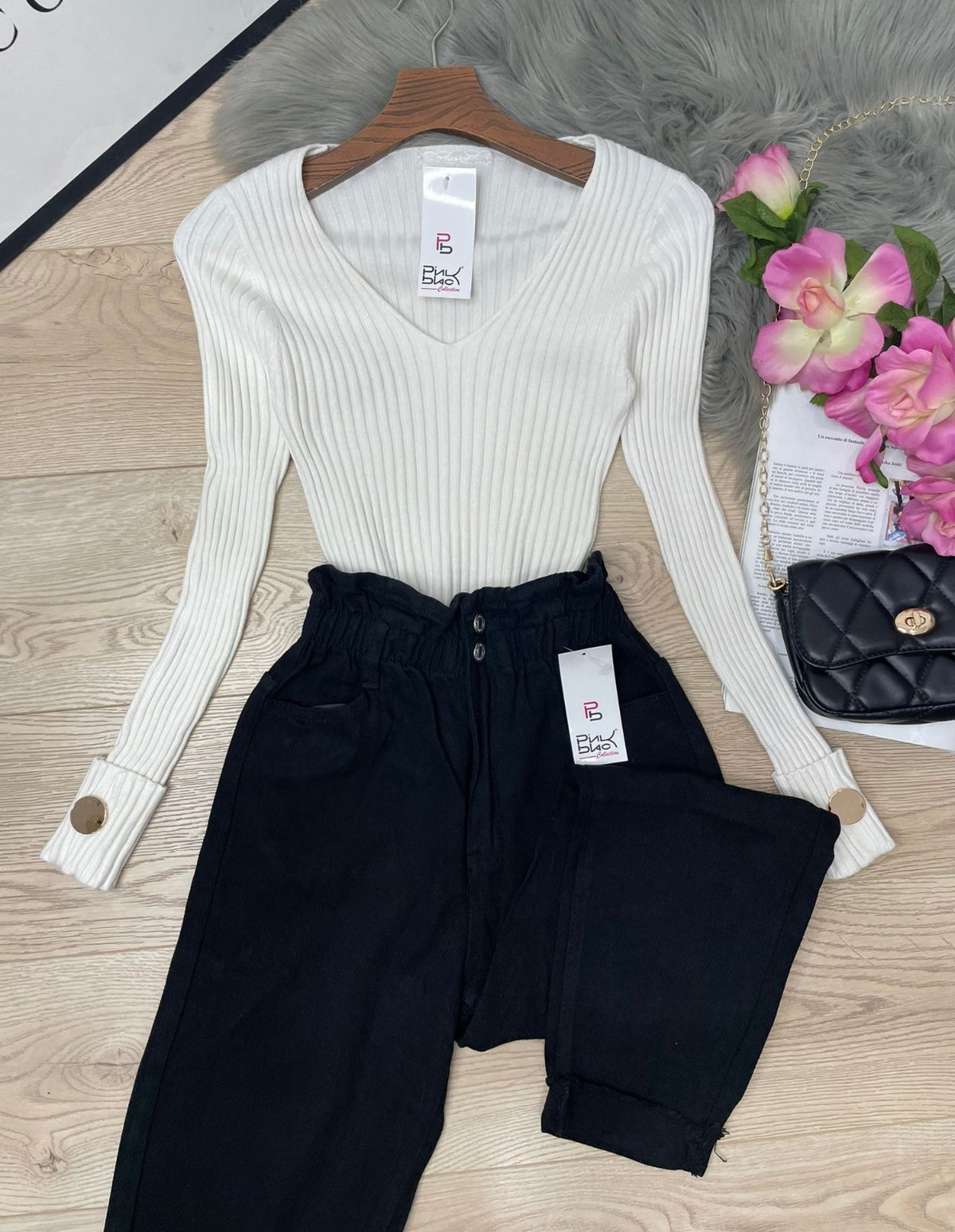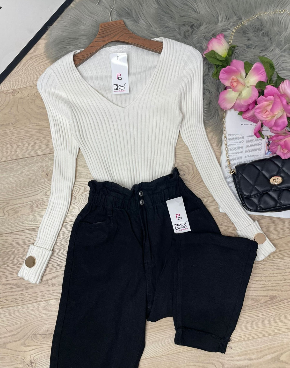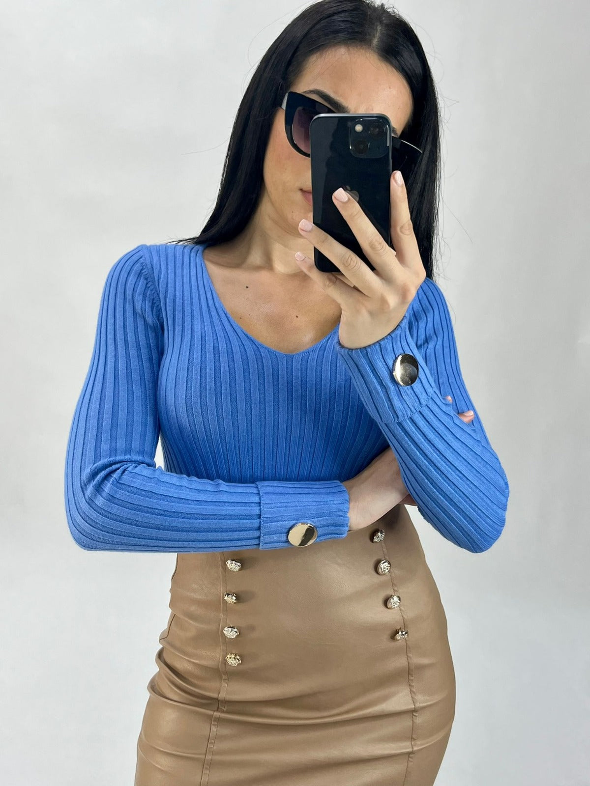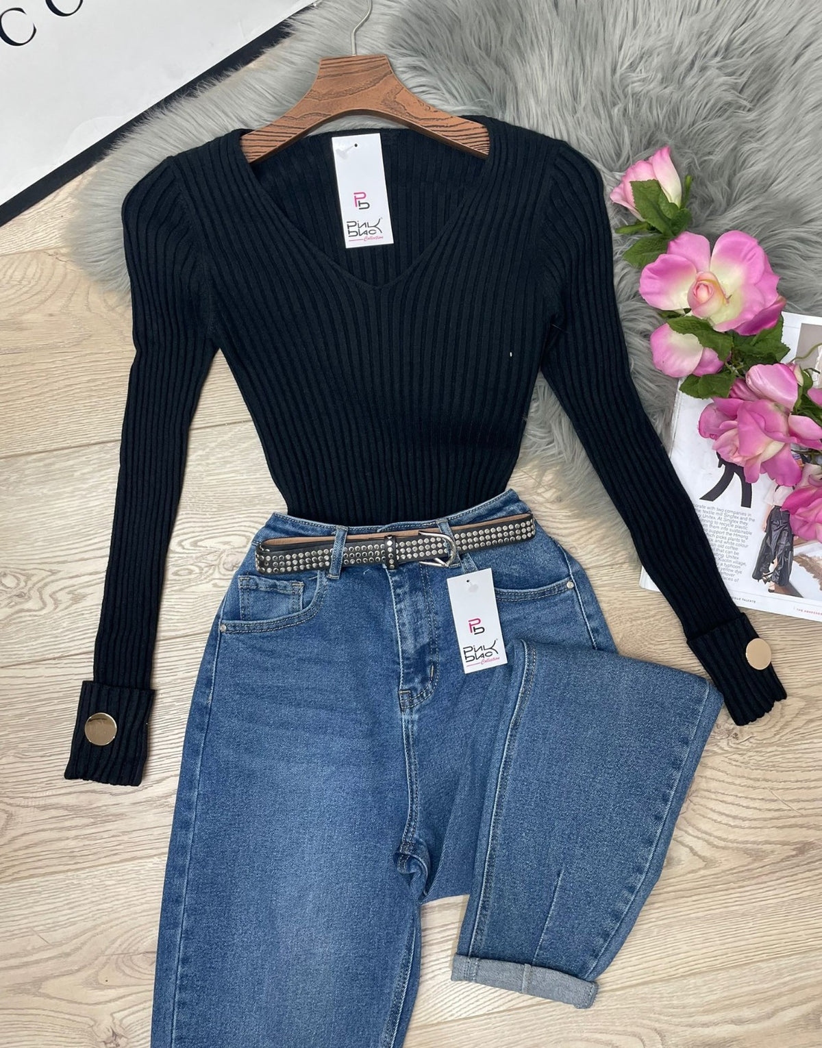 Maglia a costine con manica lunga con risvolto e bottone. Fabbricato in Italia.