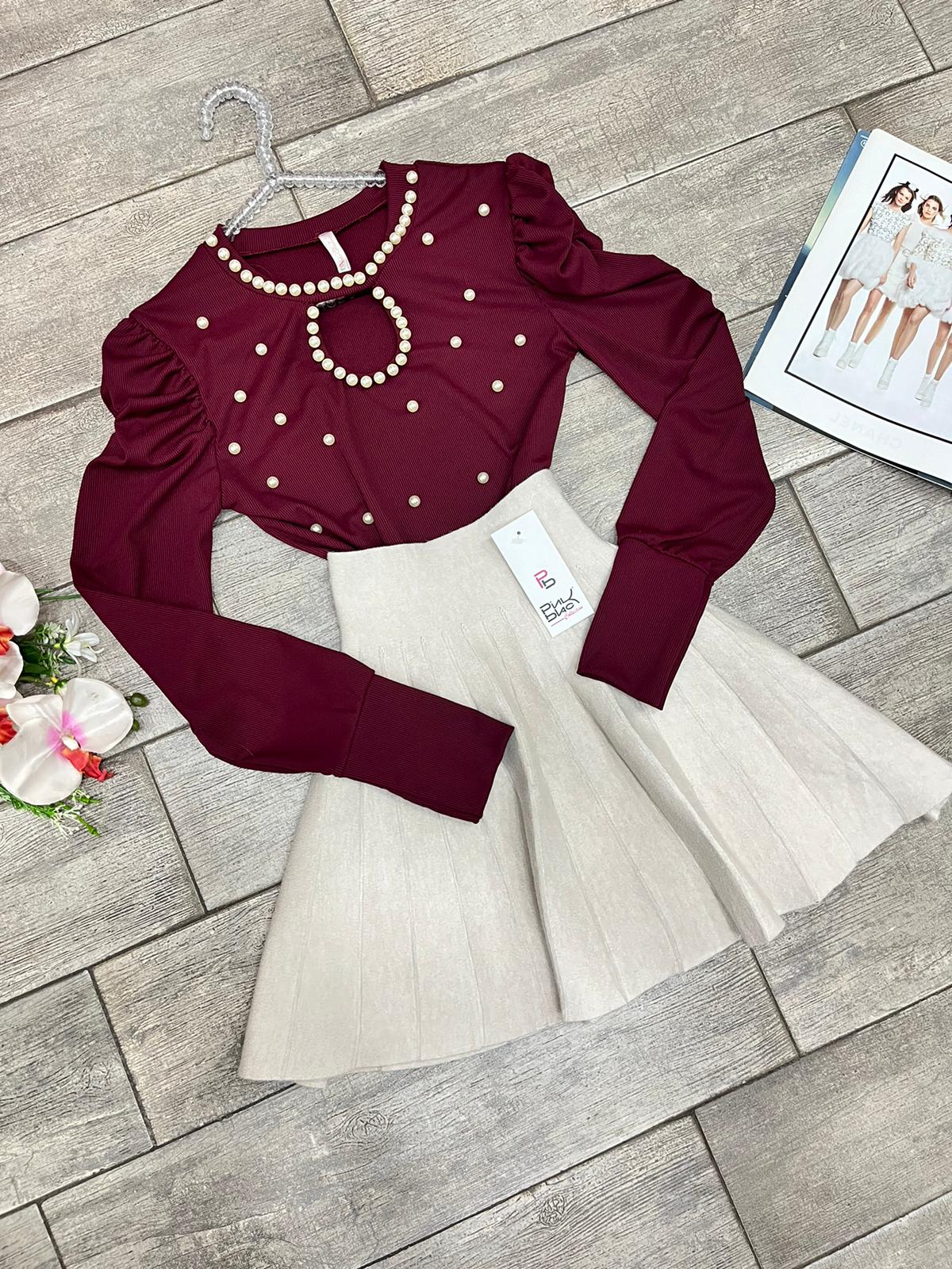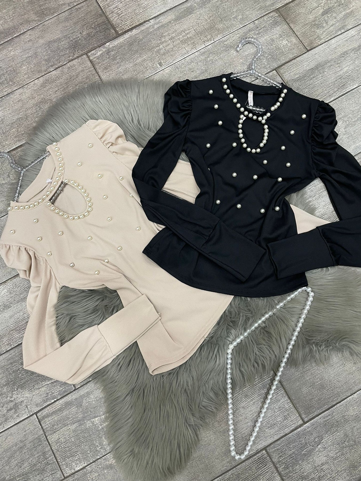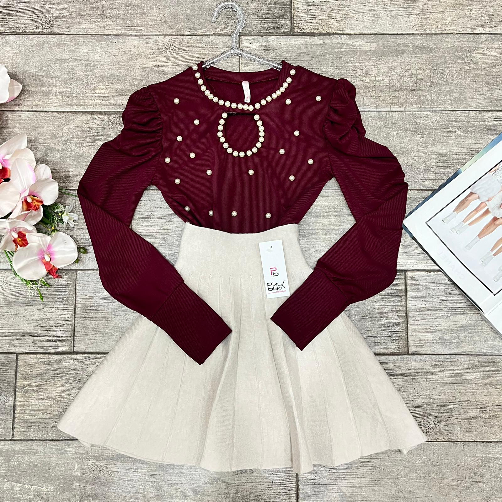 Maglia a costine in tessuto elasticizzato con applicazioni di perle in rilievo.