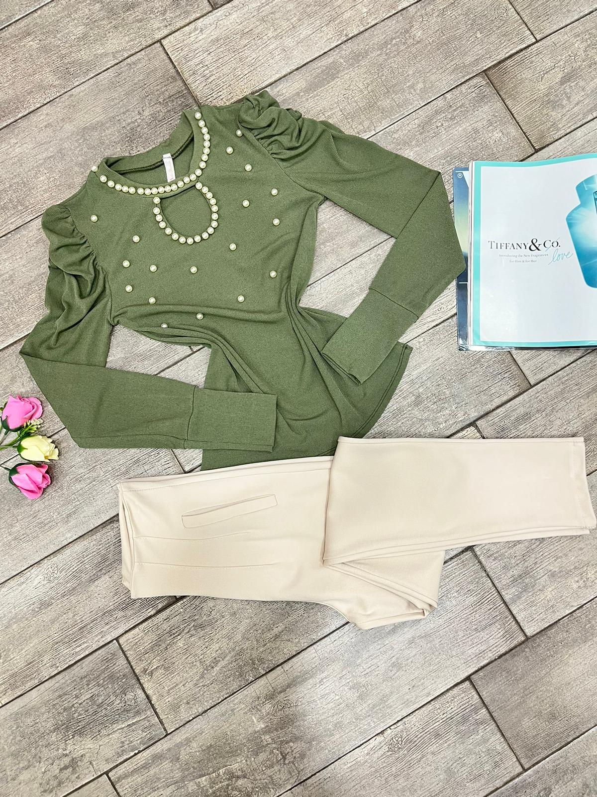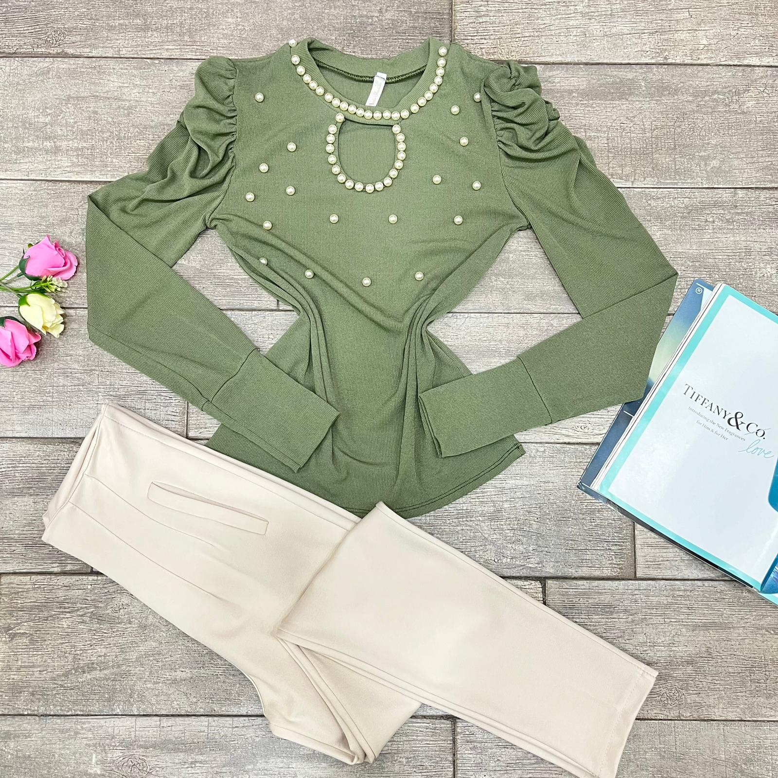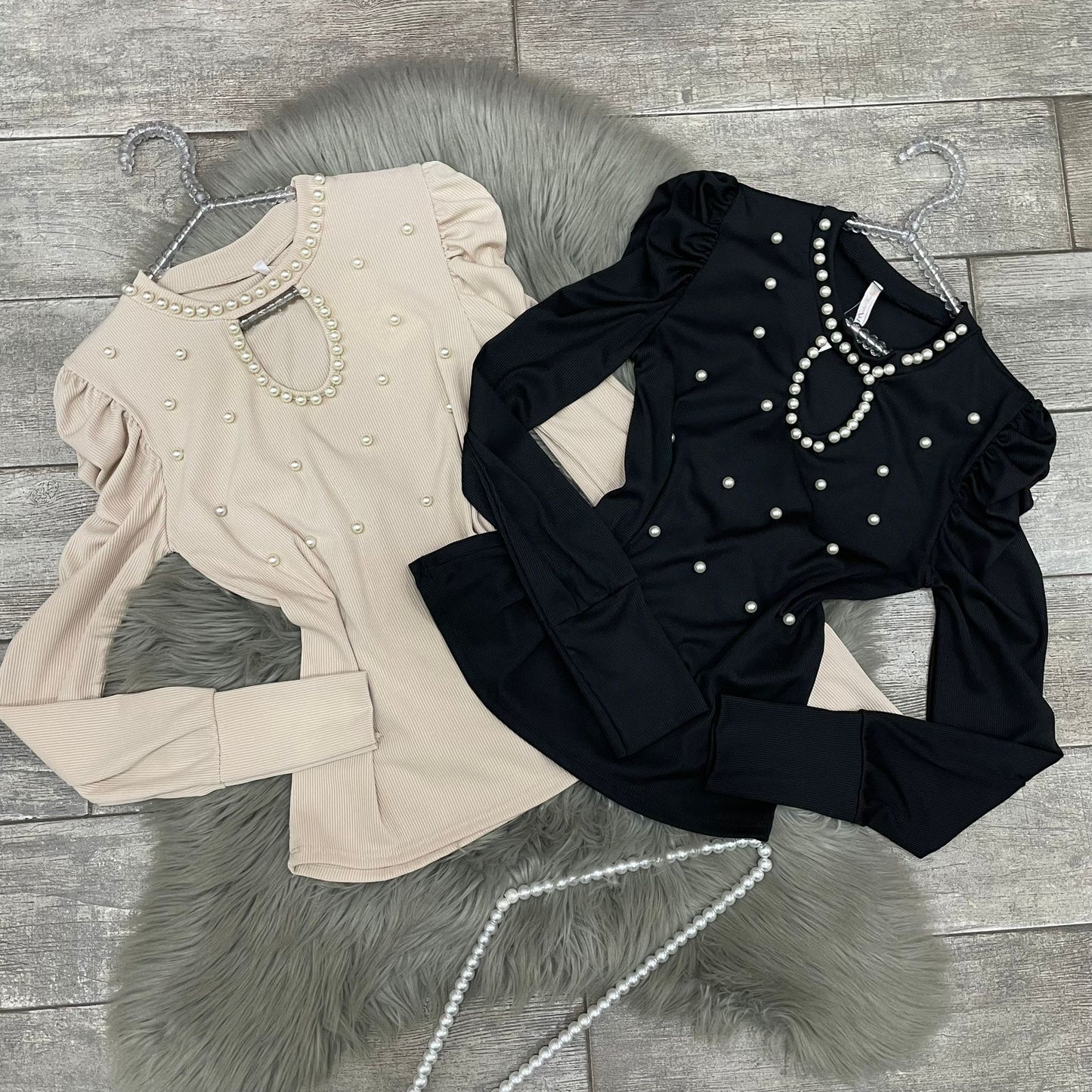 Maglia a costine in tessuto elasticizzato con applicazioni di perle in rilievo.