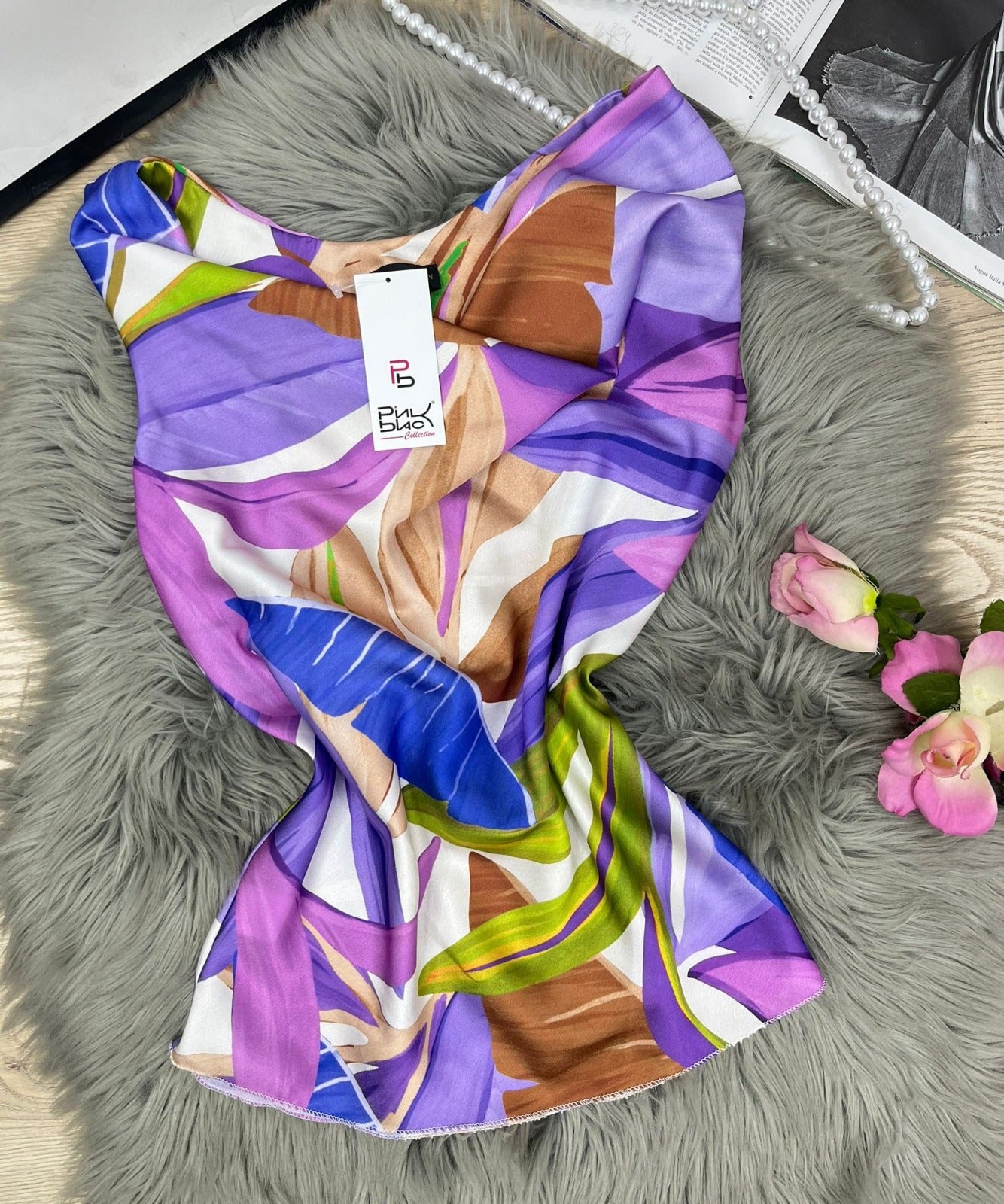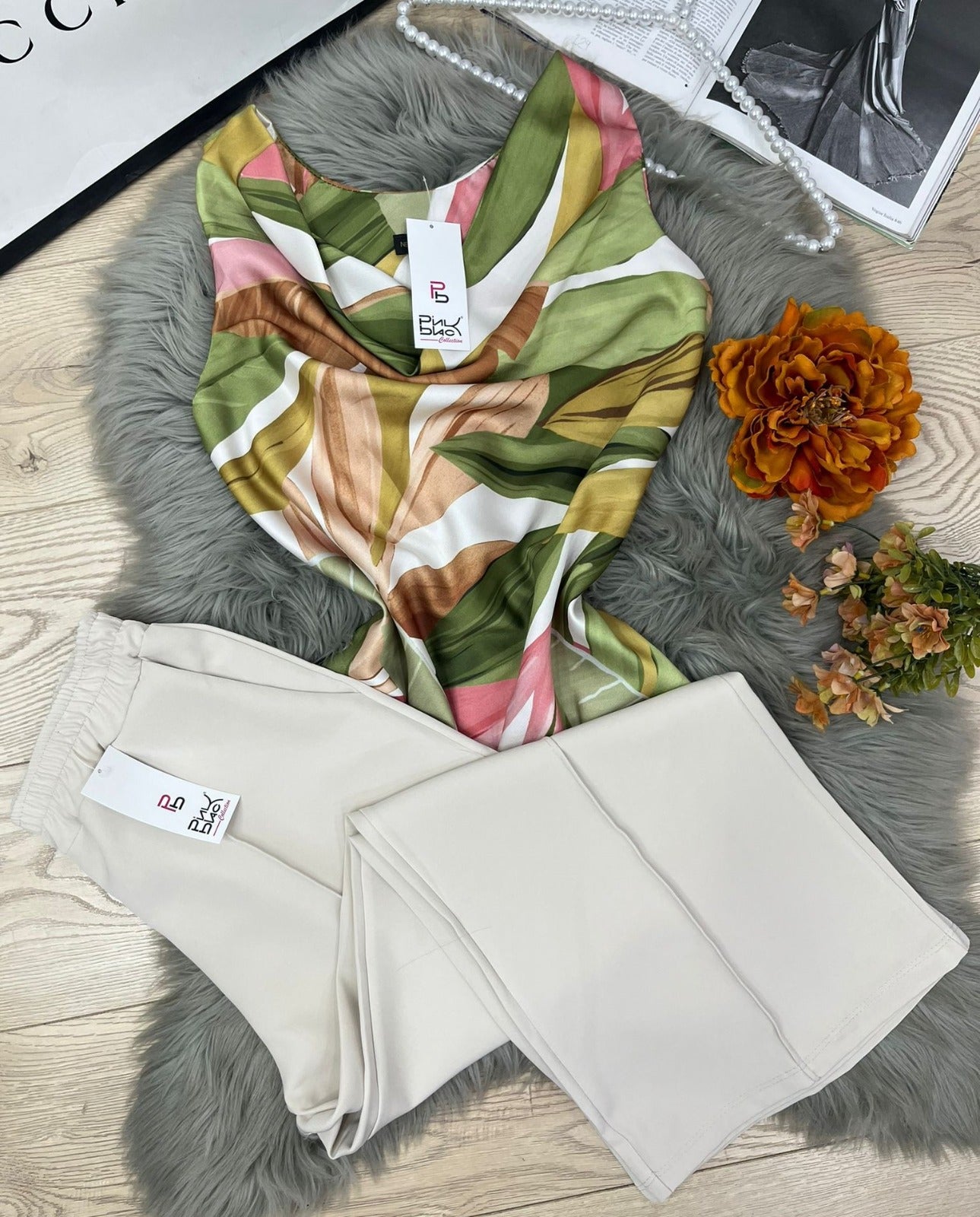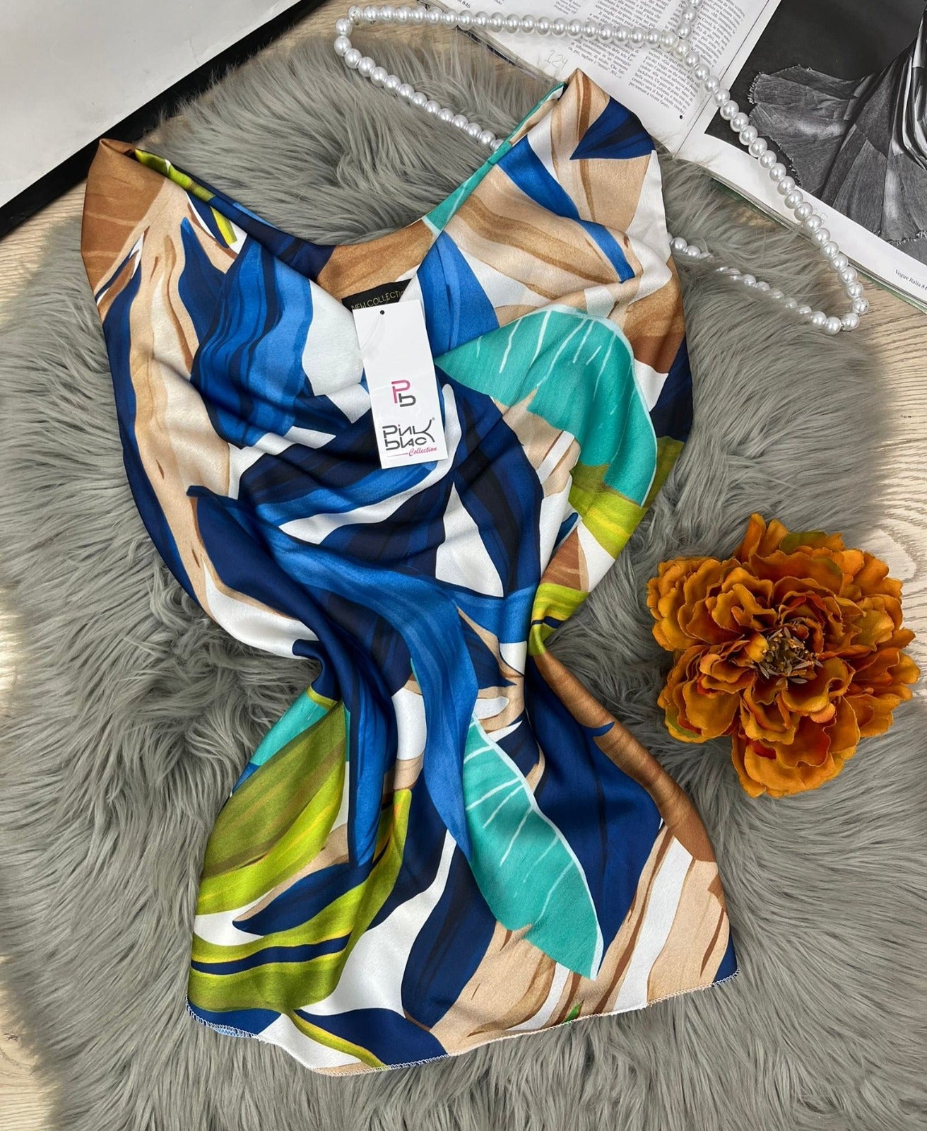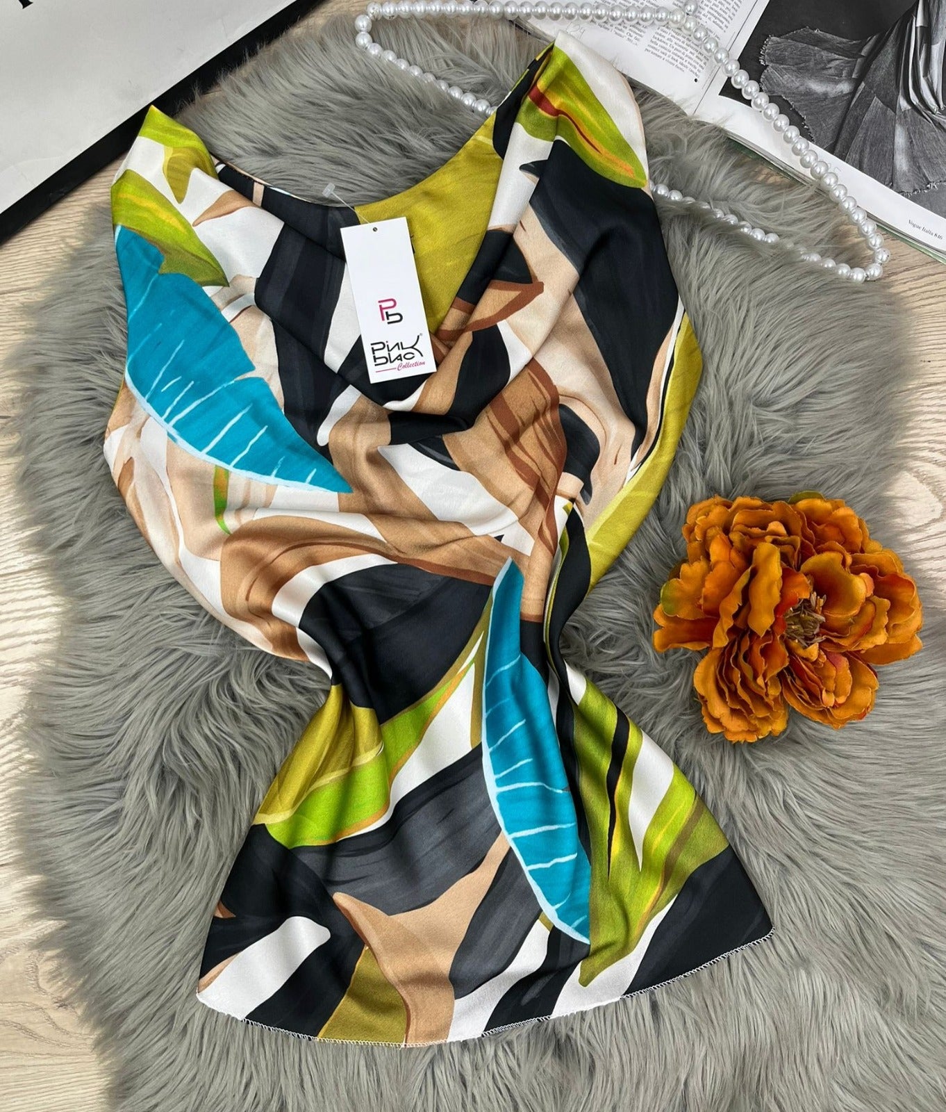 Maglia effetto raso con stampa foglie e scollo a cappuccio. Fabbricato in Italia.