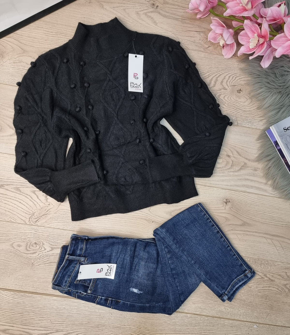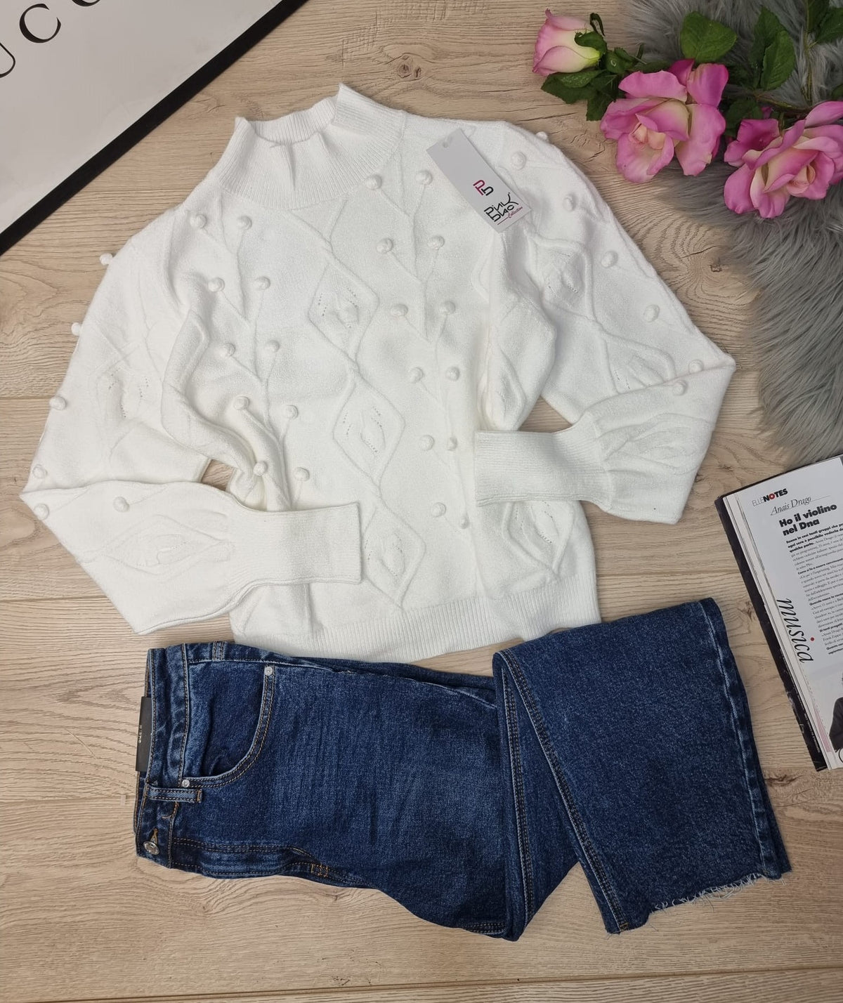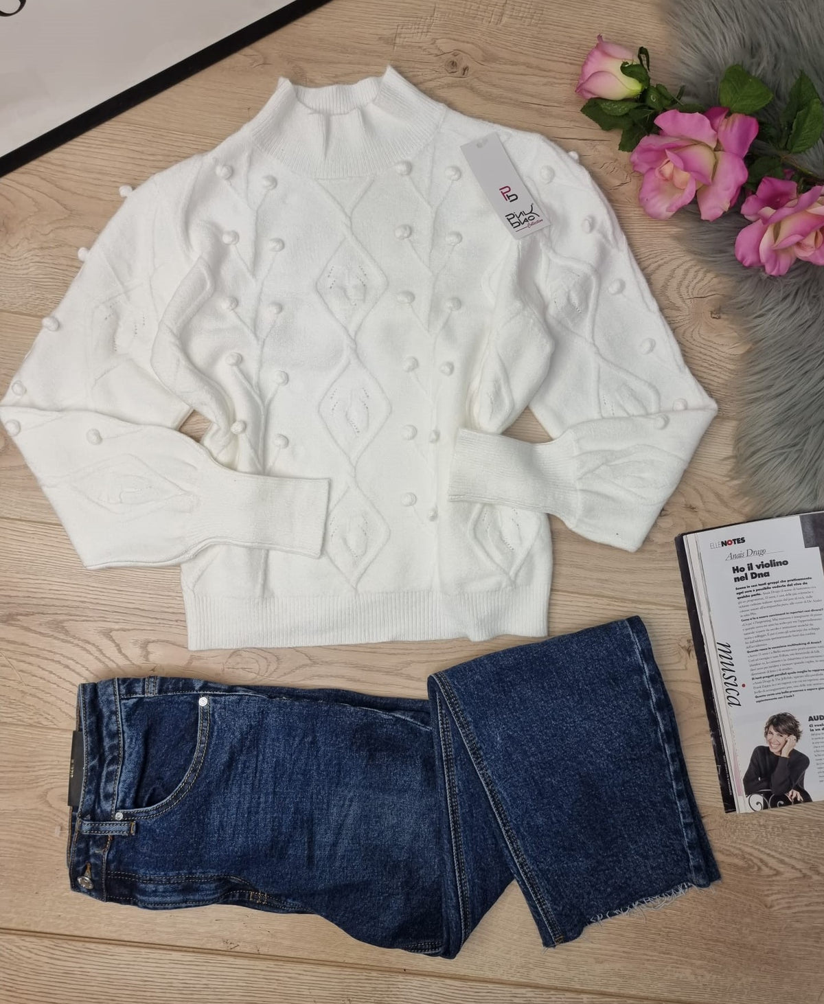 Maglioncino in viscosa, tinta unita. Taglio lento, fantasia geometrica con piccoli ponpon in rilievo ,collo alto e manica lunga. Glamour, enfatizza il mood casual con un tocco easy, per un look versatile e curato e una vestibilità ottimale e alla moda. Fabbricato all'estero.