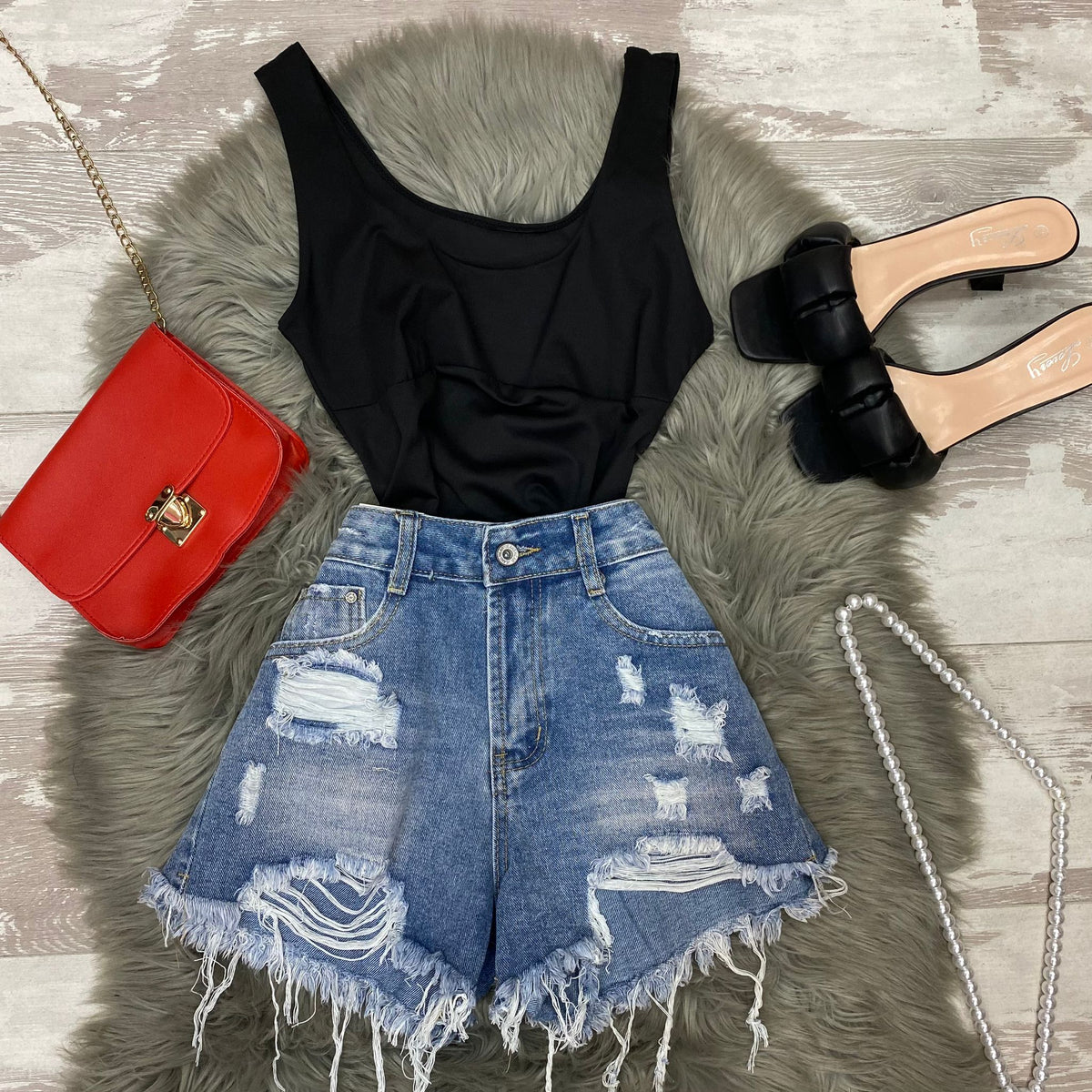 Short in denim a vita alta con strappi e orlo sfilacciato. La vestibilità delle taglie risulta regolare. Fabbricato all'estero.