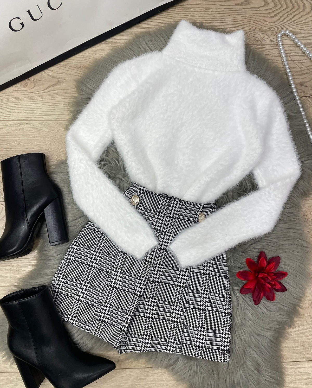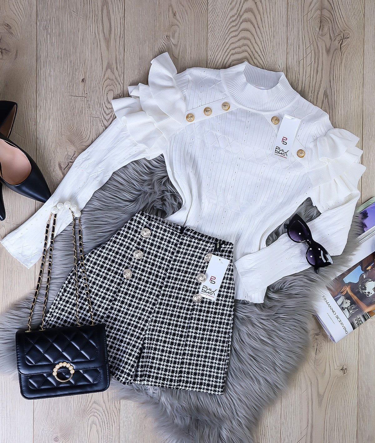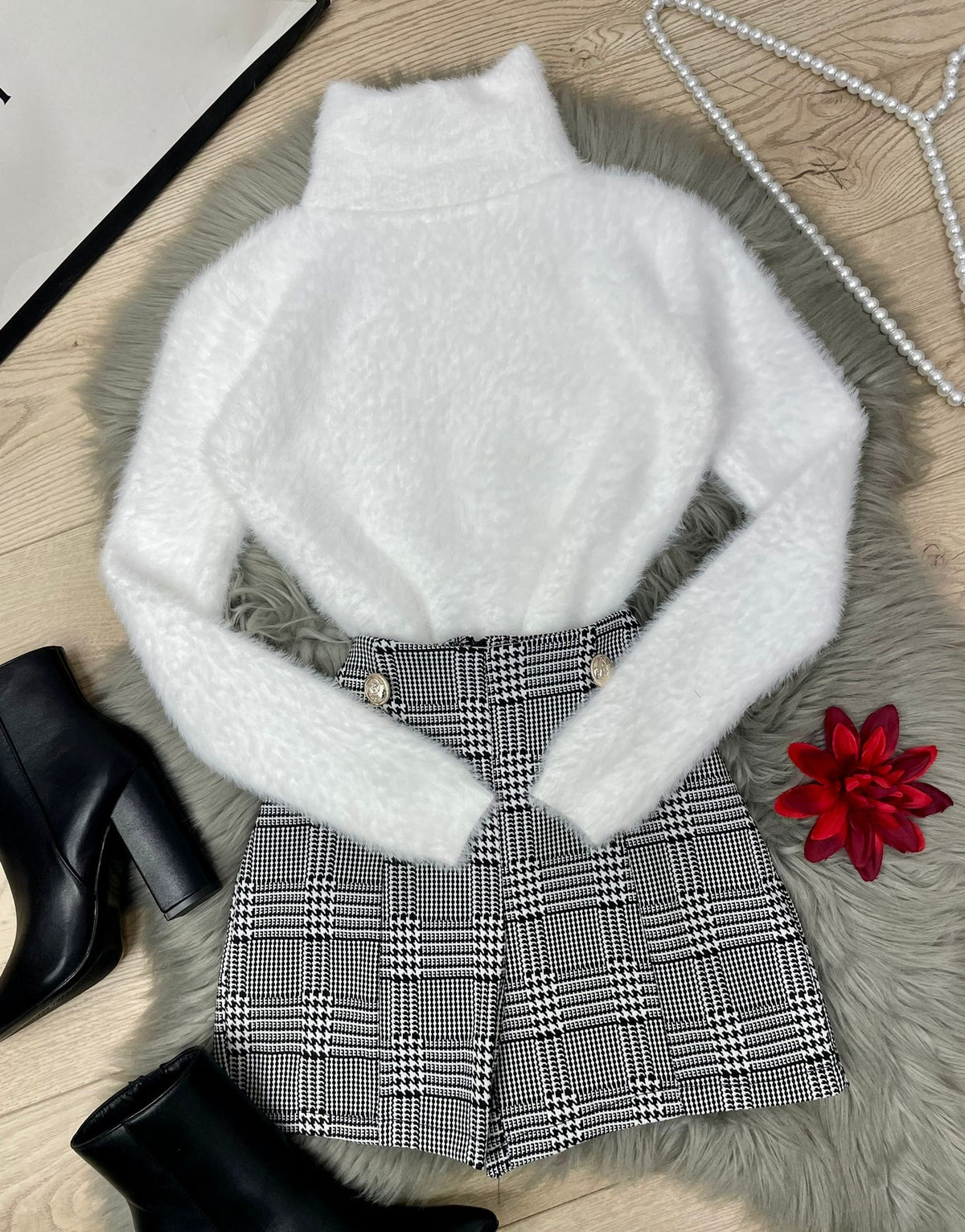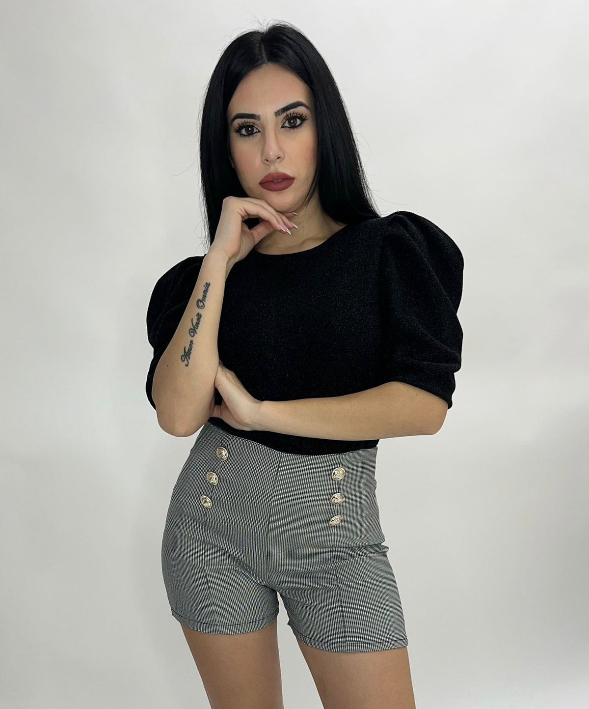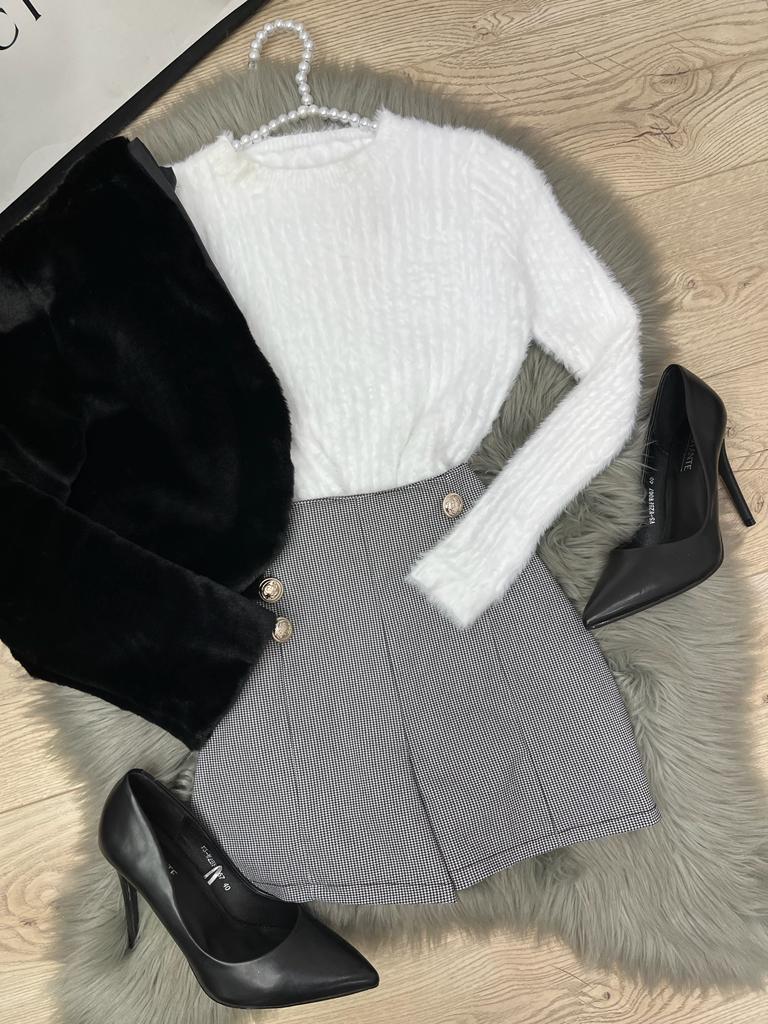 Short in tessuto scuba crepe con fantasia pied de poule, applicazione di bottoni e cerniera sul retro. La vestibilità delle taglie risulta regolare. Fabbricato in Italia.