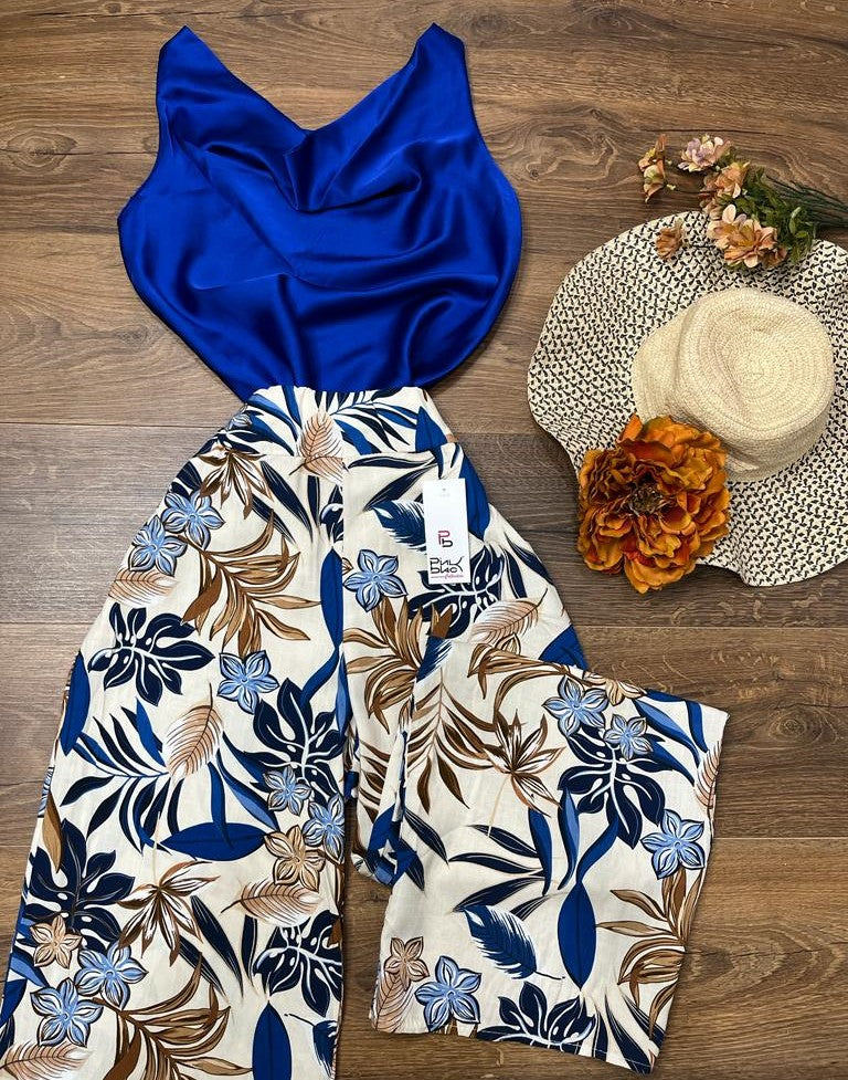 Pantalone palazzo in viscosa con fantasia floreale fascia elastica in vita e tasche. Fabbricato in Italia.