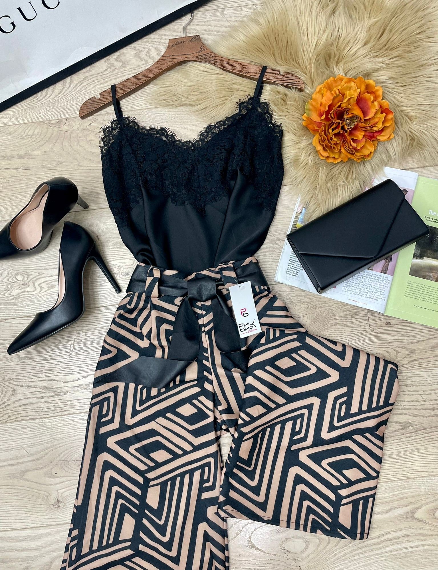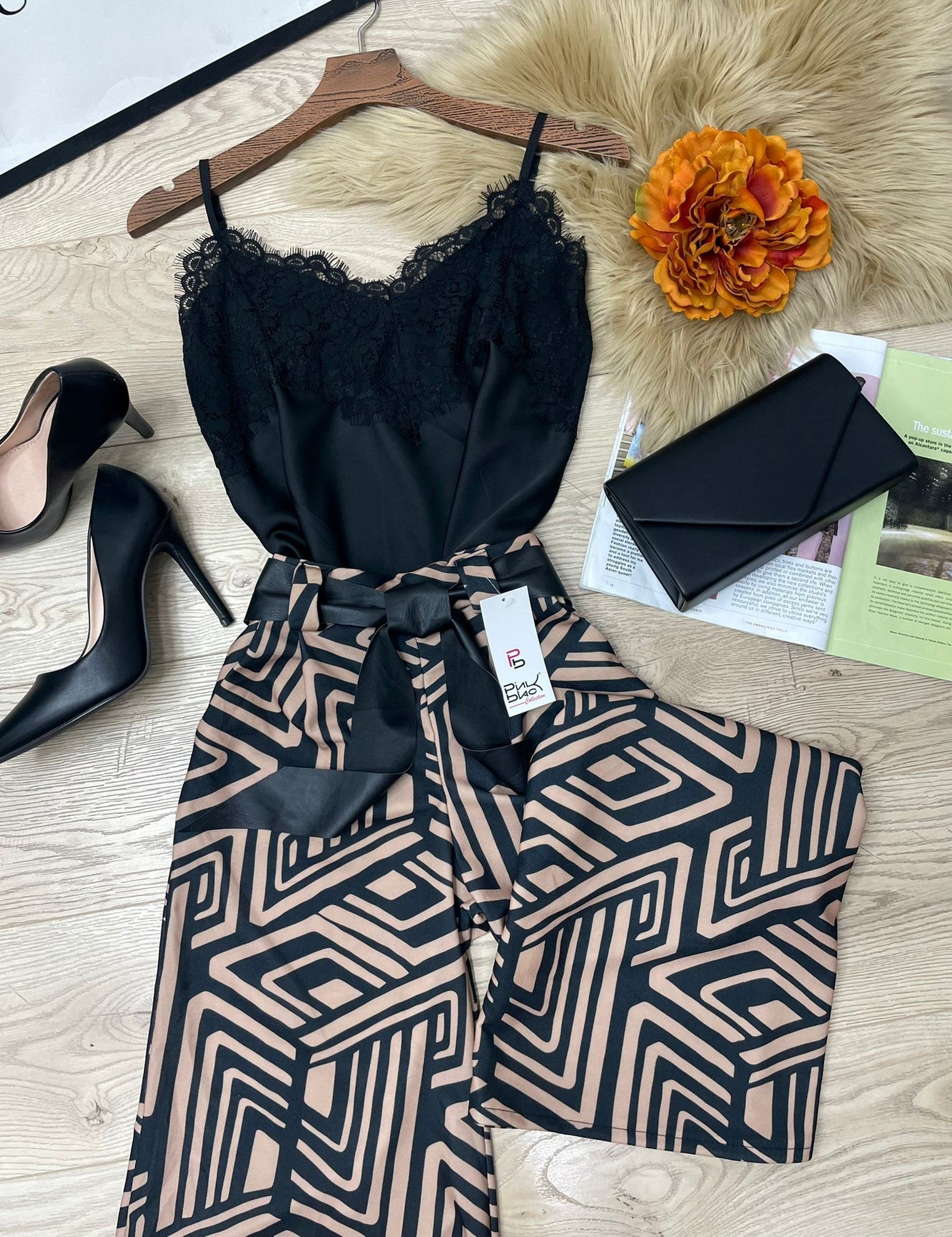 Pantalone palazzo in tessuto scuba crepe con fantasia astratta, elastico in vita, tasche e cintura inclusa. Fabbricato in Italia.
