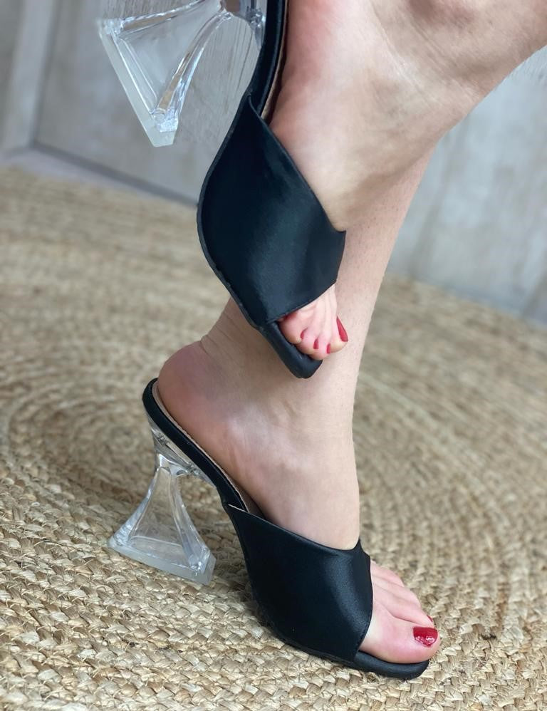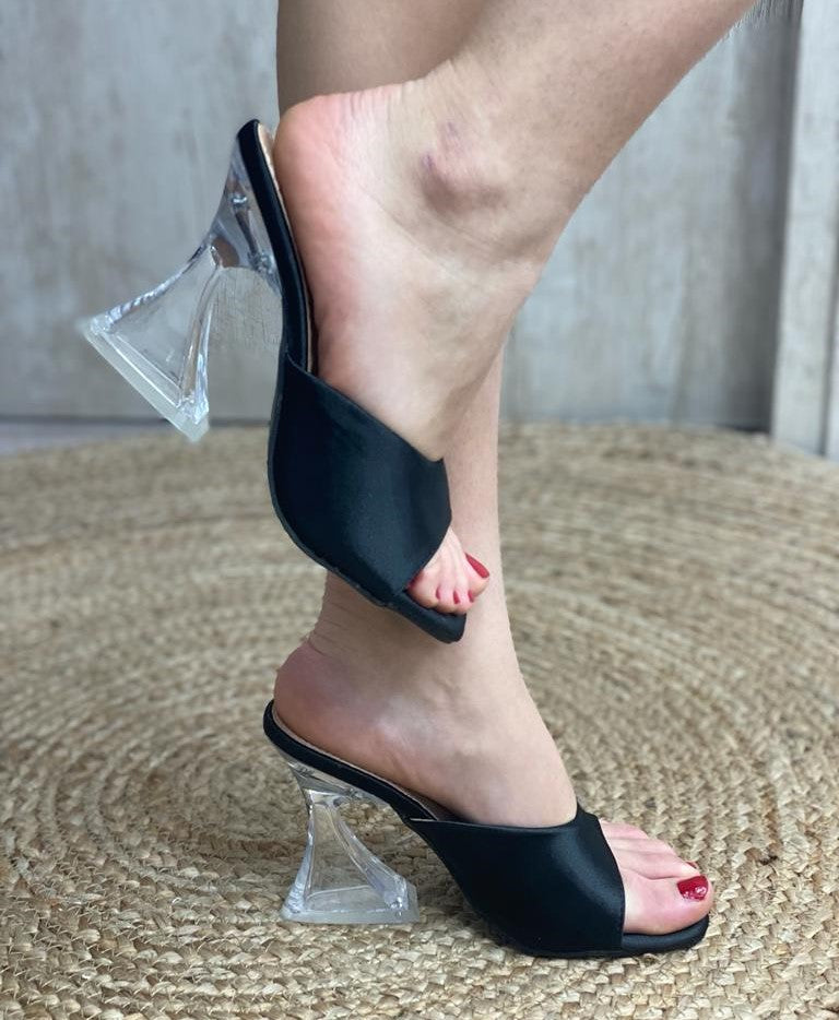 Sandalo in tessuto rasato con tacco a rocchetto trasparente.