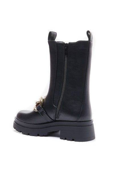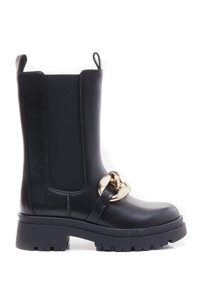 Stivaletto in ecopelle con inserto elasticizzato e applicazione di catena ad anelli.