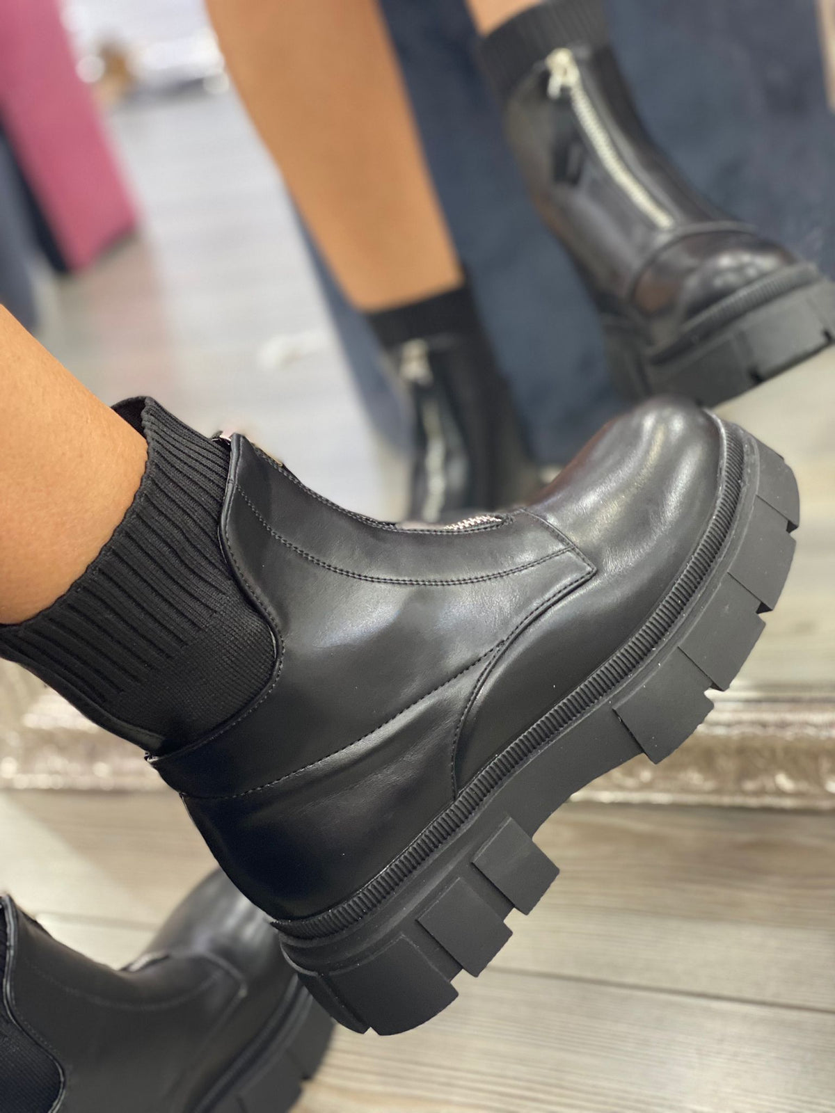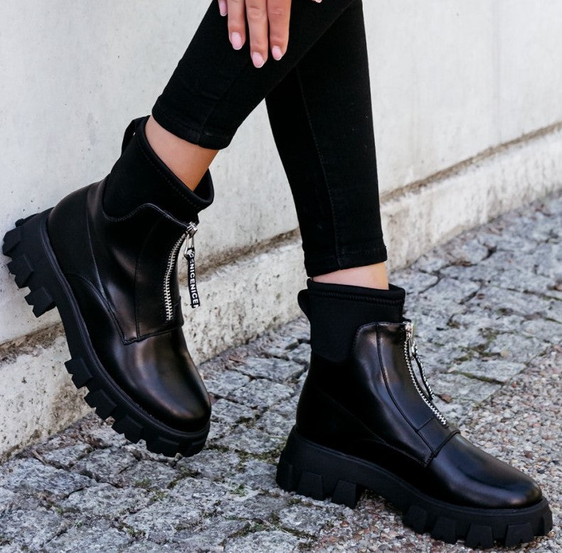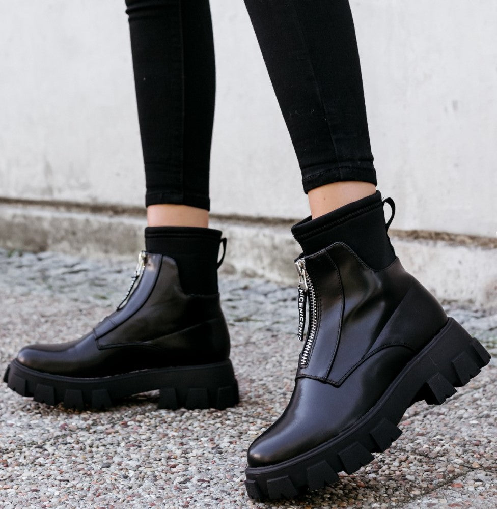 Stivaletto in ecopelle con tessuto a costina, cerniera e suola a carrarmato.