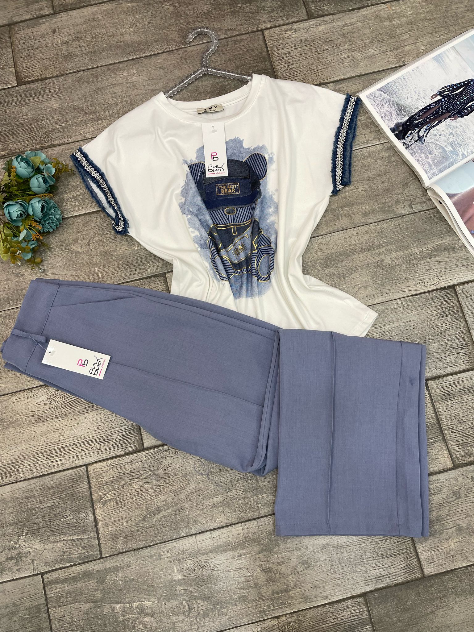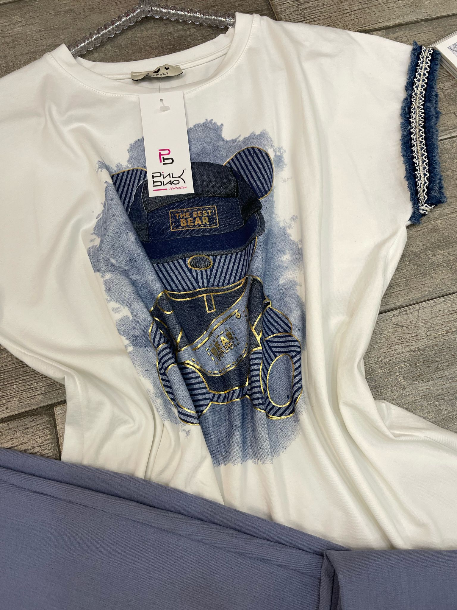T-shirt con stampa orso effetto jeans e scritta ricamata.