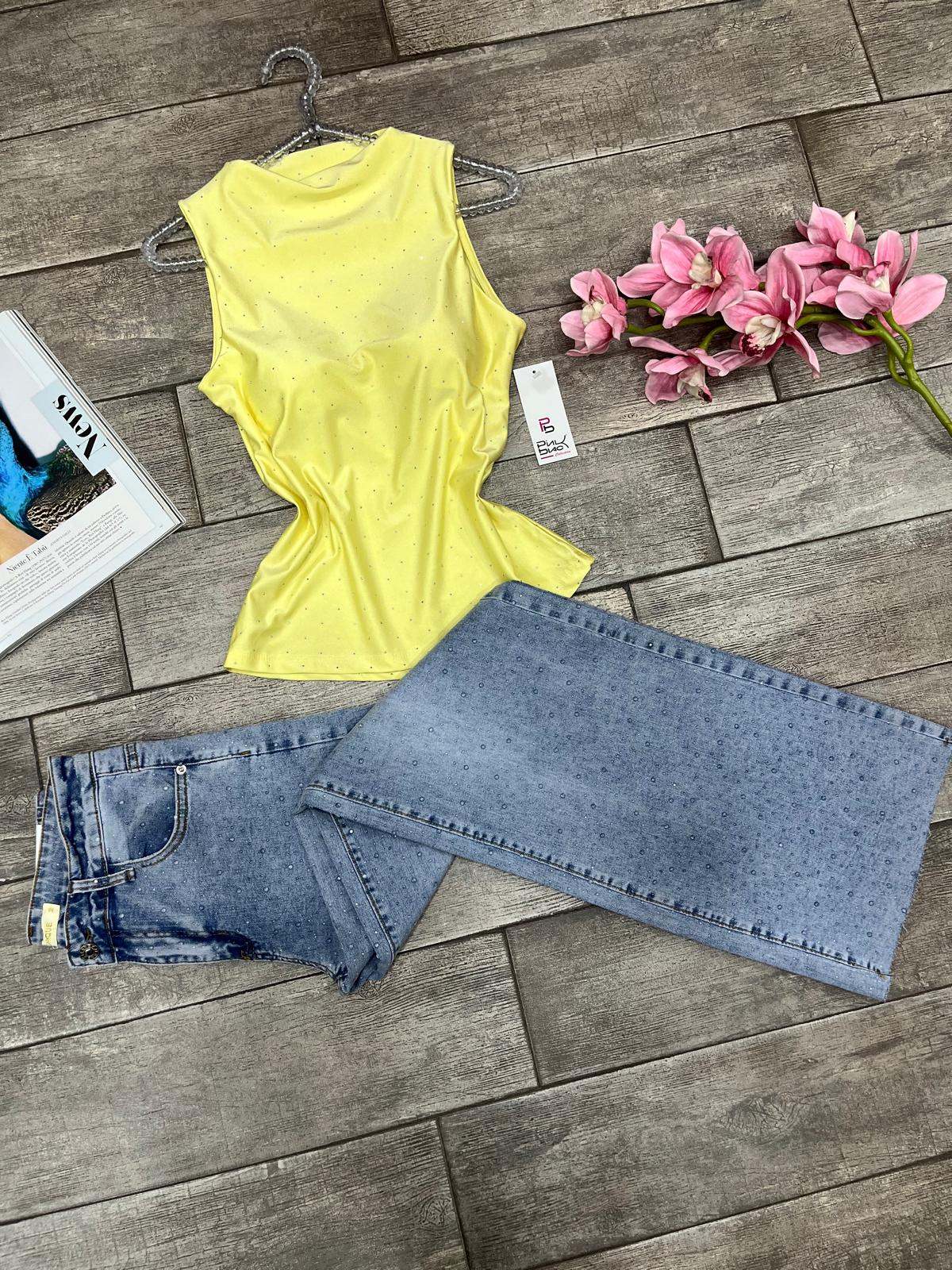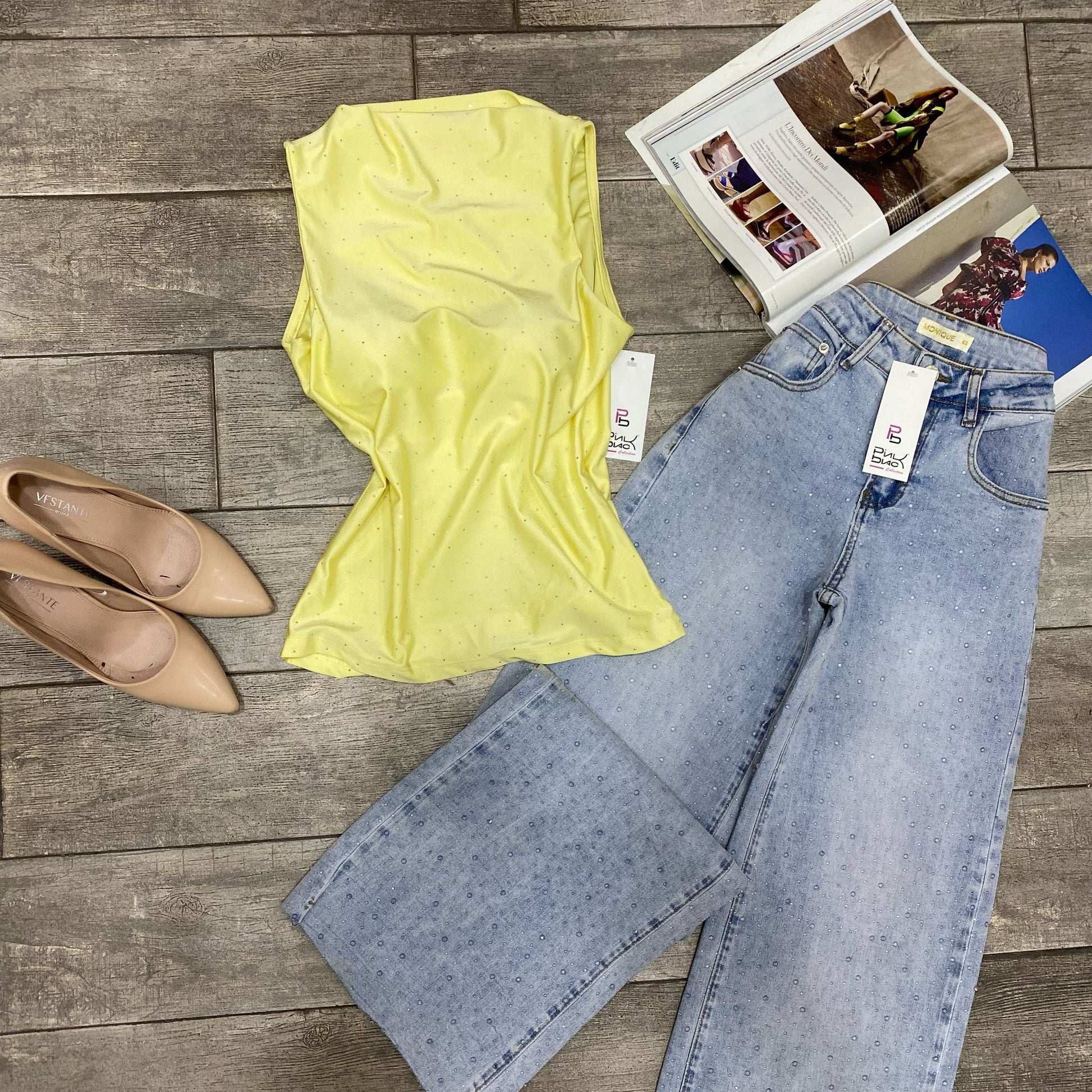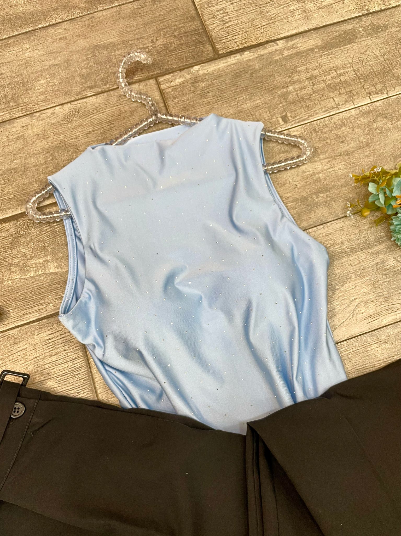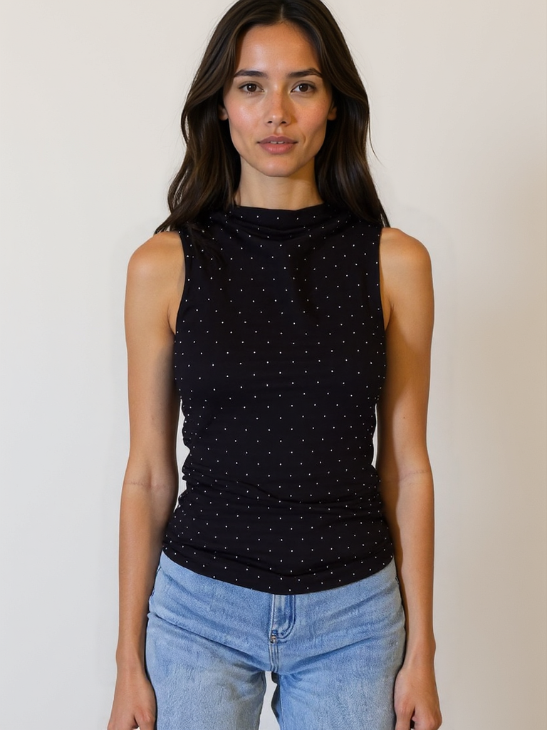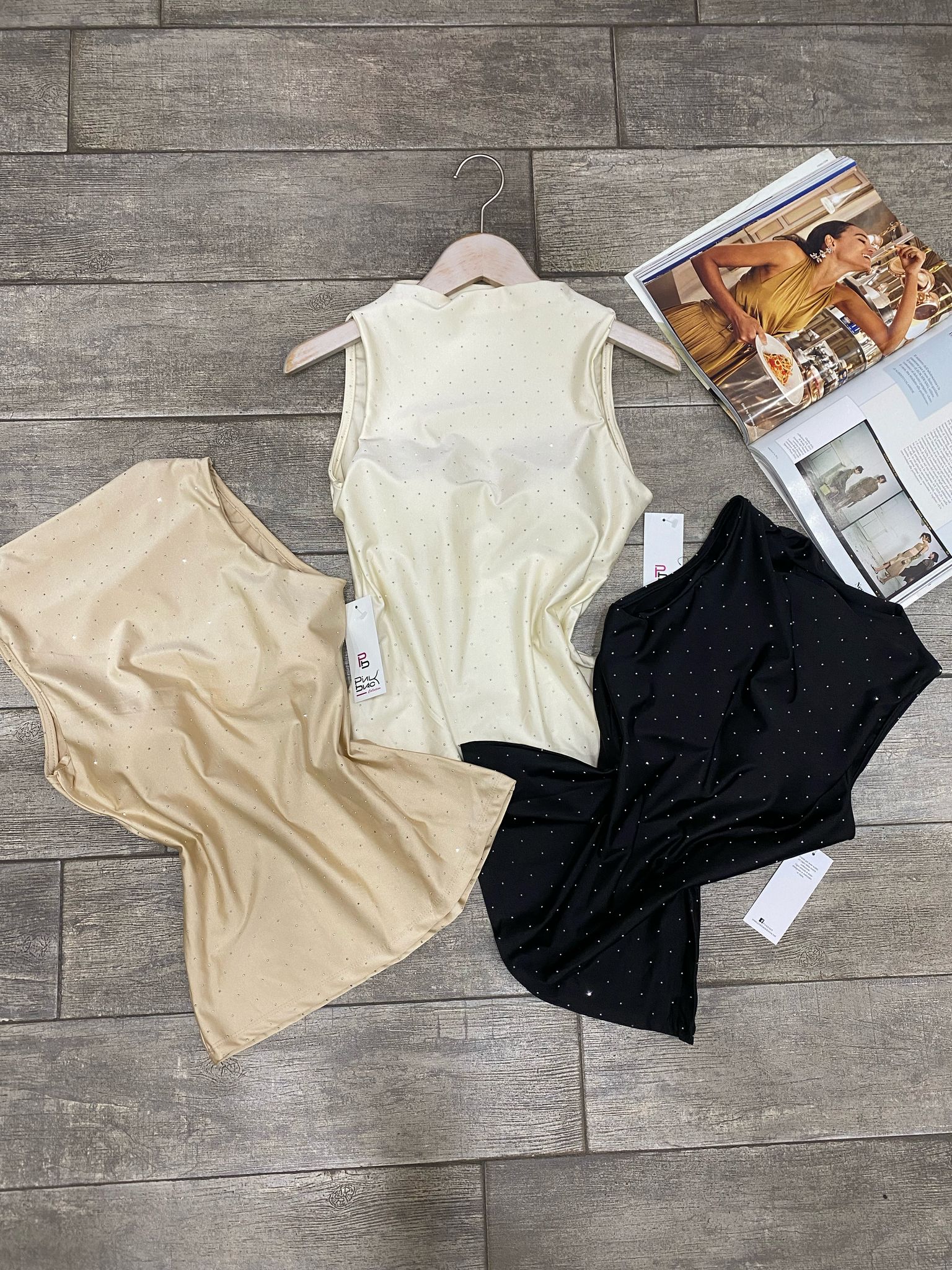 Top effetto lycra con brillantini in rilievo e coppe preformate