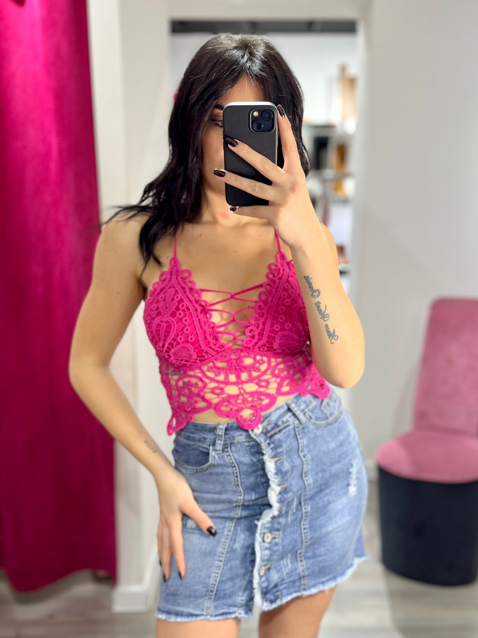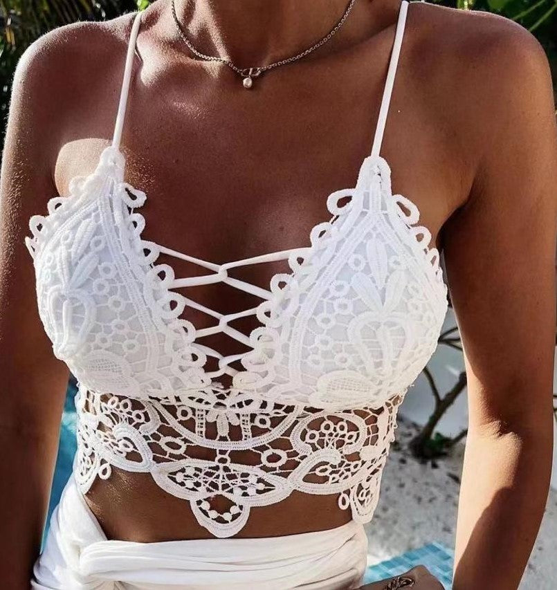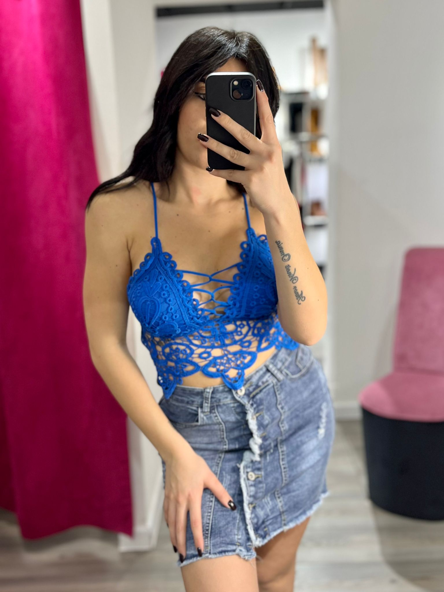 Top in macramè con coppe preformate e spalline ad incrocio. Fabbricato all'estero.