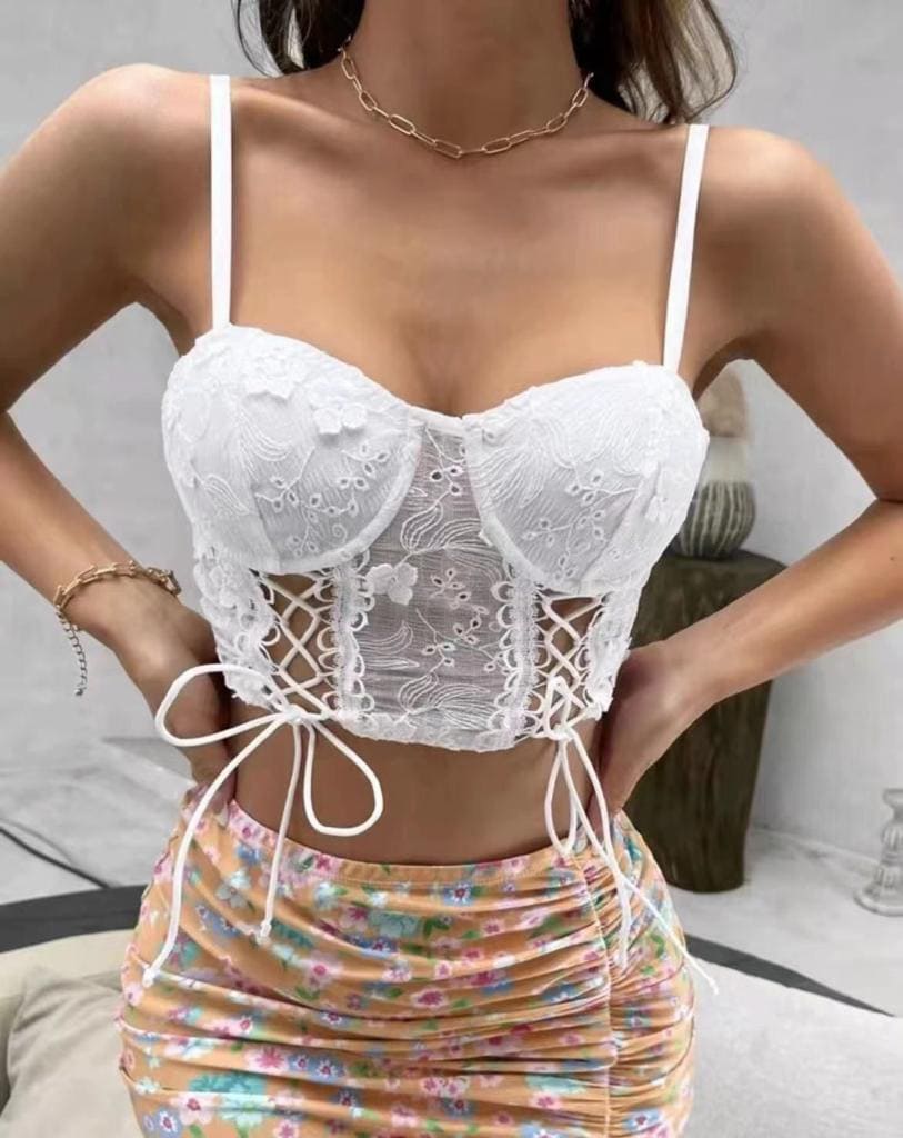 Top con ricamo floreale in rilievo, coppe preformate, spalline regolabili e fascia elastica sul retro. Fabbricato all'estero.