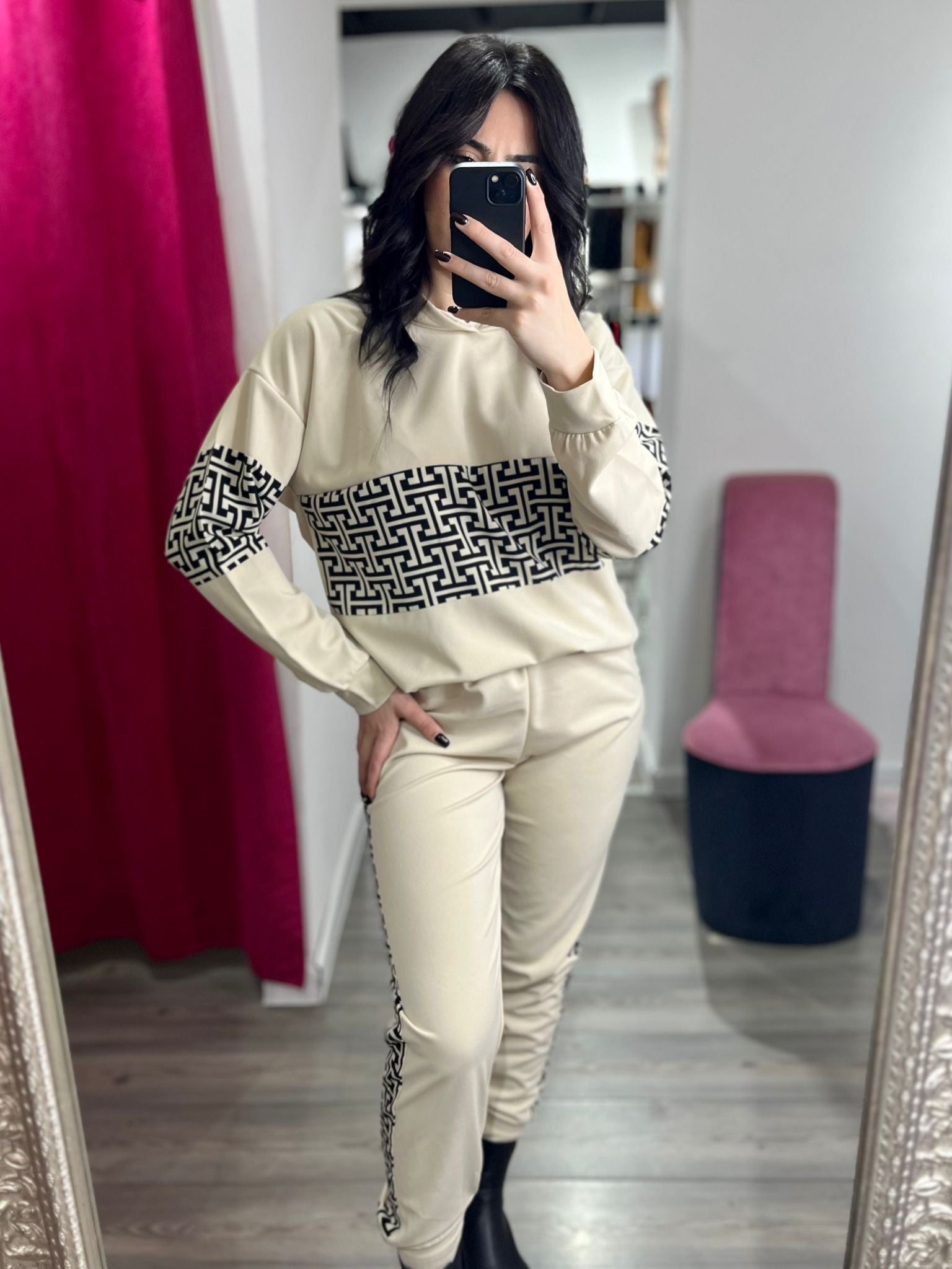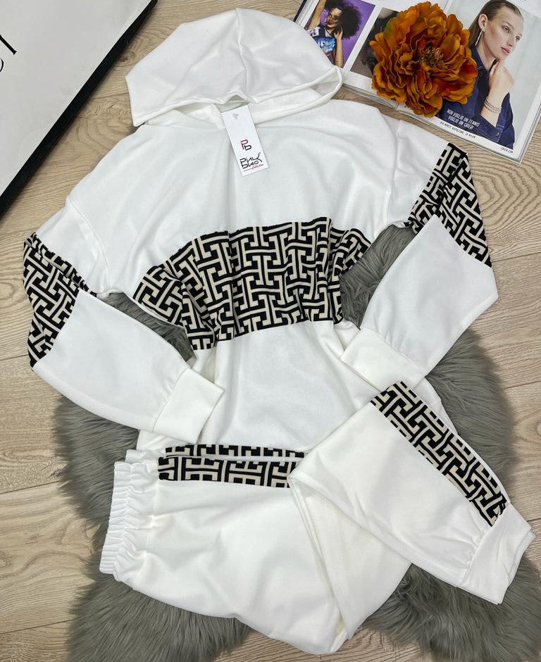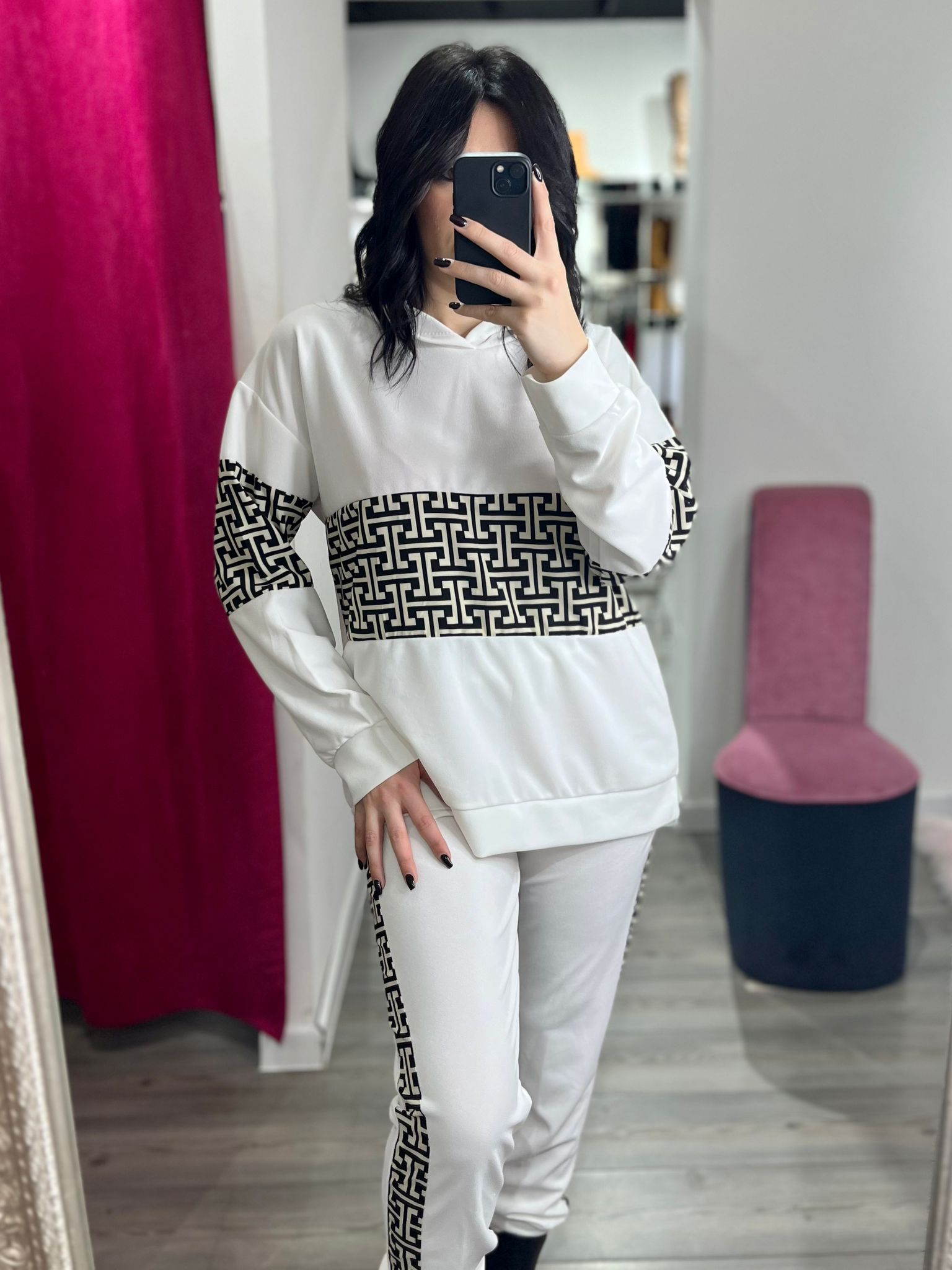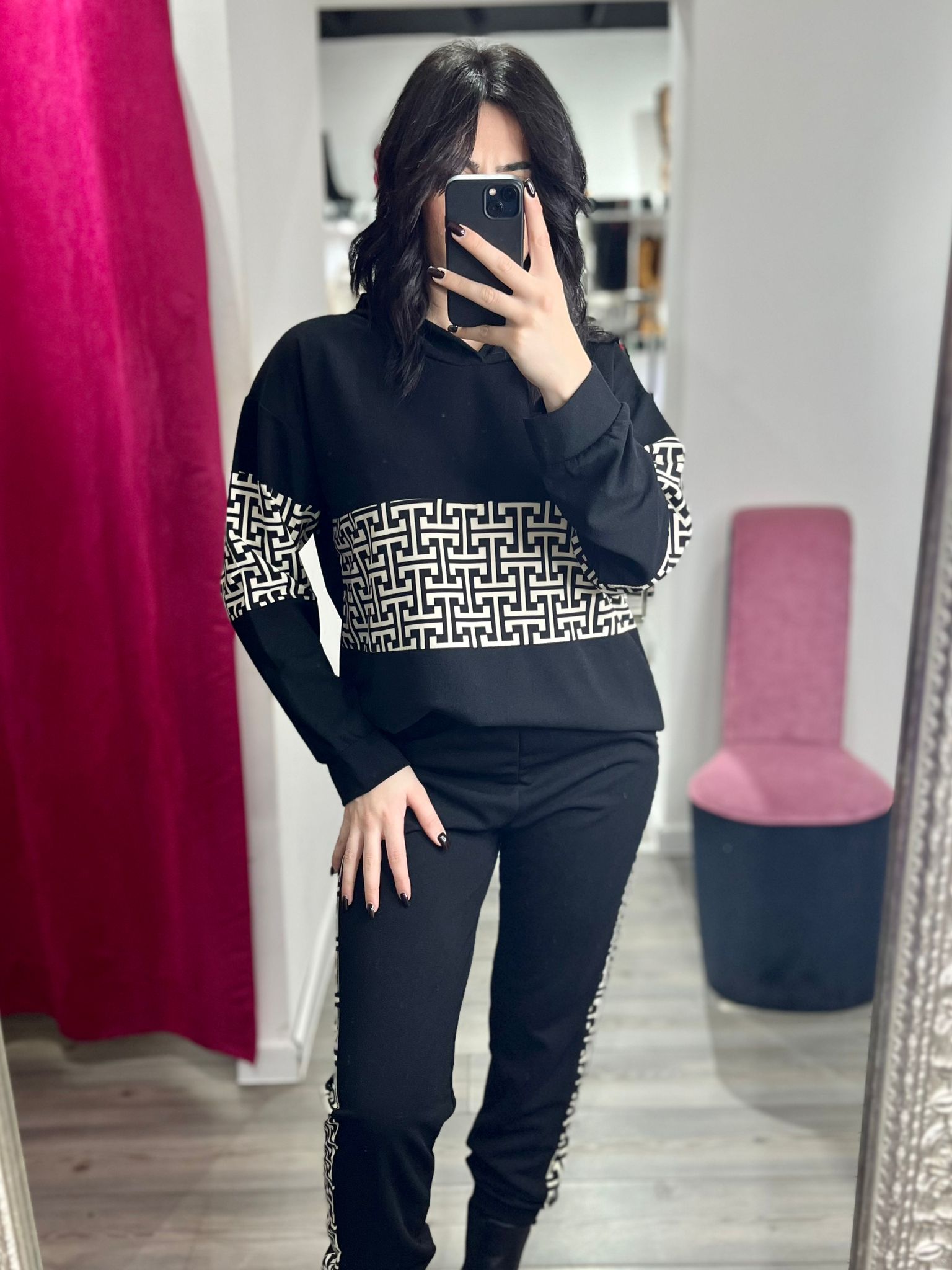 Completo felpa -pantalone in tessuto scuba crepe a fantasia. Felpa con cappuccio e pantalone con elastico in vita. Fabbricato in Italia.
